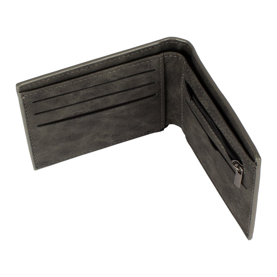 Billetera de Eco-Cuero "GEORGIA" (SKU B37) para regalos corporativos y campañas de empresa. Compatible con estrategias de regalos corporativos, incluyendo soluciones en textil, sublimación y DTF. Billetera de eco-cuero, modelo "GEORGIA". Contiene 6 compartimentos interiores, uno de ellos con cremallera. Presentación en bolsa frozen y caja de cartón forrado negro opaco. •Tamaño: 11 x 8.5 x 1.5 cm. (cerrada) / 21.7 x 8.5 x 0.5 cm. (abierta) / 12.9 x 10.3 x 2.3 cm. (caja) •Colores: Gris oscuro jaspeado (08), Café jaspeado (10) •Sugerencia de Impresión: Serigrafía, Cuño Seco, Grabado láser. •Presentación: Bolsa plástica frozen + caja de regalo de cartón negro •Material: Eco-Cuero Cotiza formato corporativo con personalización de logo y cobertura en Chile.