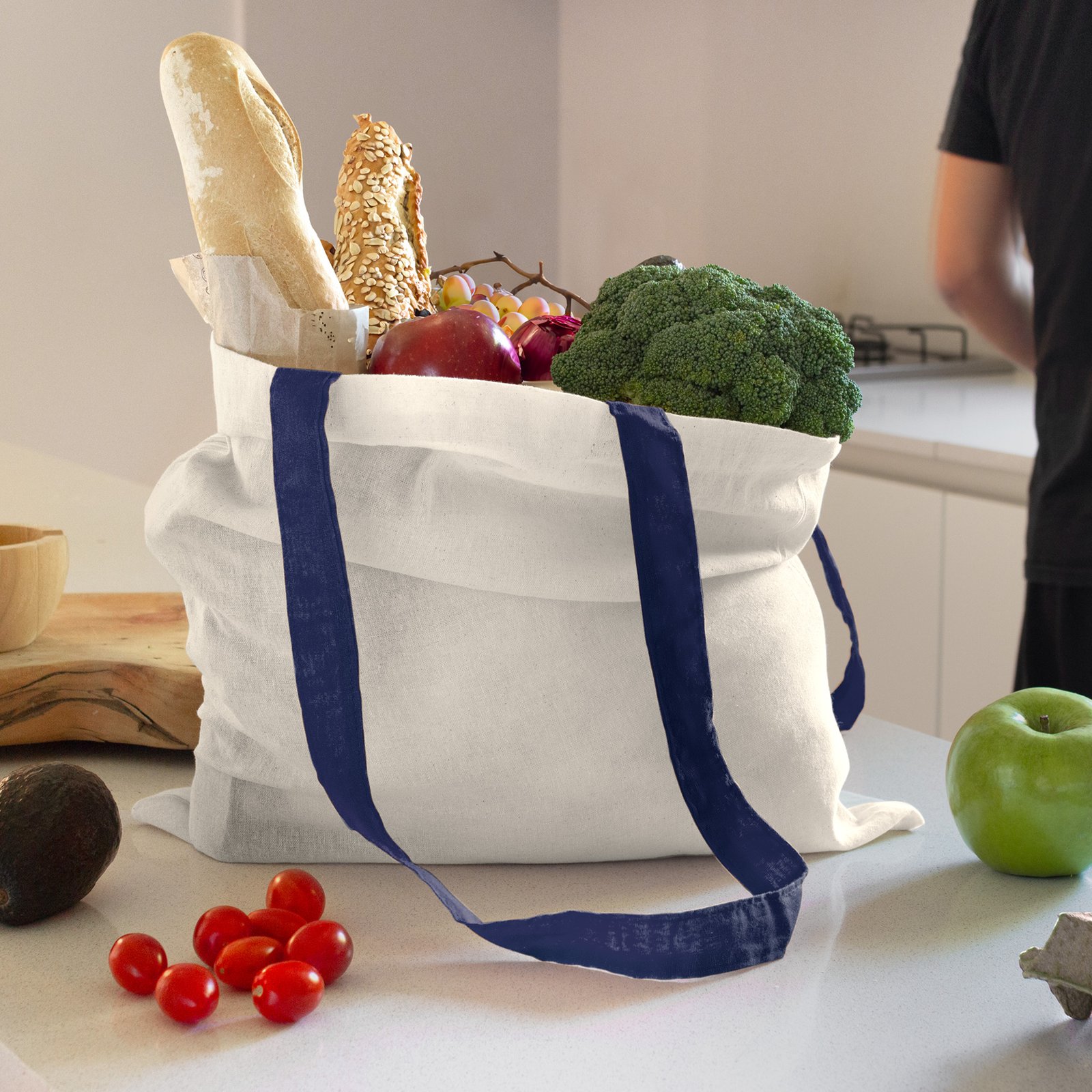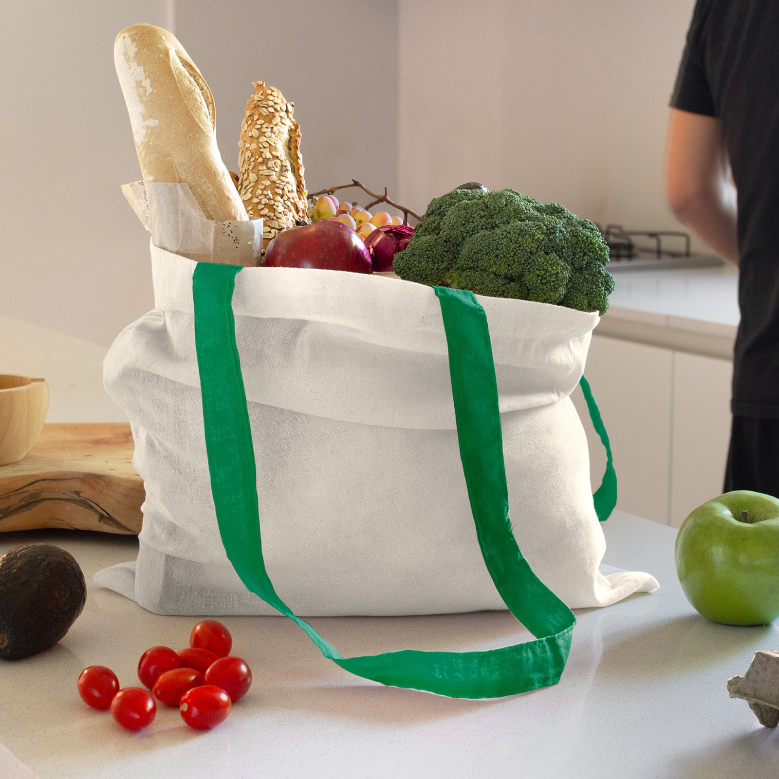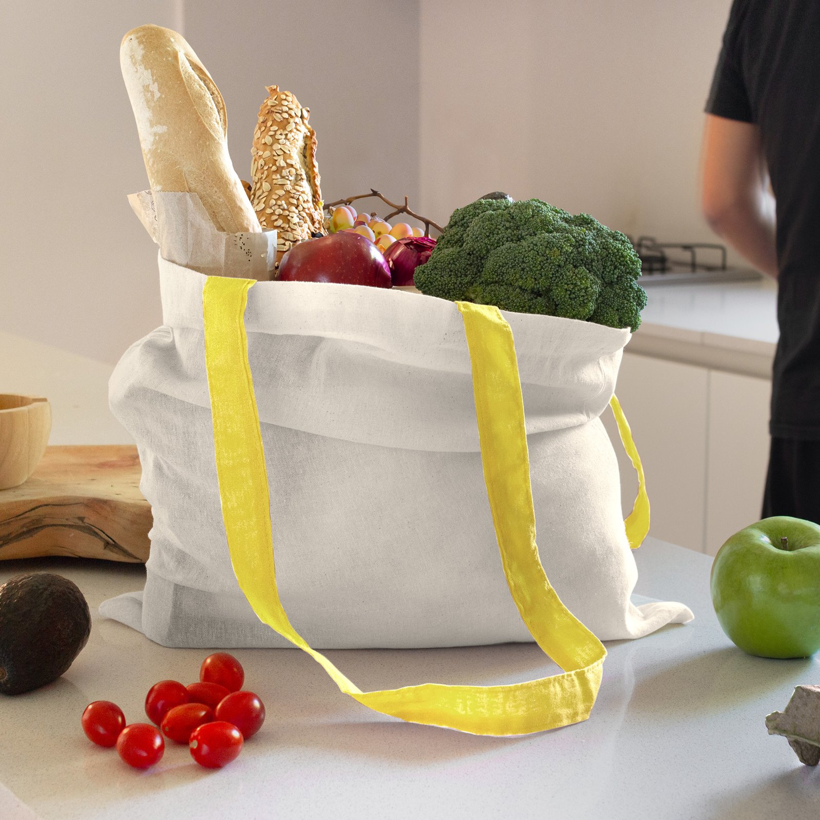 Bolsa de algodón "DONNA" (SKU C574) para regalos corporativos y campañas de empresa. Compatible con estrategias de regalos corporativos, incluyendo soluciones en textil, sublimación y DTF. Estilo en tus compras.Bolsa reutilizable color natural con manijas de diferentes colores. Manijas cosidas de 70cm x 2,5 cm.Medidas: 38 x 42 cm. Materiales: 100% Algodón. Peso: 50 g. aprox. (bolsa individual) y 105 g/m2 Cotiza formato corporativo con personalización de logo y cobertura en Chile.