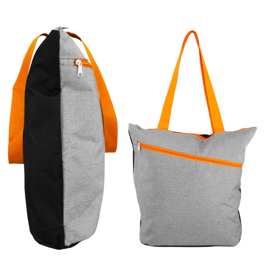 Bolso de Compra "Oxford" (SKU D47) para regalos corporativos y campañas de empresa. Prioridad comercial en líneas de textil, sublimación y DTF para branding corporativo. Bolso de compra modelo "Oxford", en tela Poliéster 300D/PVC gris jaspeado, mangos y cierres de color. Incluye bolsillo delantero. Reverso negro en tela poliéster 600D. • Tamaño: 38 x 40 x 12 cm. aprox. • Colores:Gris/Azul (02), Gris/Rojo (03), Gris/Naranjo (04), Gris/Negro (08). • Sugerencia: Serigrafía, Bordado. • Capacidad: 21 litros aprox. • Material: Poliéster 300D/PVC, Poliéster 600D Cotiza formato corporativo con personalización de logo y cobertura en Chile.