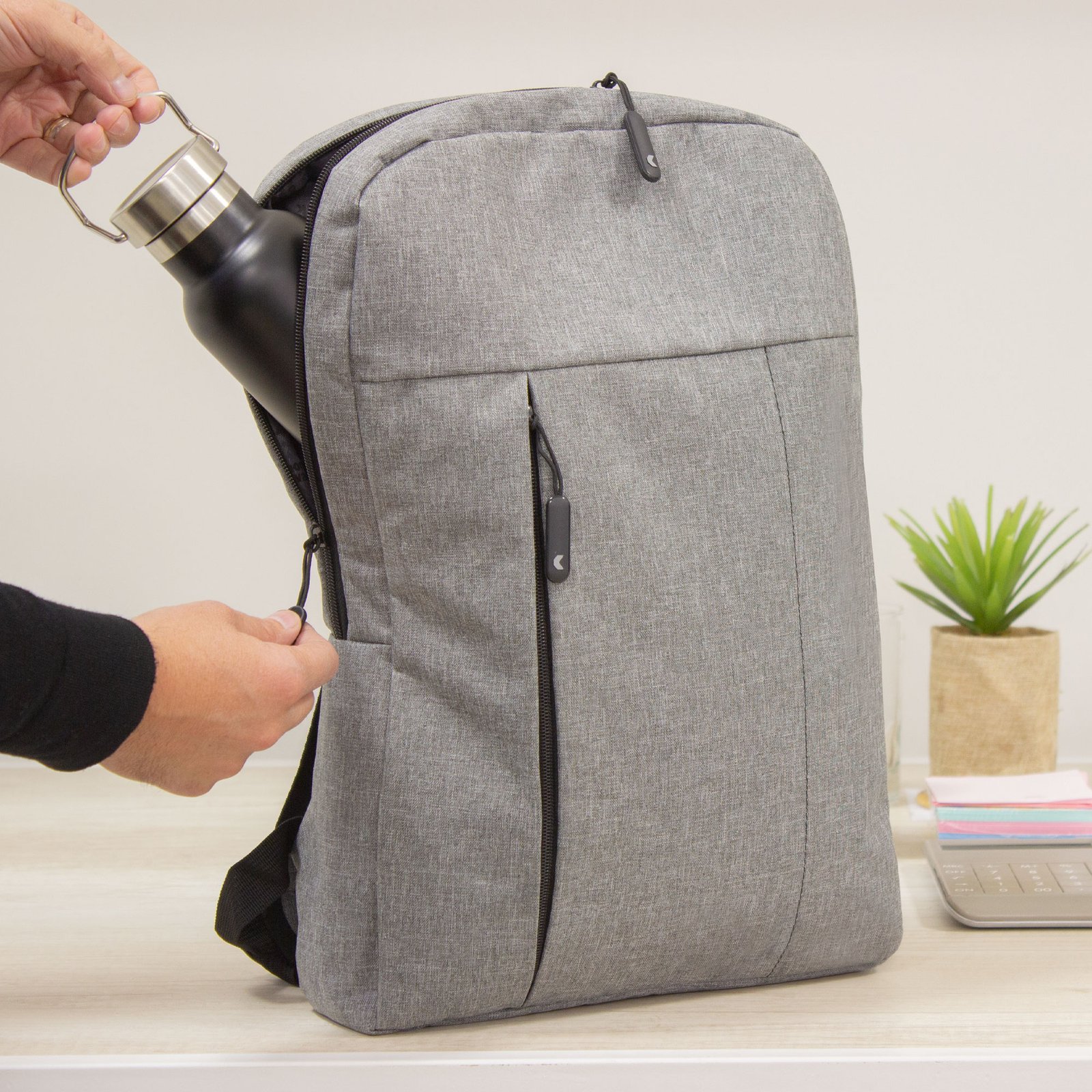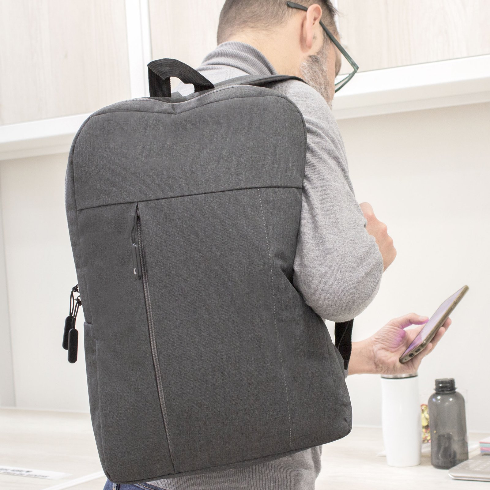 MOCHILA "CITY" (SKU K6) para regalos corporativos y campañas de empresa. Compatible con estrategias de regalos corporativos, incluyendo soluciones en textil, sublimación y DTF. 30 x 44 x 8 cm. Capacidad 11 litros. Poliéster 300D . Mochila Portanotebook hasta 16'. Compartimento principal con cierre y bolsillo frontal con cierre lateral y detalle de costura vertical. En el interior posee un compartimento acolchado para notebook y un bolsillo adicional para tablet. Tiradores de cierre engomados. Presencia de marca en su interior y en una de sus correas. Cotiza formato corporativo con personalización de logo y cobertura en Chile.