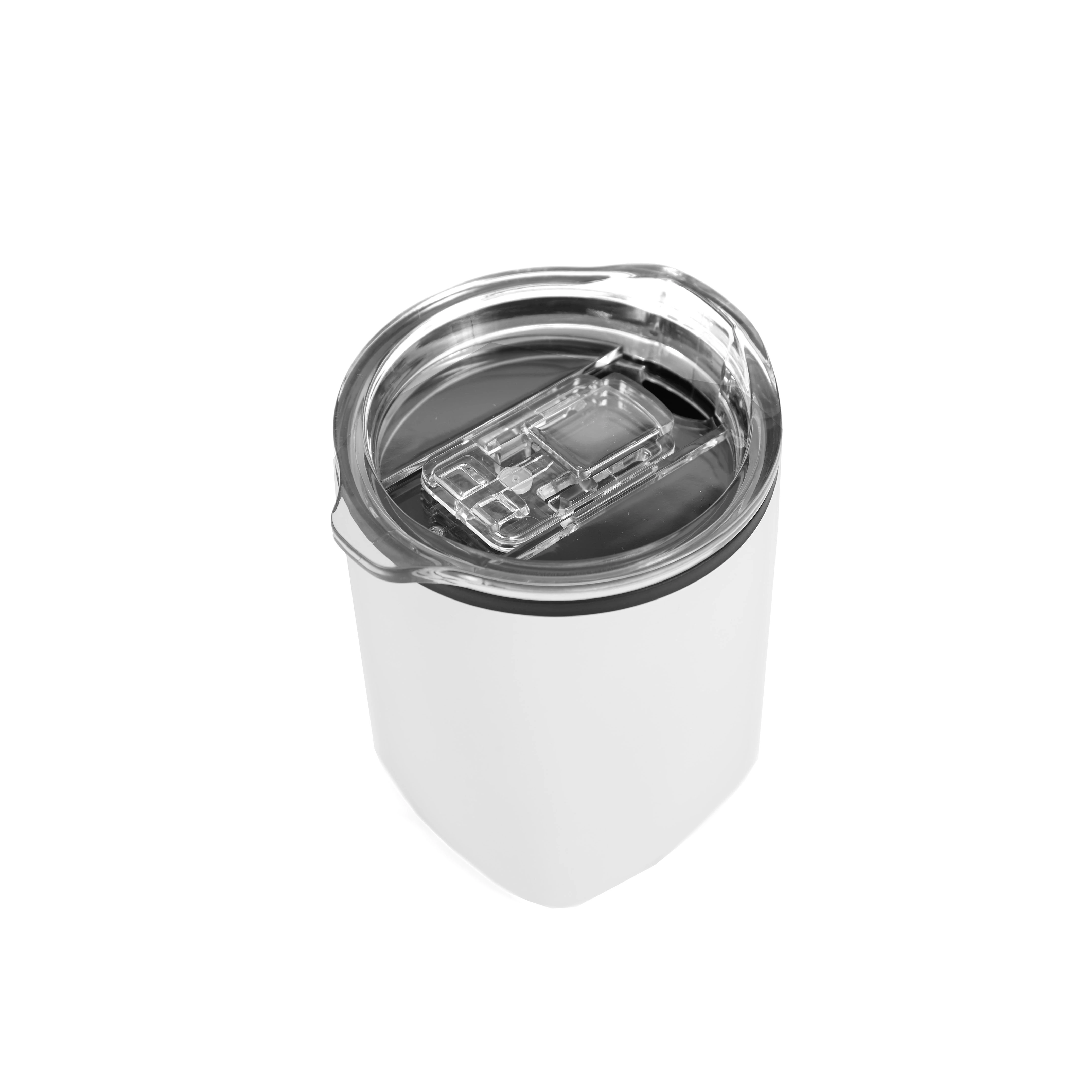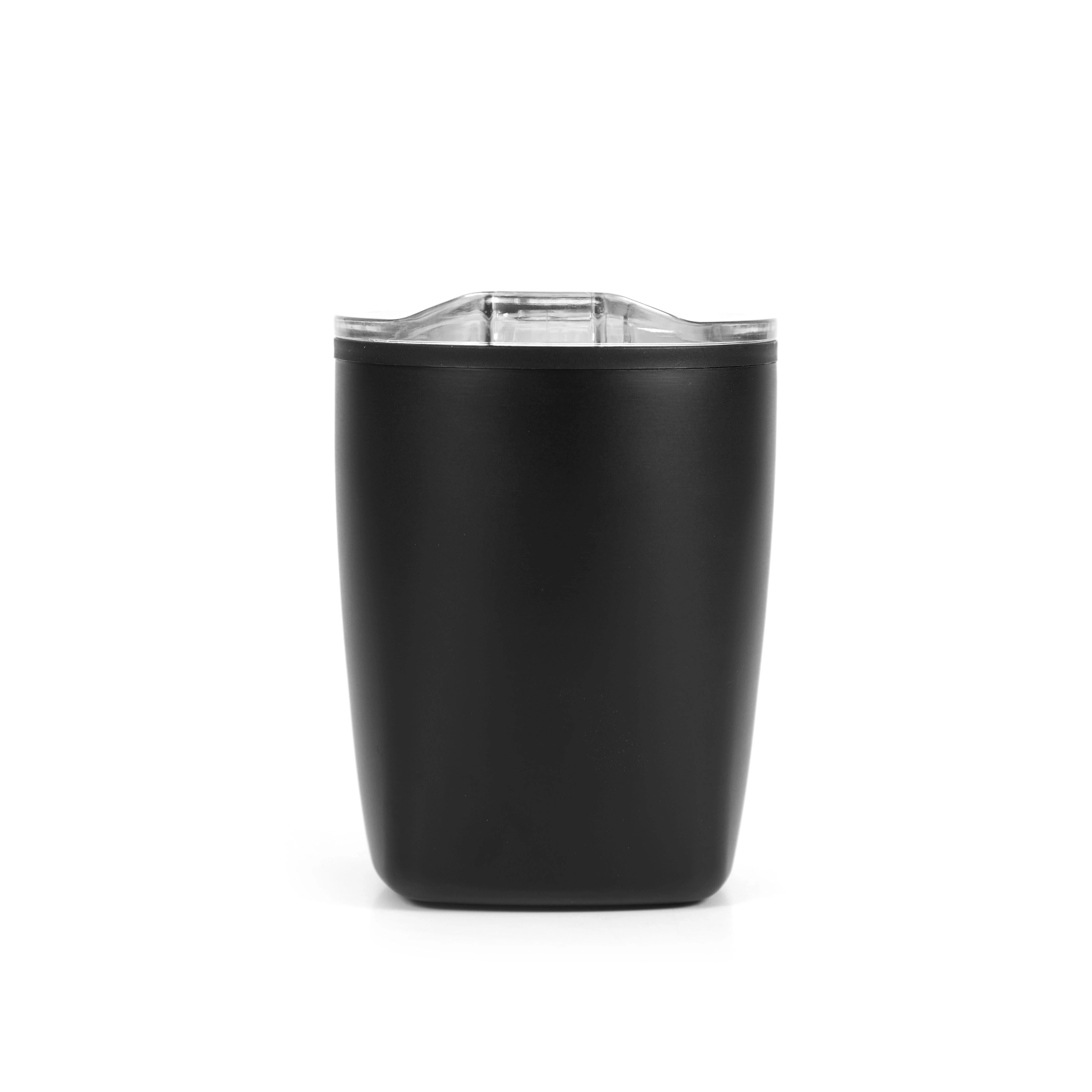 Mug Bogota (SKU 103) para regalos corporativos y campañas de empresa. Compatible con estrategias de regalos corporativos, incluyendo soluciones en textil, sublimación y DTF. Mug térmico realizado en acero inoxidable en su exterior, y polipropileno de color negro en su interior, con tapa transparente cristal clear con cierre y base antideslizante. Medidas: 11 cm x Diámetro 9 cm. Capacidad: 350 ml. No es apto para microondas. No es apto para lavavajillas. Cotiza formato corporativo con personalización de logo y cobertura en Chile.