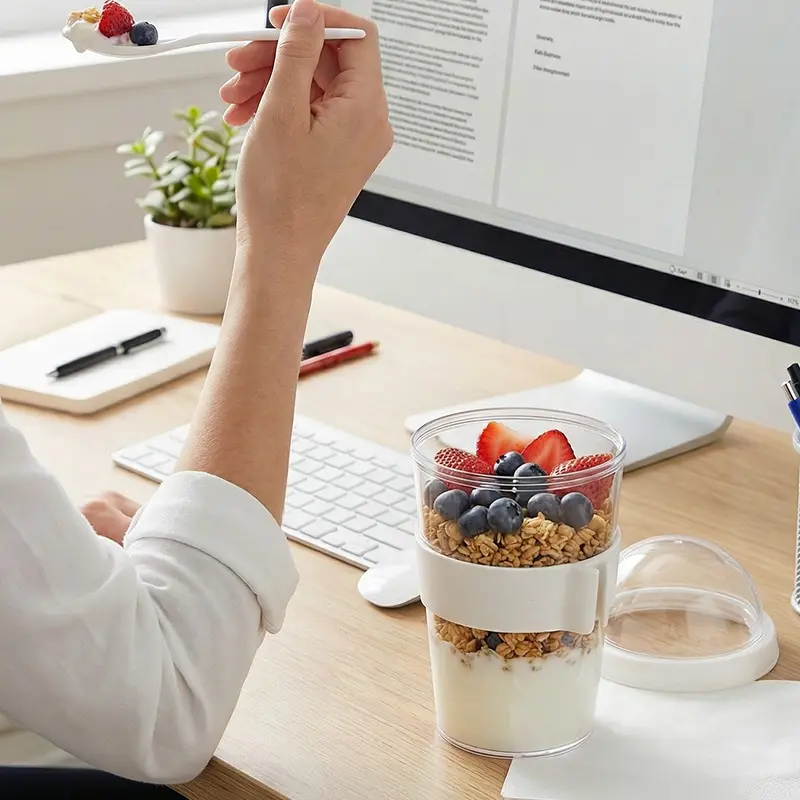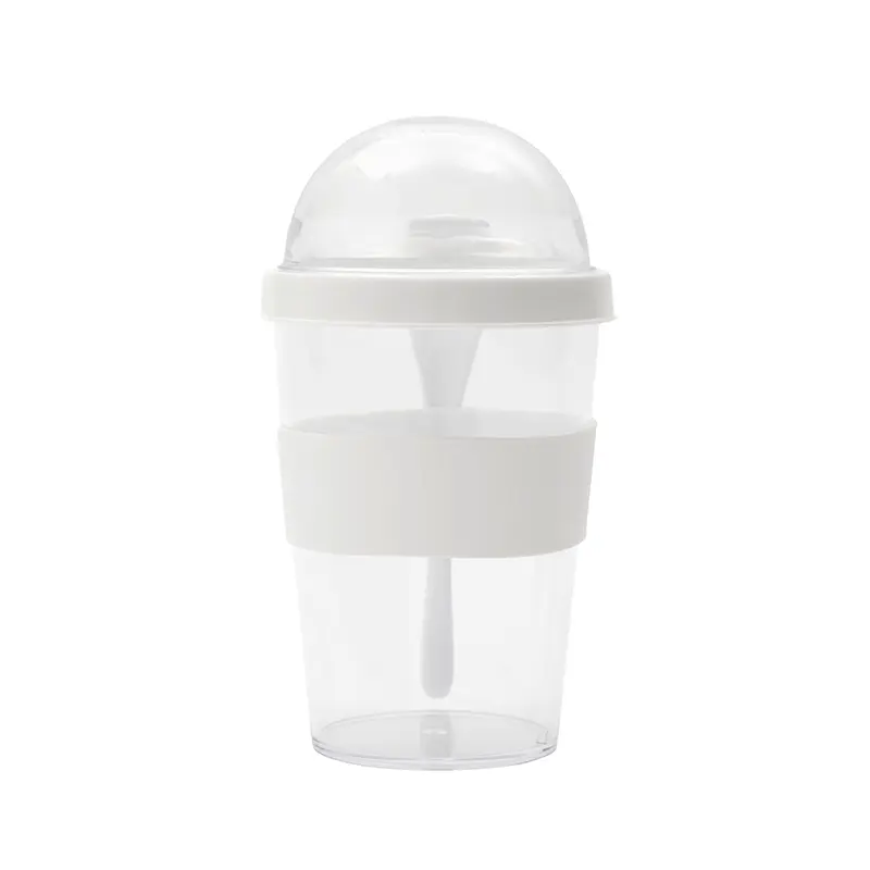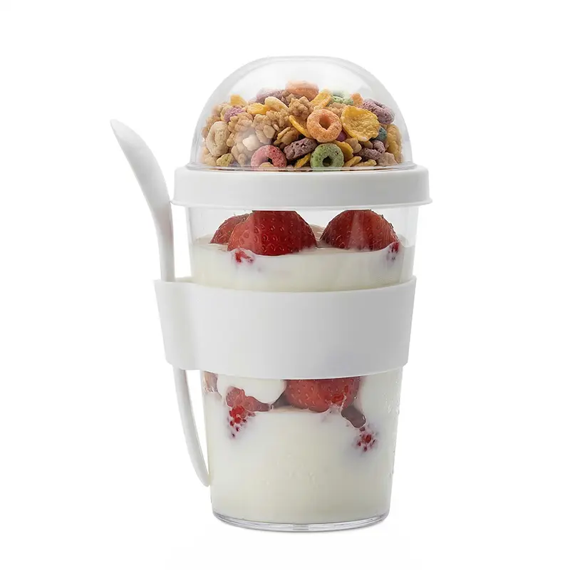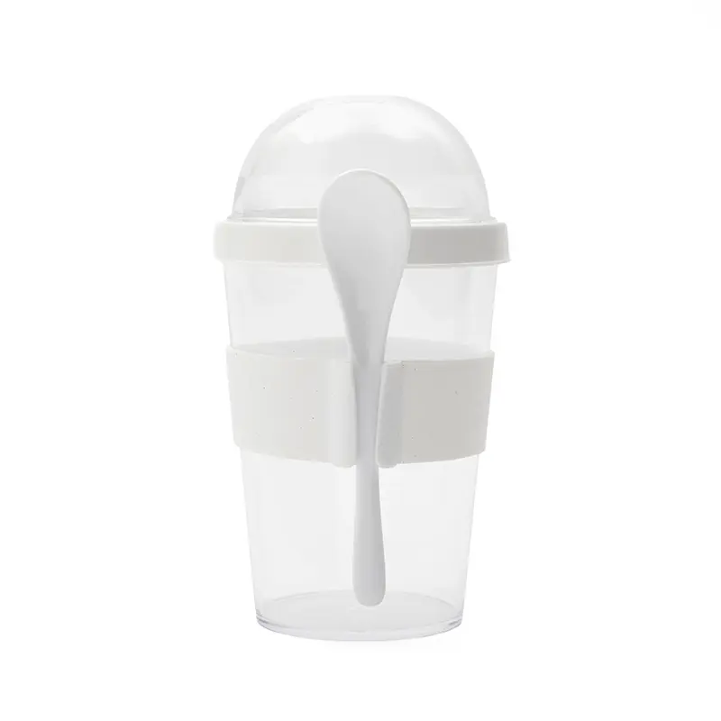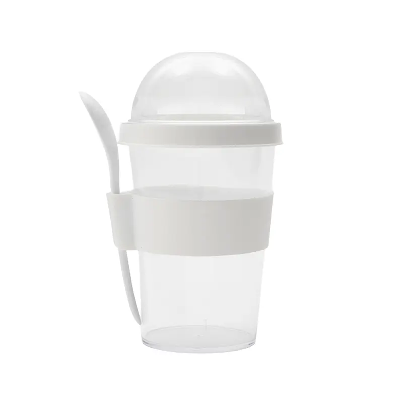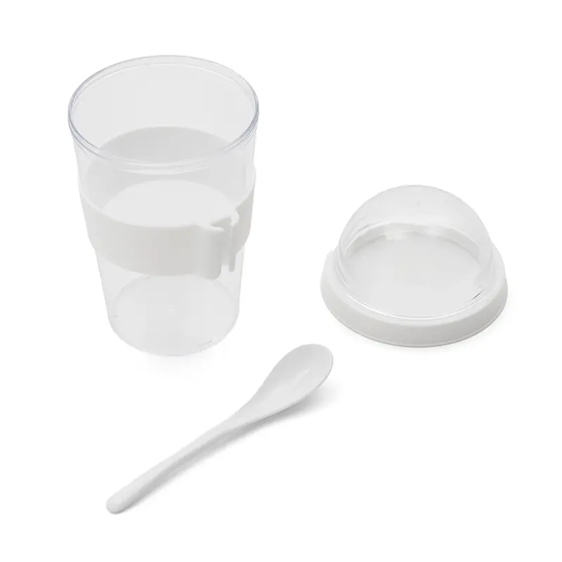 Mug Greco (SKU 599) para regalos corporativos y campañas de empresa. Compatible con estrategias de regalos corporativos, incluyendo soluciones en textil, sublimación y DTF. Jarro con compartimento superior y cuchara, fabricado en plástico PS con tapa de polipropileno y grip de silicona. Cuenta con domo transparente para cereales o toppings y cuchara incluida. Es ideal para desayunos saludables y prácticos fuera de casa, en la oficina o en viajes. Capacidad: 400 ml (jarro) + 130 ml (domo) TAHG Cotiza formato corporativo con personalización de logo y cobertura en Chile.