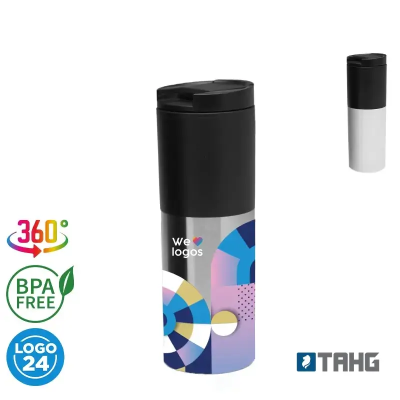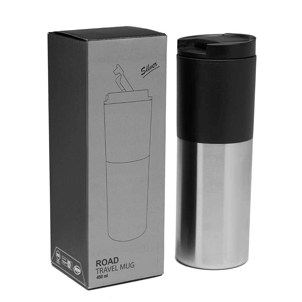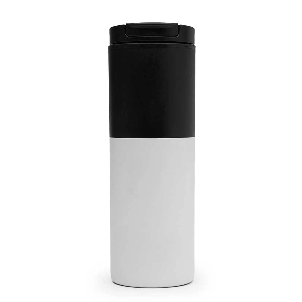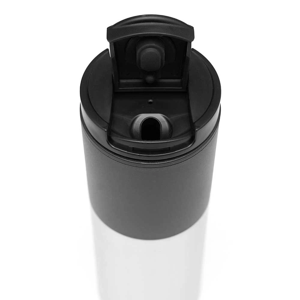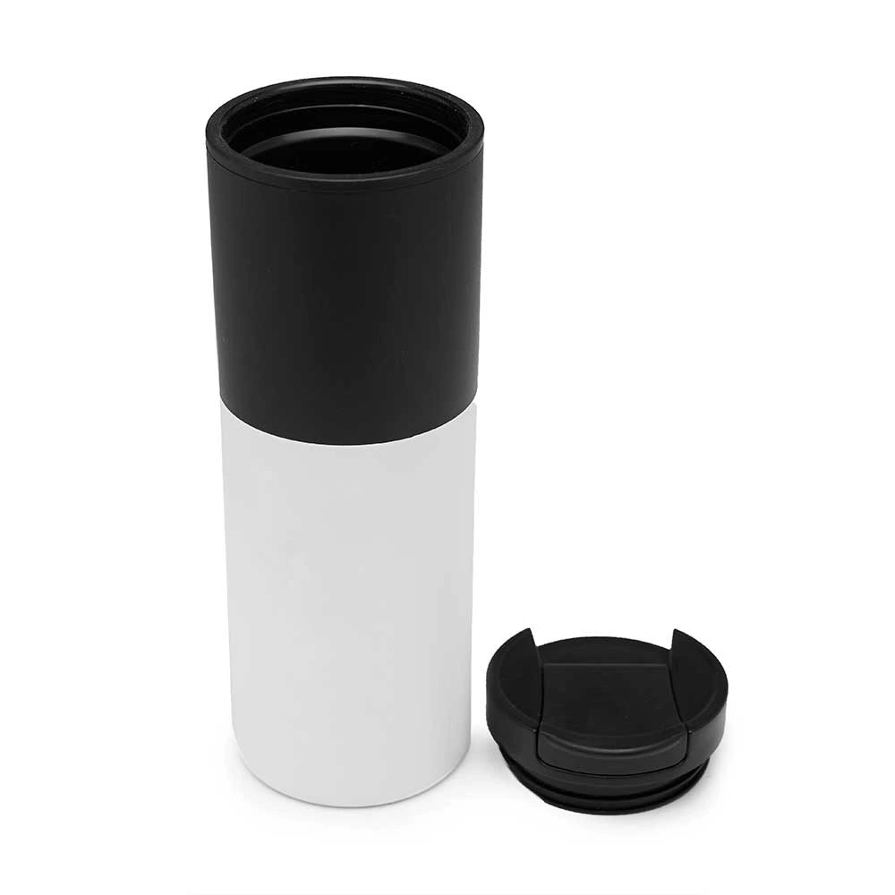 Mug Road (SKU 31) para regalos corporativos y campañas de empresa. Compatible con estrategias de regalos corporativos, incluyendo soluciones en textil, sublimación y DTF. Mug térmico realizado con aluminio e interior de polipropileno negro. Boquilla regulable. Doble pared plástica. Packaging: Caja Impresa. Medidas: 22 cm x Diámetro 7,5 cm. Interior realizado en plástico. Capacidad: 450 ml. Producto libre de BPA. No es apto para microondas. No es apto para lavavajillas. Cotiza formato corporativo con personalización de logo y cobertura en Chile.