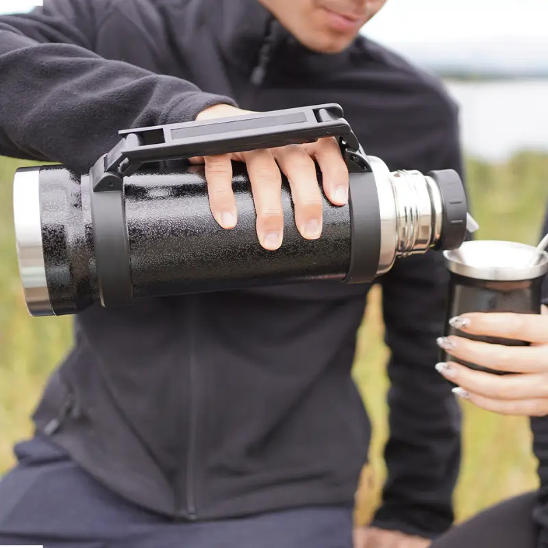Termo Iguazu (SKU 129) para regalos corporativos y campañas de empresa. Compatible con estrategias de regalos corporativos, incluyendo soluciones en textil, sublimación y DTF. Termo de acero inoxidable 304, recubierto con esmalte especial que protege de ralladuras y golpes. Puede mantener el contenido a la misma temperatura durante 18hs, gracias a su doble pared aislante especial de acero. Cuenta con un tapón cebador Hermético a rosca con la función anti derrame y tapa con superficie plana estable para usar como taza o vaso y manija plegable para facilitar el transporte. Presentado en caja de cartón. Medidas del termo: 34 cm x 10,5 cm. Medidas de la caja: 35 x 11 x 11 cm. Capacidad: 1,1 Lts. Cotiza formato corporativo con personalización de logo y cobertura en Chile.