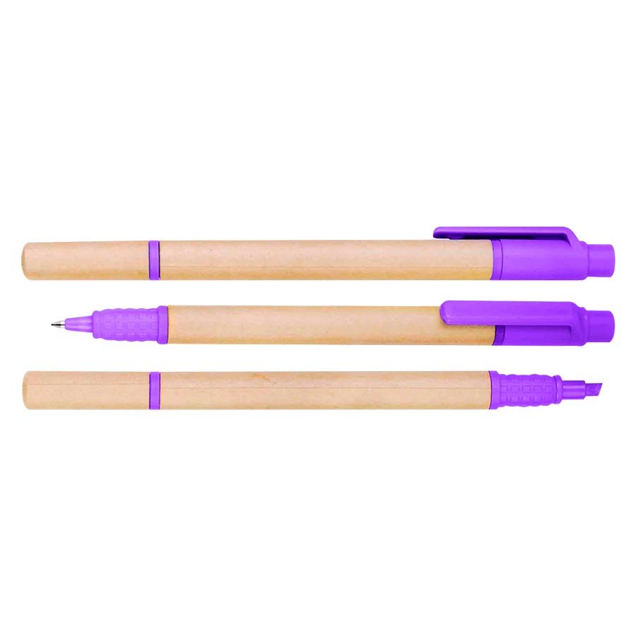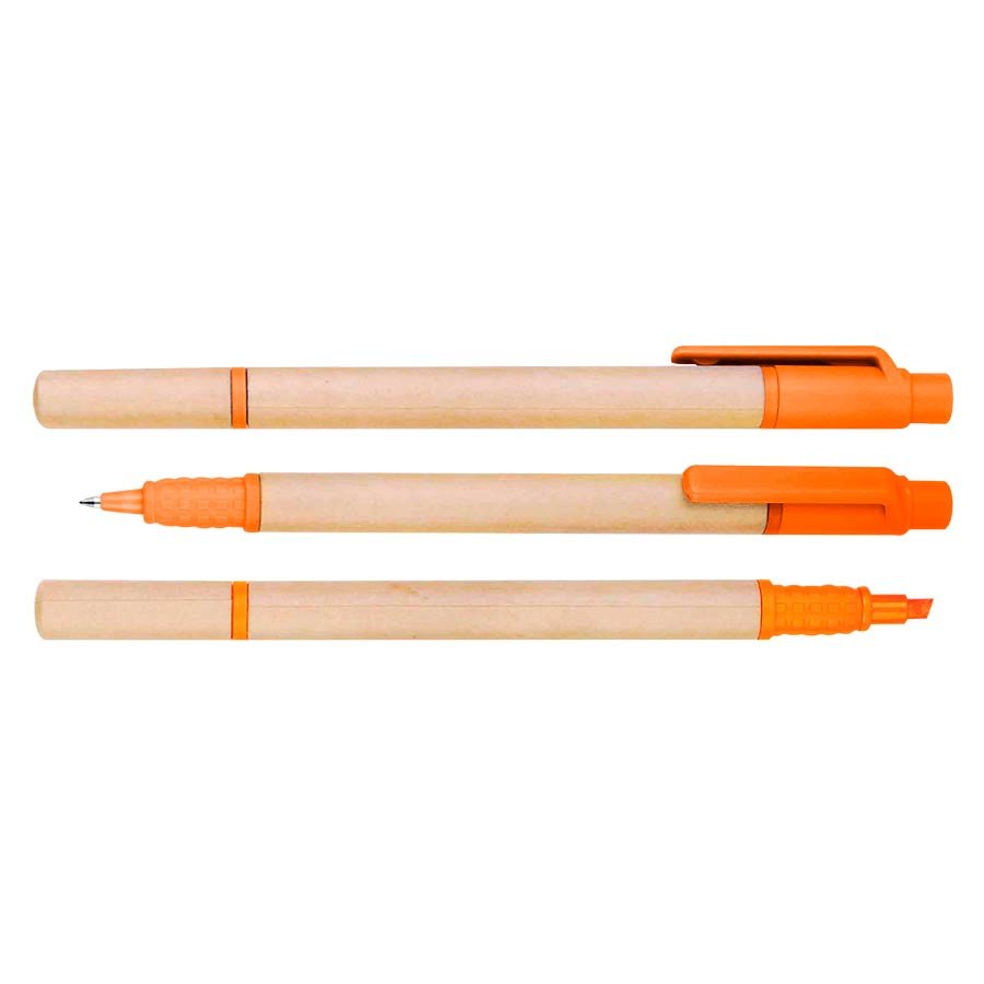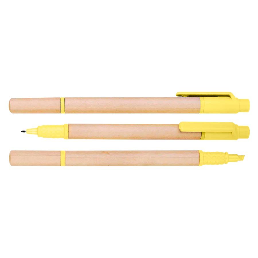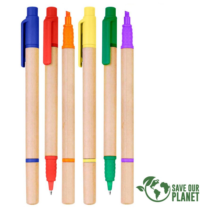 Bolígrafo Ecológico con Destacador (SKU L66) para regalos corporativos y campañas de empresa. Compatible con estrategias de regalos corporativos, incluyendo soluciones en textil, sublimación y DTF. Bolígrafo Ecológico de cartón reciclado con destacador de color. Escritura azul. • Tamaño: 14 x Ø 1 cm. • Colores:Azul (02), Rojo (03), Naranjo (04), Amarillo (05), Verde (06), Morado (25). • Sugerencia: Serigrafía, Tampografía. Cotiza formato corporativo con personalización de logo y cobertura en Chile.
