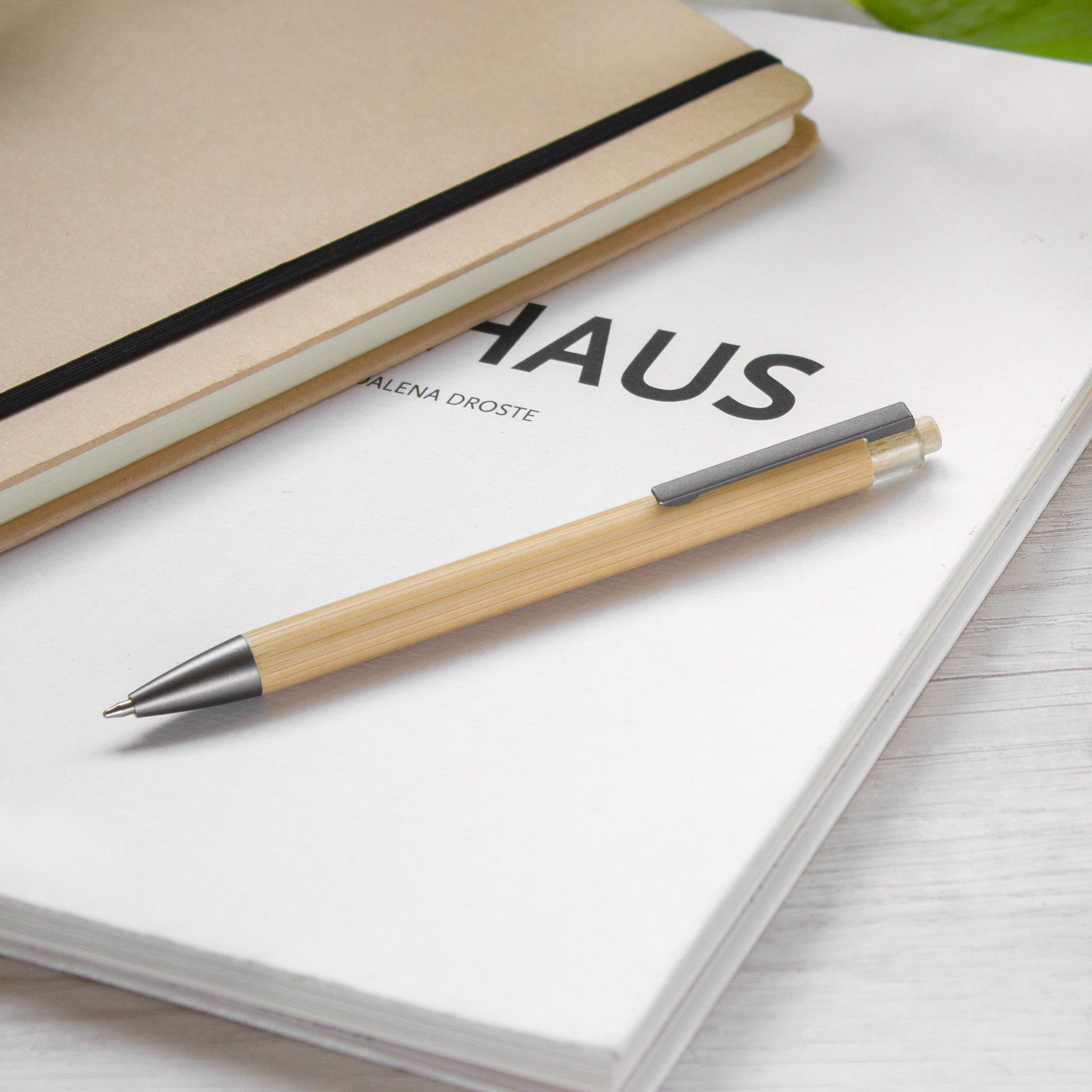 Bolígrafo de bambú "BARRY" (SKU BP326) para regalos corporativos y campañas de empresa. Compatible con estrategias de regalos corporativos, incluyendo soluciones en textil, sublimación y DTF. Sostenible y sofisticado.Bolígrafo retráctil. Cuerpo y botón pulsador de bambú. Clip metálico y puntera plástica en color gris gun. Medidas: 1 x 14,1 cm. Materiales: Bambú, plástico ABS y acero. Peso: 7,6 g. Tinta: negra. Cotiza formato corporativo con personalización de logo y cobertura en Chile.