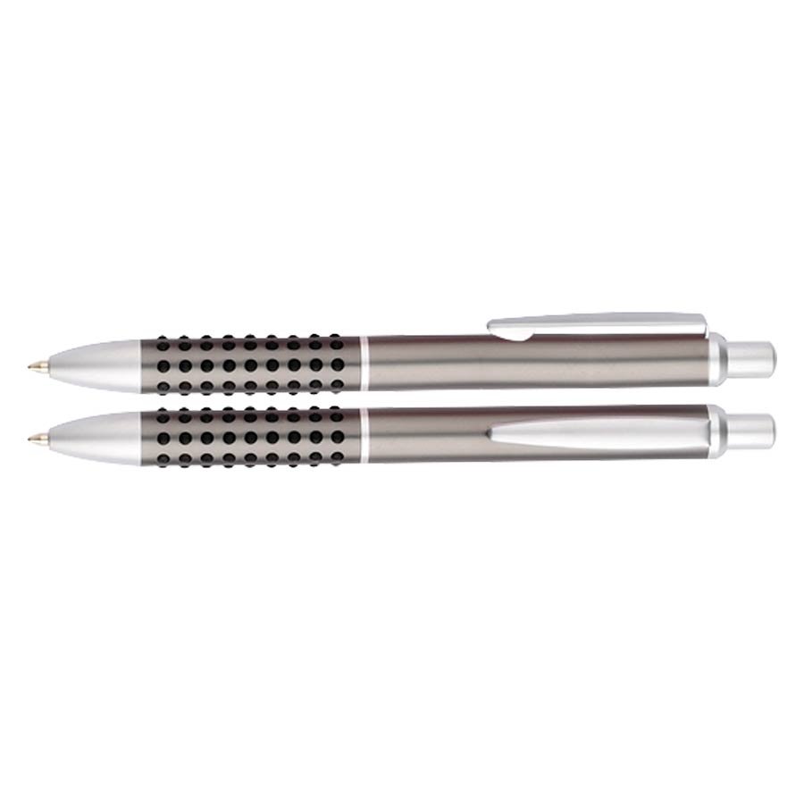 Bolígrafo Metálico Caterpillar (SKU L50) para regalos corporativos y campañas de empresa. Compatible con estrategias de regalos corporativos, incluyendo soluciones en textil, sublimación y DTF. Bolígrafo metálico satinado modelo "Caterpillar", con lunares de goma negra que brindan una suave sensación de masaje dactilar al escribir. Escritura azul. • Tamaño: 13.5 x Ø 1 cm. • Colores: Azul (02), Rojo (03), Gris Titanio (27). • Sugerencia: Serigrafía, Pantógrafo, Grabado Láser (aparece dorado). • Peso: 7.5 grs. Cotiza formato corporativo con personalización de logo y cobertura en Chile.