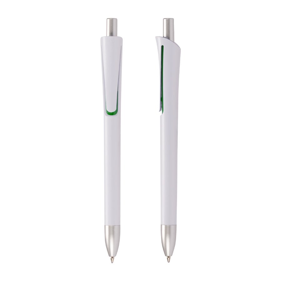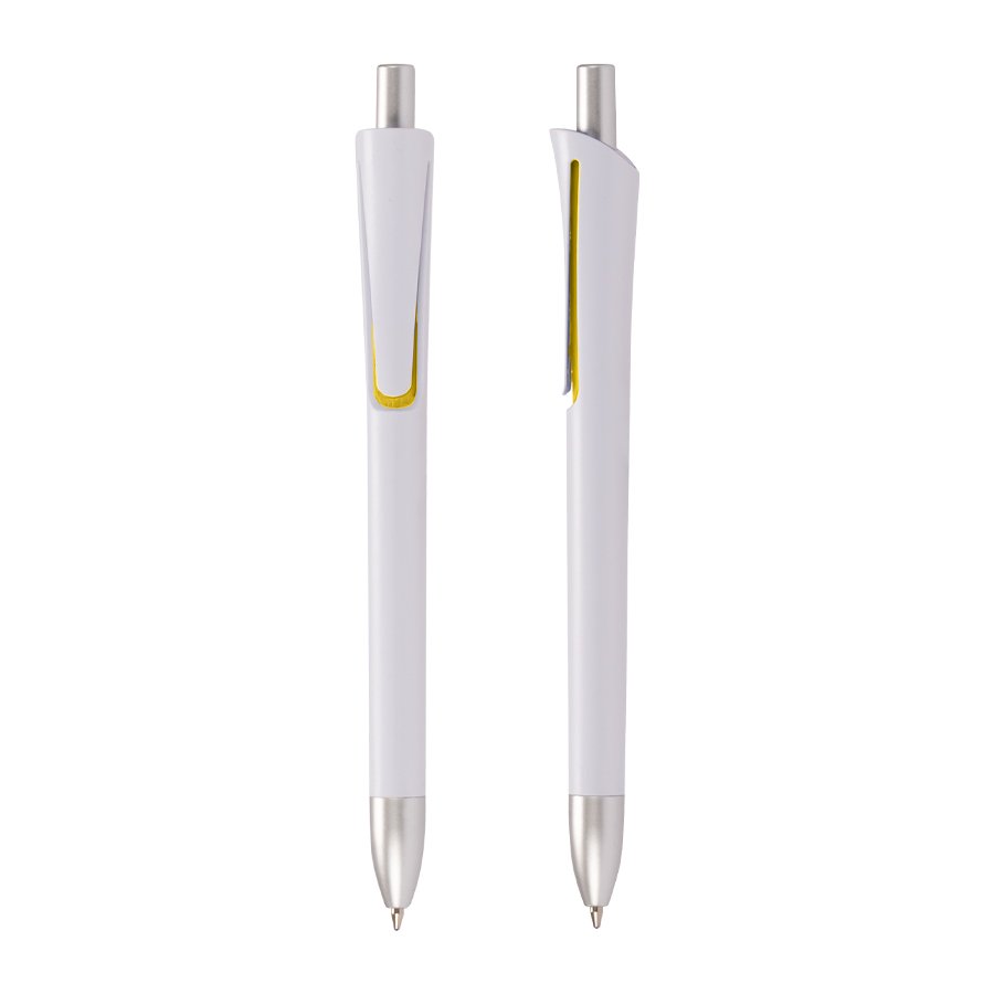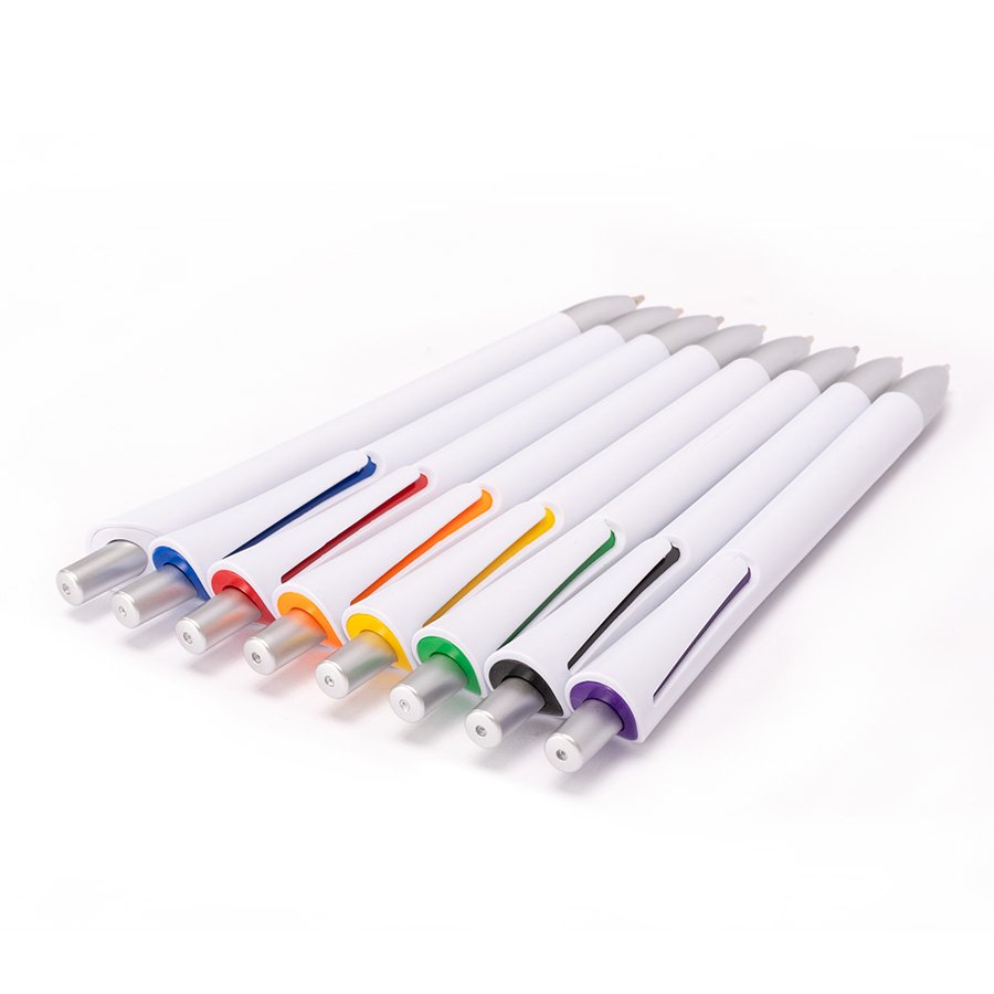 Bolígrafo "OPERA" (SKU L115) para regalos corporativos y campañas de empresa. Compatible con estrategias de regalos corporativos, incluyendo soluciones en textil, sublimación y DTF. Bolígrafo plástico con cuerpo blanco mate, terminales plateados y detalle bajo el clip de color. Escritura azul. Cotiza formato corporativo con personalización de logo y cobertura en Chile.
