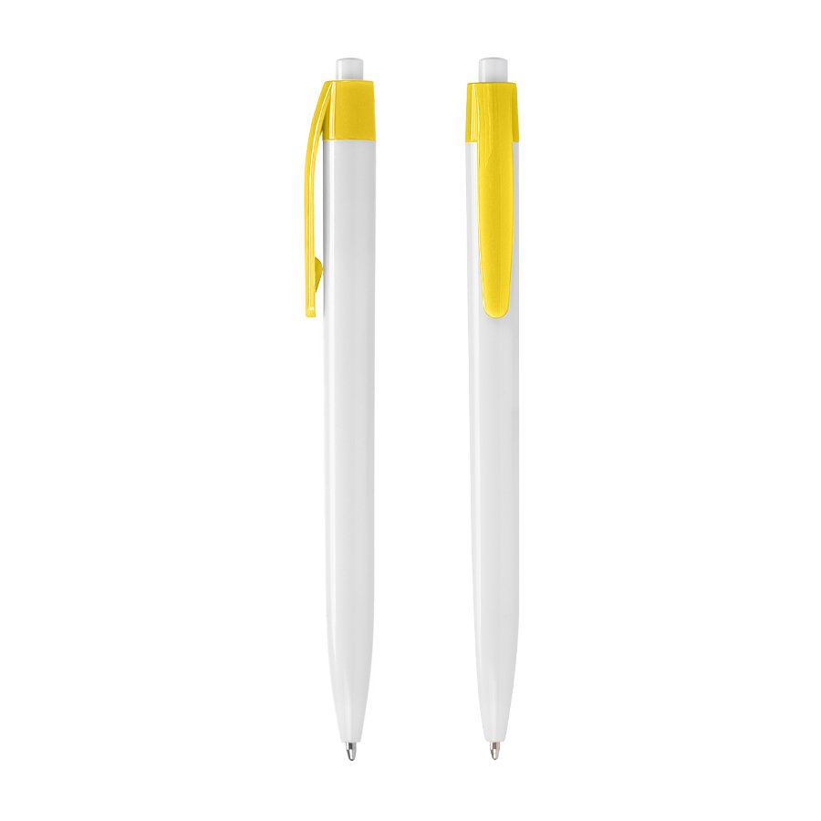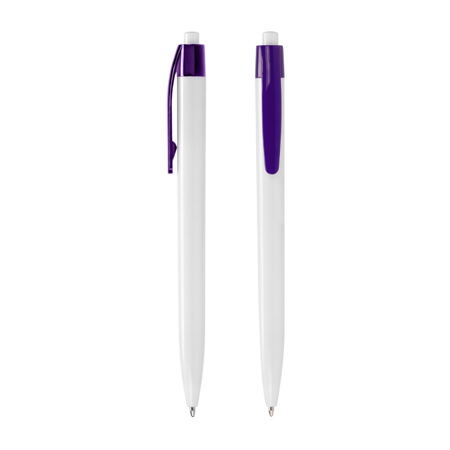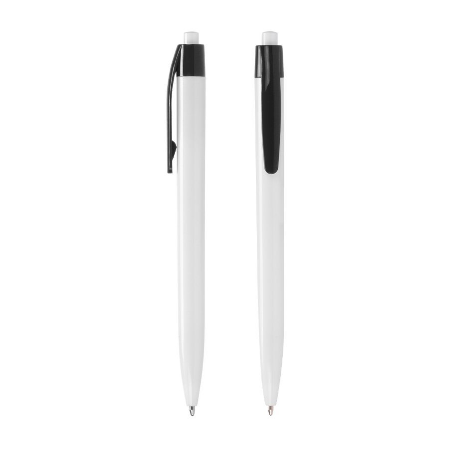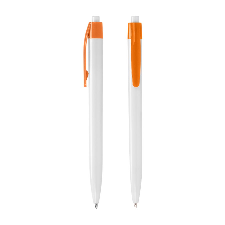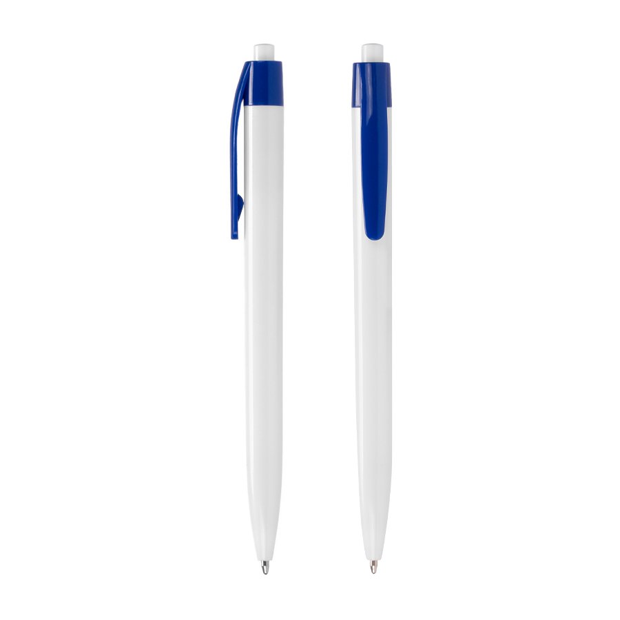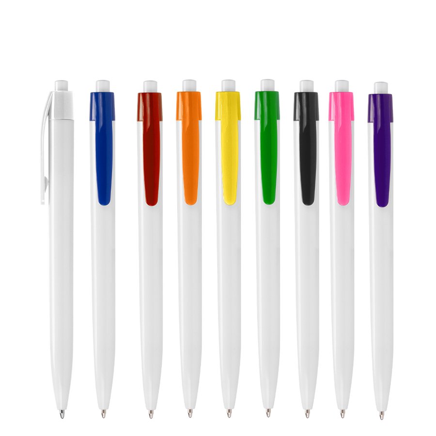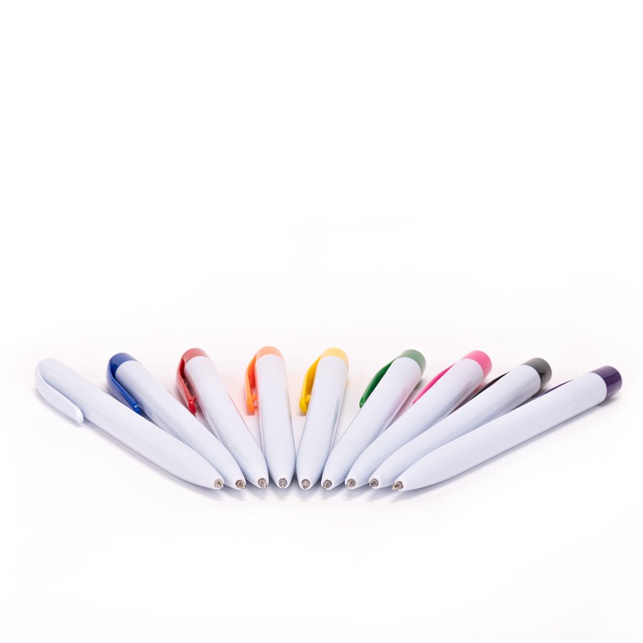 Bolígrafo "TITA" (SKU L55) para regalos corporativos y campañas de empresa. Compatible con estrategias de regalos corporativos, incluyendo soluciones en textil, sublimación y DTF. Bolígrafo plástico cuerpo blanco y clip de color. Escritura azul. Cotiza formato corporativo con personalización de logo y cobertura en Chile.