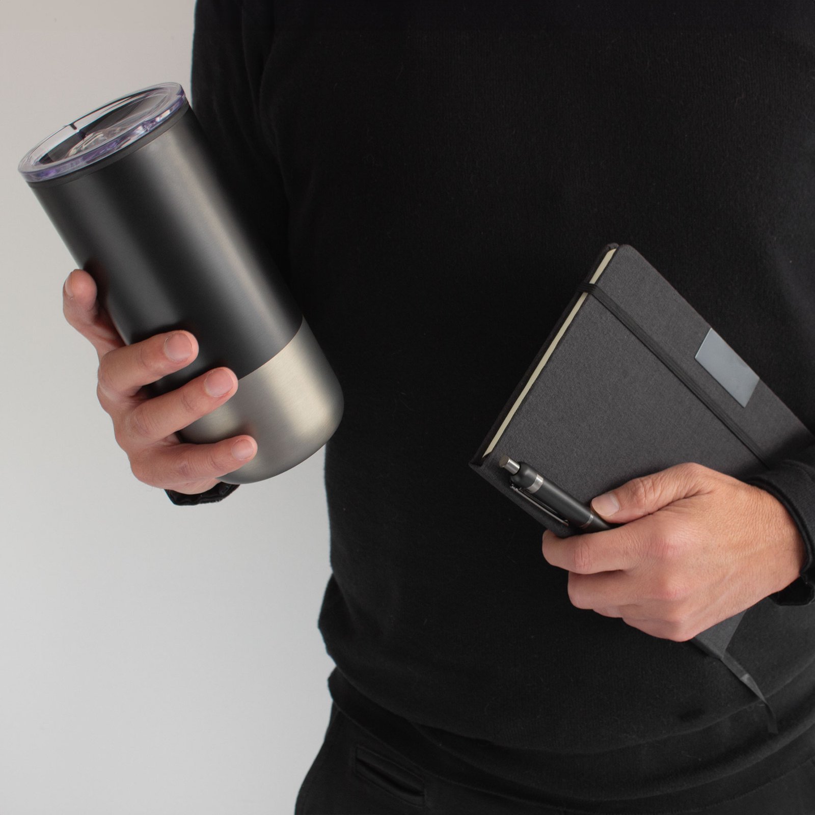 Set ejecutivo "MOON BOX" (SKU S01) para regalos corporativos y campañas de empresa. Prioridad comercial en líneas de textil, sublimación y DTF para branding corporativo. Contiene los esenciales para recibir con estilo y generar una impresión memorable.Caja de regalo compuesta por 3 artículos: - 1 bolígrafo retráctil, cuerpo de aluminio color negro mate. Clip, pulsador y anillos metálicos color gun. Destape electroplateado en ambas partes. Tinta negra. - 1 libreta color negro de 14 x 21 x 1,5 cm. Con placa metálica color gun de 5 x 2 cm. Tapa de cartón 300g recubierta en RPET 310. Interior de 80 hojas rayadas de 70g. Encuadernación cosida y cierre con banda elástica color negro. - 1 mug color negro co… Cotiza formato corporativo con personalización de logo y cobertura en Chile.