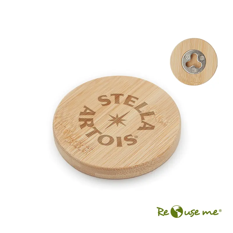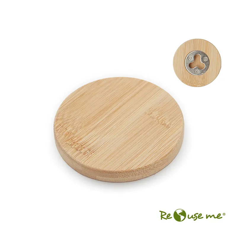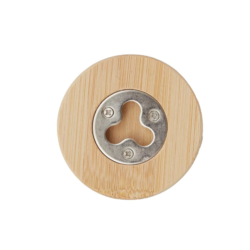 Destapador Uncap (SKU 230) para regalos corporativos y campañas de empresa. Compatible con estrategias de regalos corporativos, incluyendo soluciones en textil, sublimación y DTF. Destapador abrebotellas circular fabricado en bambú y metal. Dimensiones: 6 cm. ReUseMe Cotiza formato corporativo con personalización de logo y cobertura en Chile.