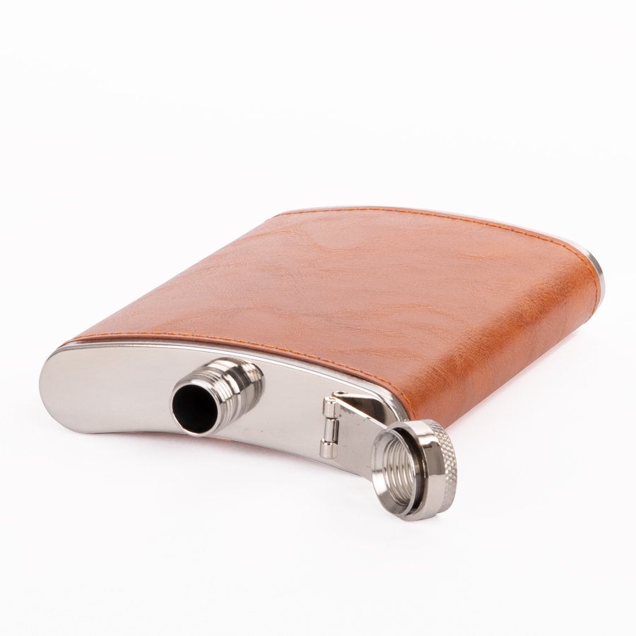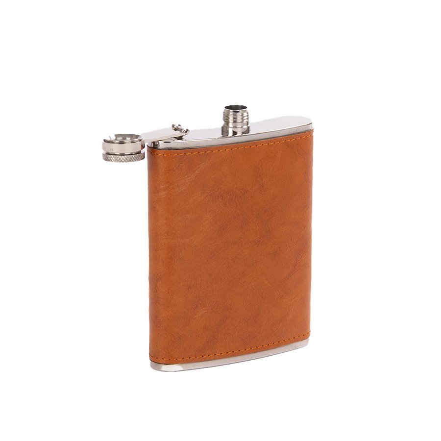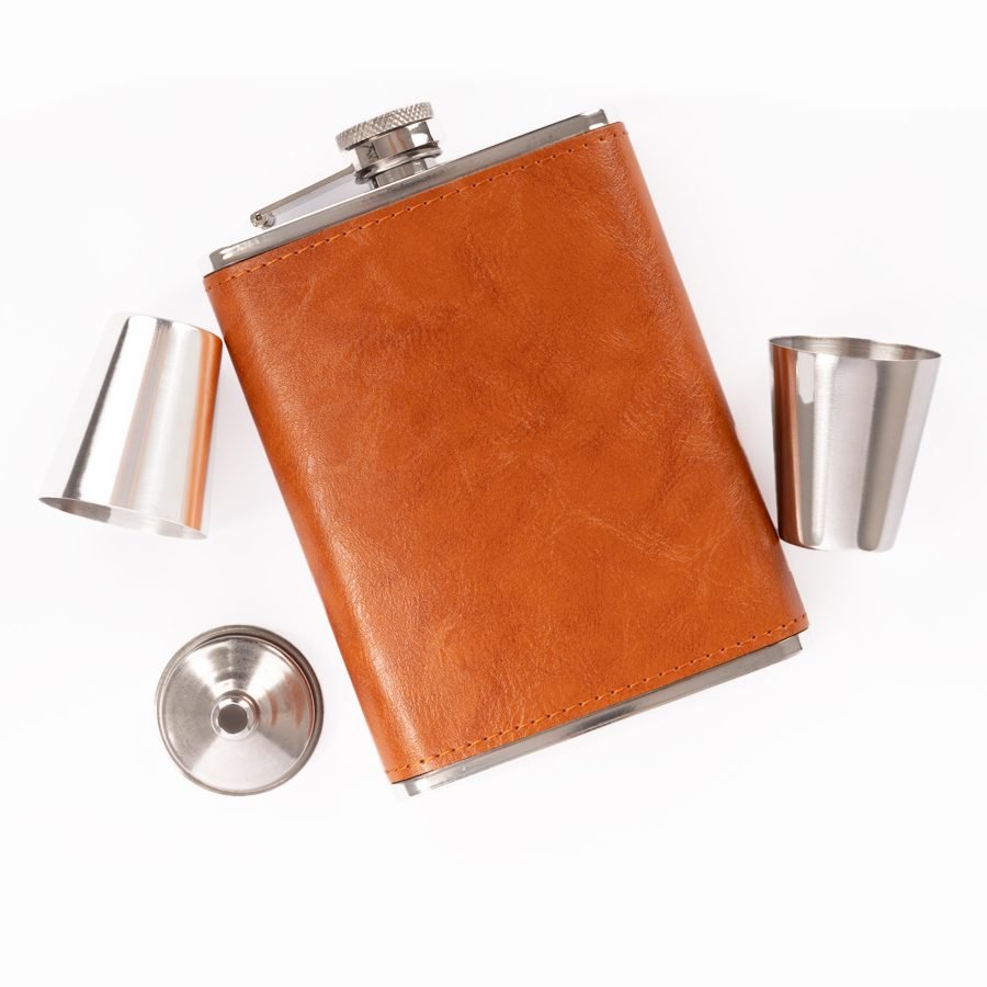 Set Petaca + Vasitos "OXFORD" (SKU W29) para regalos corporativos y campañas de empresa. Prioridad comercial en líneas de textil, sublimación y DTF para branding corporativo. Set Petaca Licorera con cubierta de eco-cuero café claro (color caramelo) + 2 vasitos + 1 embudo de Acero Inoxidable SS304, modelo "OXFORD". Capacidad Petaca 8 oz (237 ml). Presentación en elegante estuche de cartón forrado negro con tapa. Interior cama aterciopelada negra. •Tamaño: 19.4 x 17.4 x 4.3 cm •Peso: 310 g •Capacidad: Petaca 237 cc •Colores: Café claro (55) •Sugerencia de Impresión: Serigrafía, DTF, Tampografía, Grabado Láser. •Presentación: Elegante estuche de cartón forrado negro con tapa. Interior cama aterciopelada negr… Cotiza formato corporativo con personalización de logo y cobertura en Chile.