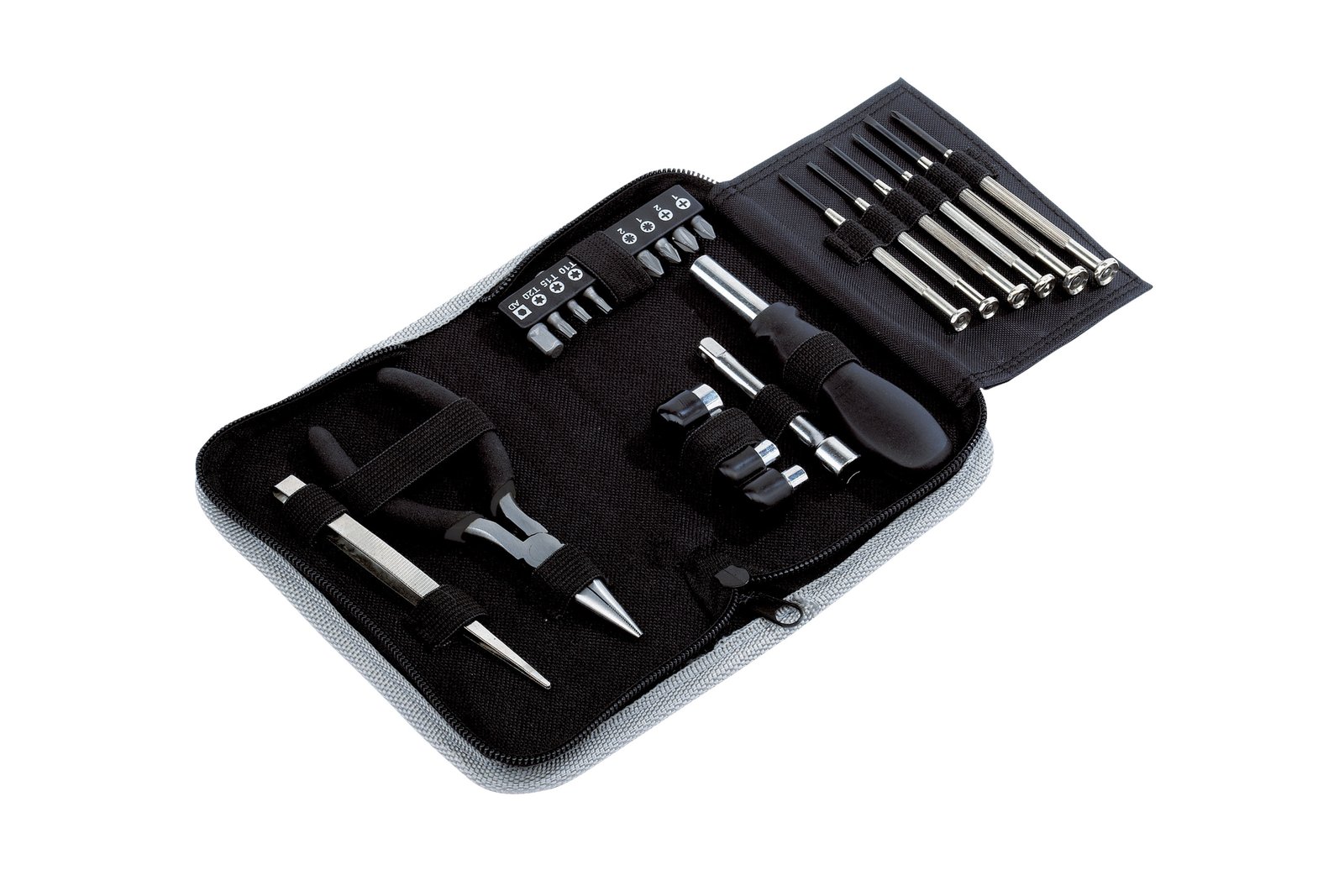SET DE HERRAMIENTAS "COMPACT" (SKU T187) para regalos corporativos y campañas de empresa. Compatible con estrategias de regalos corporativos, incluyendo soluciones en textil, sublimación y DTF. 18 x 3,5 x 9,5 cm Set de 24 piezas. Destornilladores, pinzas, complementos. Estuche negro con cierre. Presentación en caja de regalo. Cotiza formato corporativo con personalización de logo y cobertura en Chile.