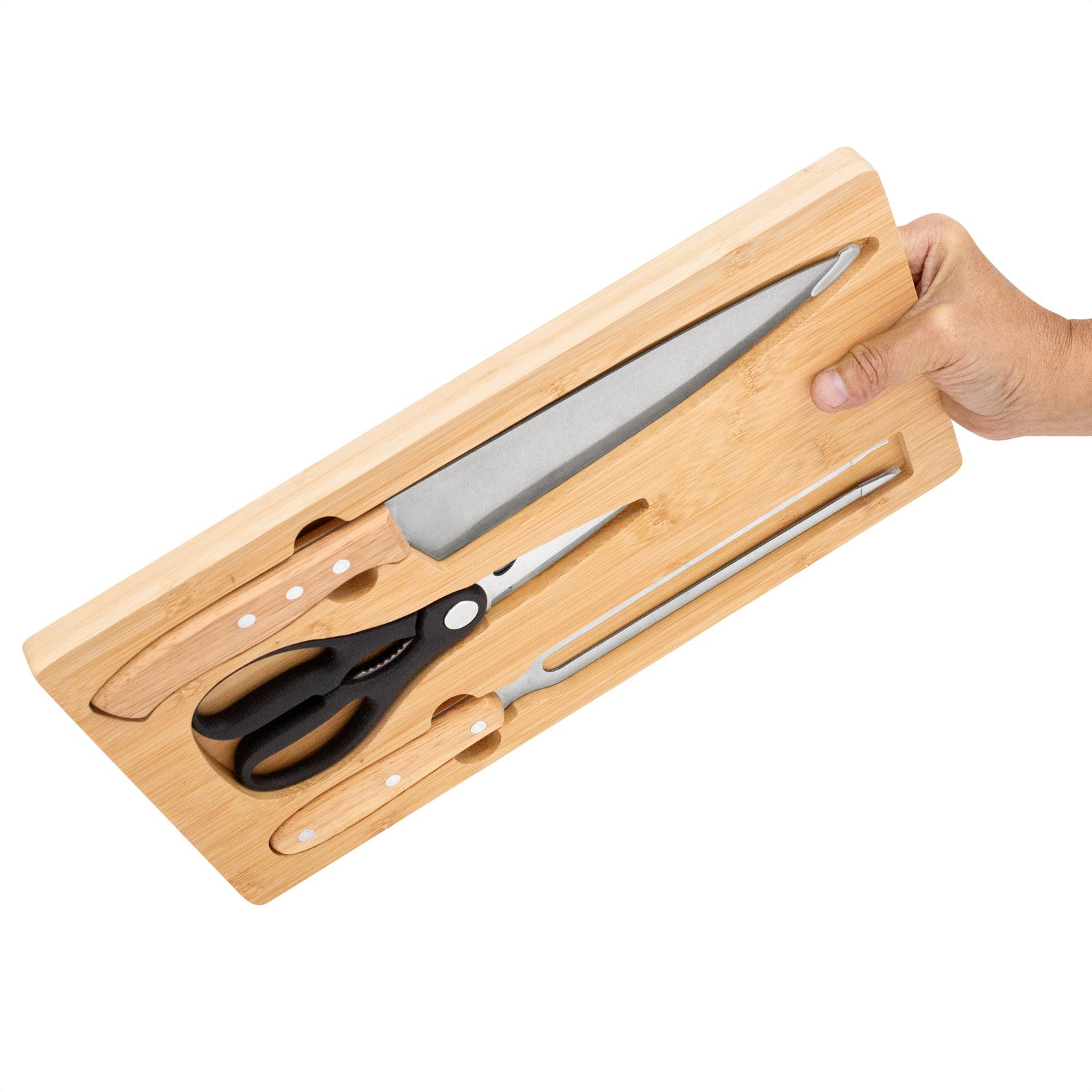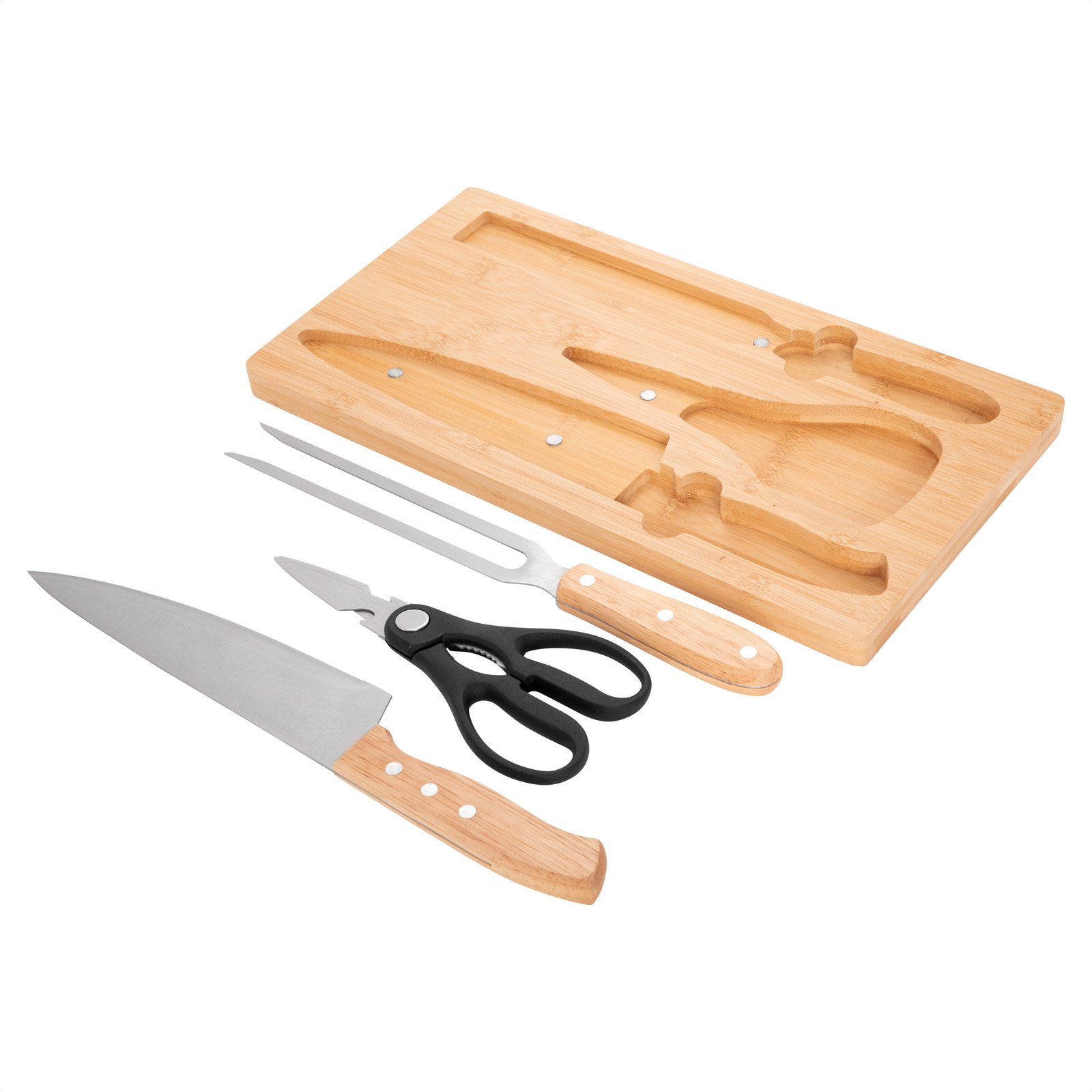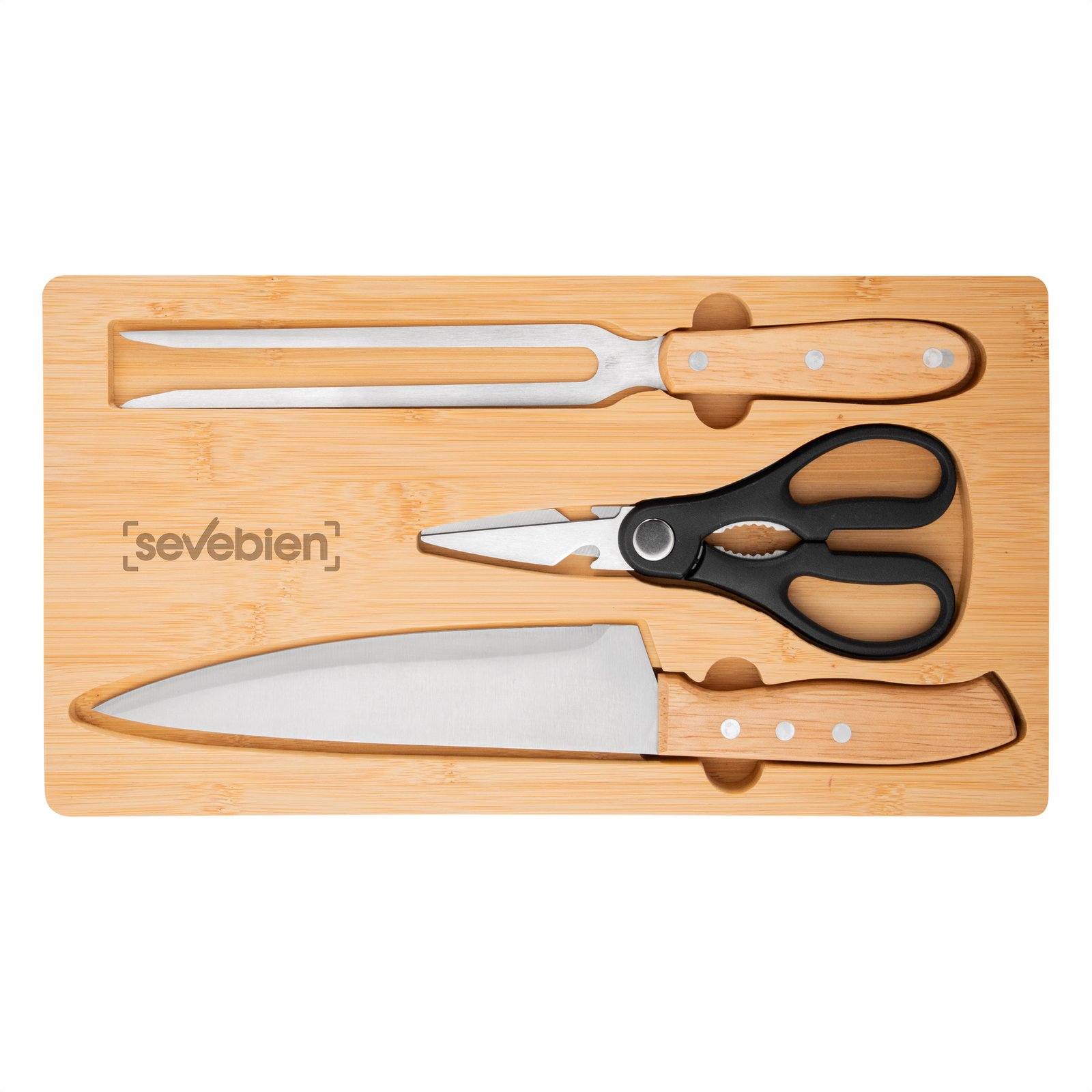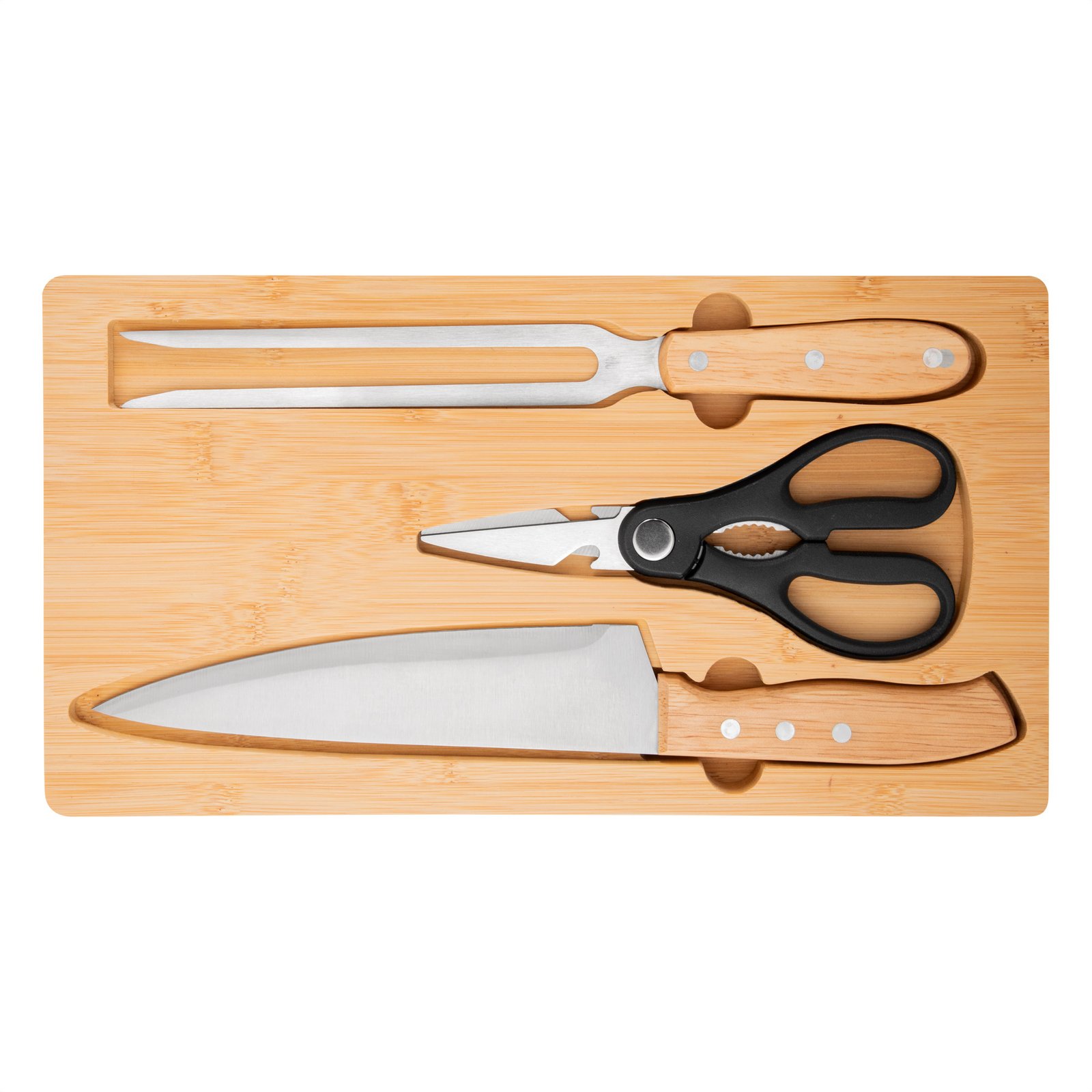Set de asado / BBQ "BISTEC" (SKU T796) para regalos corporativos y campañas de empresa. Compatible con estrategias de regalos corporativos, incluyendo soluciones en textil, sublimación y DTF. El detalle que se luce en cada asadoSet de asado. Tabla de corte de bambú con imán en el lado opuesto para fijar los 3 utensilios: Tijera de cocina multiuso (corte de aves, pescados, vegetales, y hierbas con abridor de botellas y rompenueces) de acero con mango plástico; Cuchillo chef y Tenedor, ambos de acero con mango de madera. Medidas: 36 x 19.4 x 1.8 cm. (tabla), 19,5 x 8,5 cm. (tijera), 33,5 x 4,5 cm. (cuchillo) y 30,5 x 3 cm. (tenedor) Peso: 73g (tijera), 107 g. (cuchillo) y 84 g (tenedor) Materiales: Bambú, imán, acero inoxi… Cotiza formato corporativo con personalización de logo y cobertura en Chile.