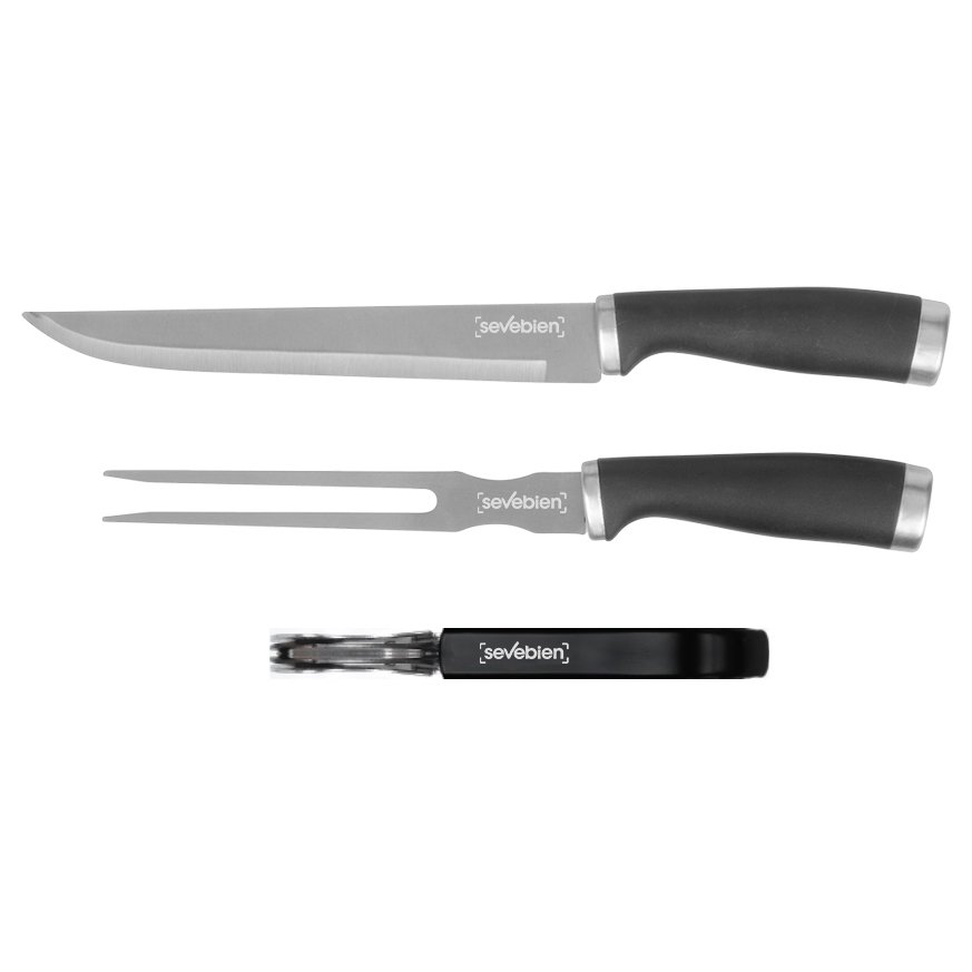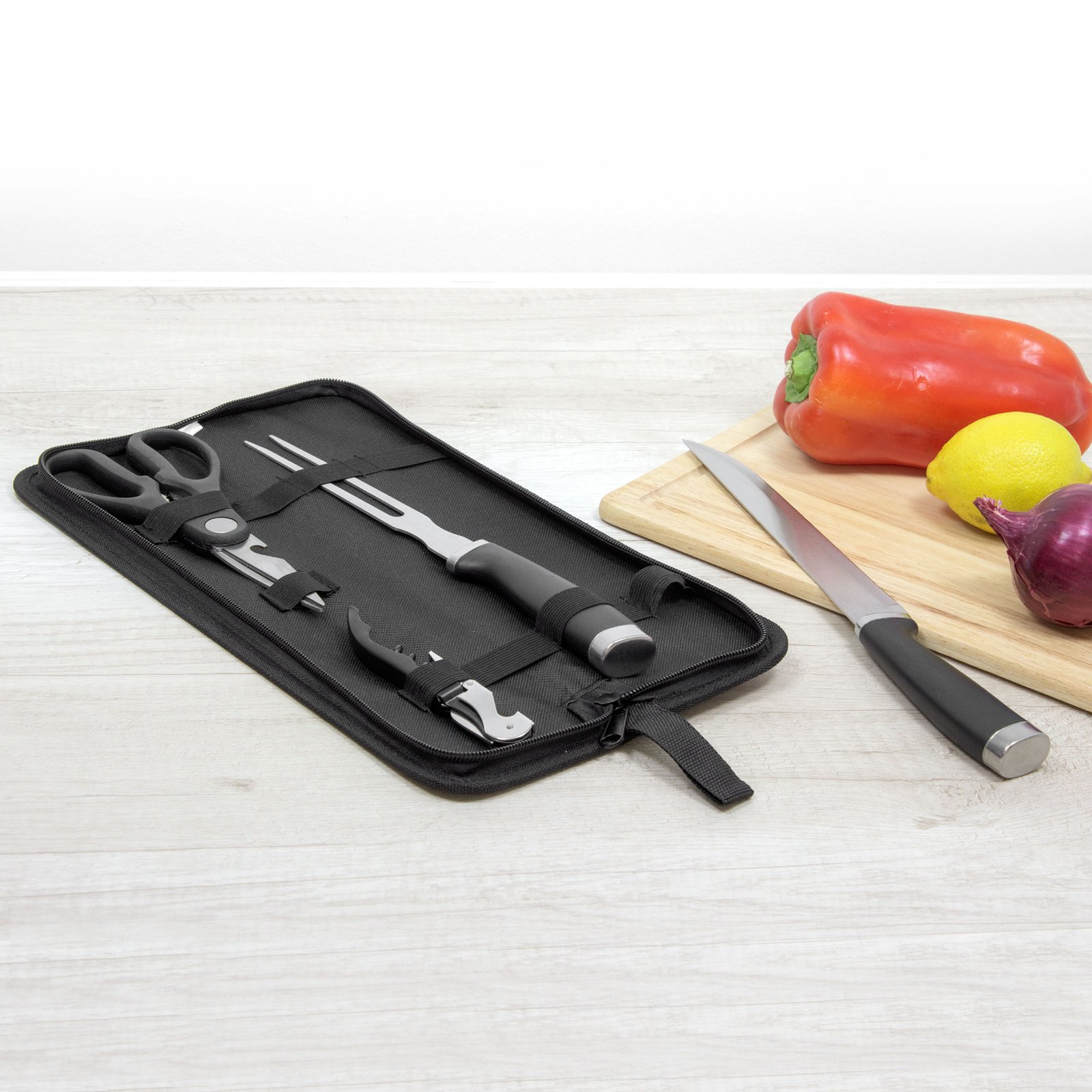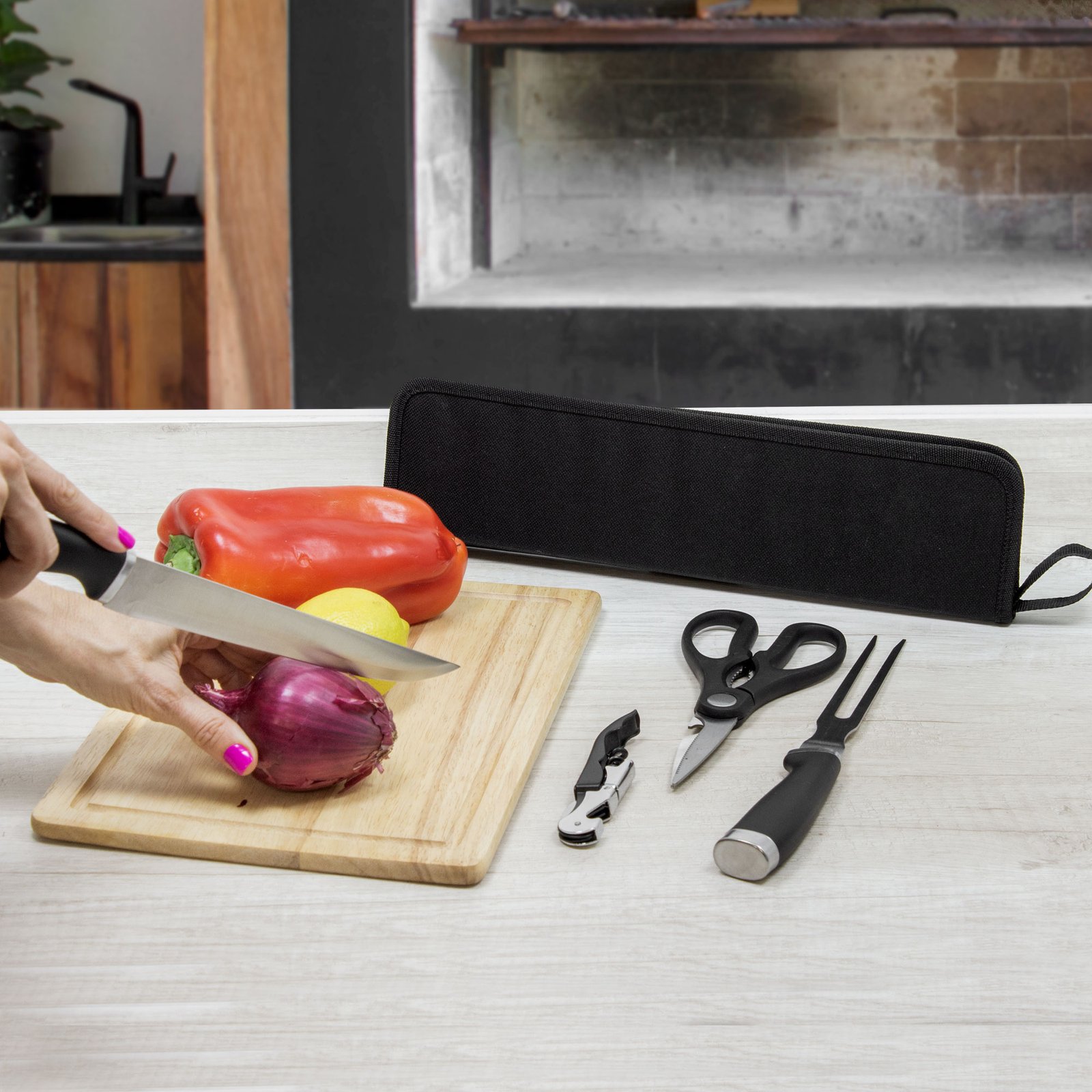 SET DE ASADO / BBQ "HUNAN" (SKU T597) para regalos corporativos y campañas de empresa. Compatible con estrategias de regalos corporativos, incluyendo soluciones en textil, sublimación y DTF. 36 x 9,5 x 3 cm. Acero inoxidable y polipropileno + Nylon. Set de asado en estuche con cierre. Contiene: tenedor , asador y cuchilla con mango color negro. Trae tijera y destapador de vino.(Las medidas volcadas son las del estuche). Cotiza formato corporativo con personalización de logo y cobertura en Chile.