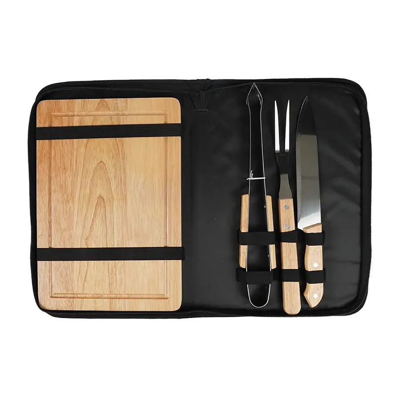 Set de Asado Brasa (SKU 435) para regalos corporativos y campañas de empresa. Compatible con estrategias de regalos corporativos, incluyendo soluciones en textil, sublimación y DTF. El Set BBQ Brasa es ideal para tus parrilladas y asados. Contiene: 1 tabla, 1 cuchillo, 1 tenedor y 1 pinza. Viene presentado en un estuche de poliéster de alta calidad, perfecto para almacenar y transportar tus utensilios. Tahg Cotiza formato corporativo con personalización de logo y cobertura en Chile.