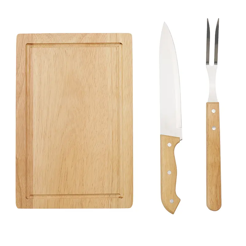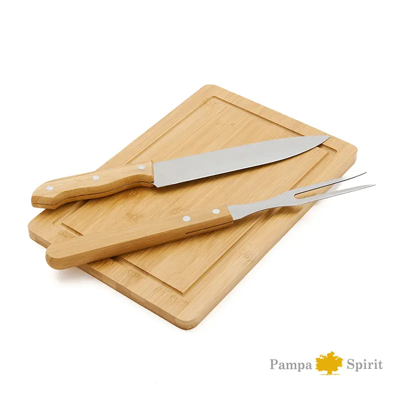 Set de Asado Roti (SKU 437) para regalos corporativos y campañas de empresa. Compatible con estrategias de regalos corporativos, incluyendo soluciones en textil, sublimación y DTF. El set de asado Roti contiene: tenedor y cuchillo de 33 cm, ambos con mango de madera y, tabla de bamboo de 30 x 20 x 1,2 cm. Este set incluye todo lo que necesitas, ideal para los amantes del asado. Pampa Spirit Cotiza formato corporativo con personalización de logo y cobertura en Chile.