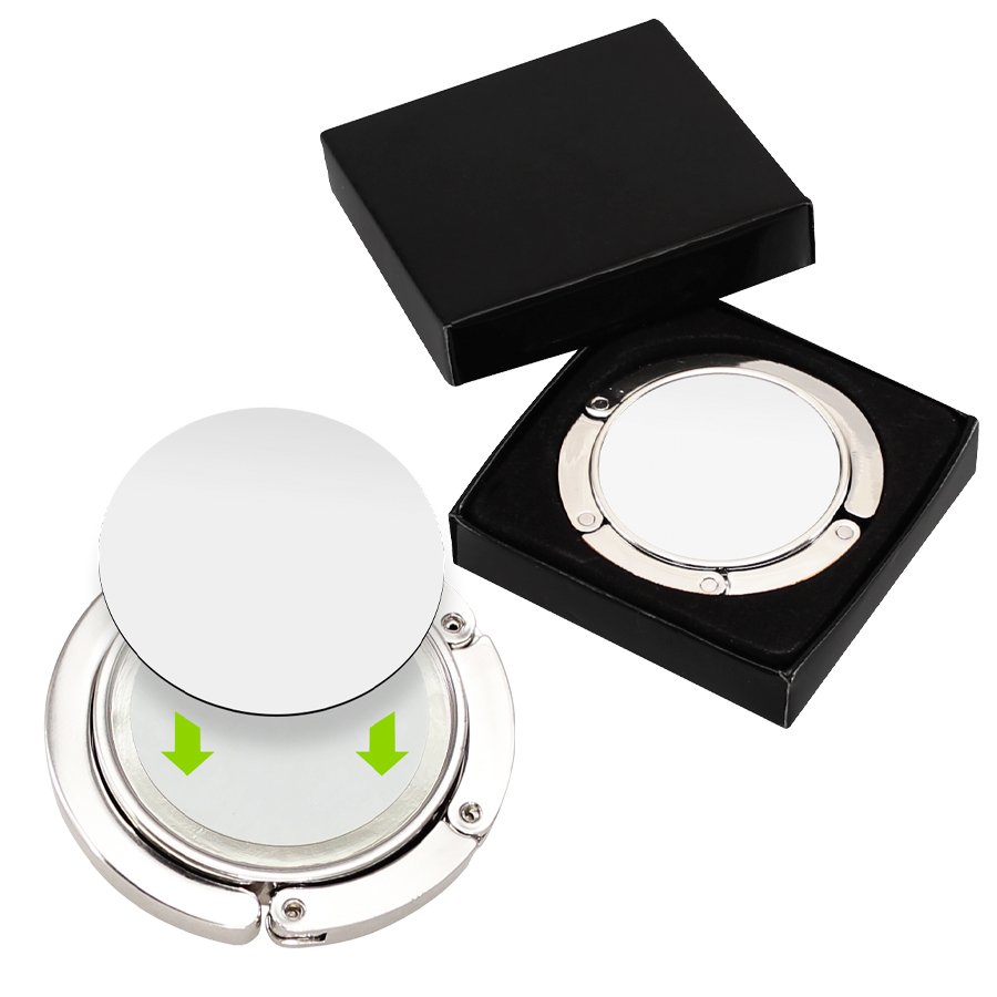 Colgador de Carteras Sublimación (SKU Y80) para regalos corporativos y campañas de empresa. Prioridad comercial en líneas de textil, sublimación y DTF para branding corporativo. Colgador Metálico redondo de sobremesa, para Bolsos y Carteras, con círculo central para Sublimación. Presentación en estuche laminado negro con cuna aterciopelada. IMPORTANTE Recuerde que todas las máquinas para sublimar son diferentes y requieren distintos tiempos y temperaturas. Así mismo los productos varían según el fabricante. Antes de sublimar una partida completa, siempre debe hacer pruebas sobre muestras hasta que logre ajustar su máquina para obtener la óptima intensidad del color y no quemar el producto o dejarlo deslavado… Cotiza formato corporativo con personalización de logo y cobertura en Chile.
