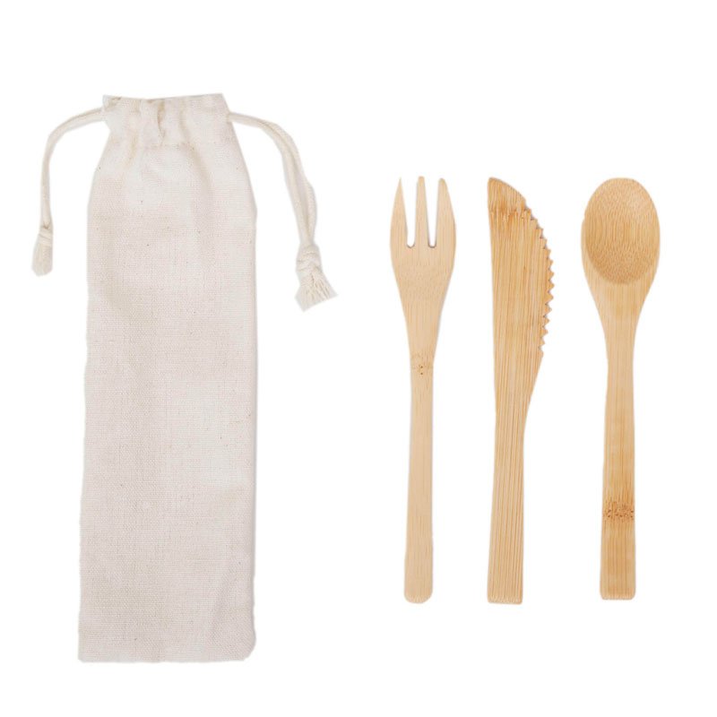 Set Cutlery Bamboo (SKU 188) para regalos corporativos y campañas de empresa. Prioridad comercial en líneas de textil, sublimación y DTF para branding corporativo. Set de Cubiertos reutilizables de Bamboo con funda de tela. Incluye cuchillo, tenedor y cuchara. Medidas: 22 x 7 cm. ReUseMe Cotiza formato corporativo con personalización de logo y cobertura en Chile.