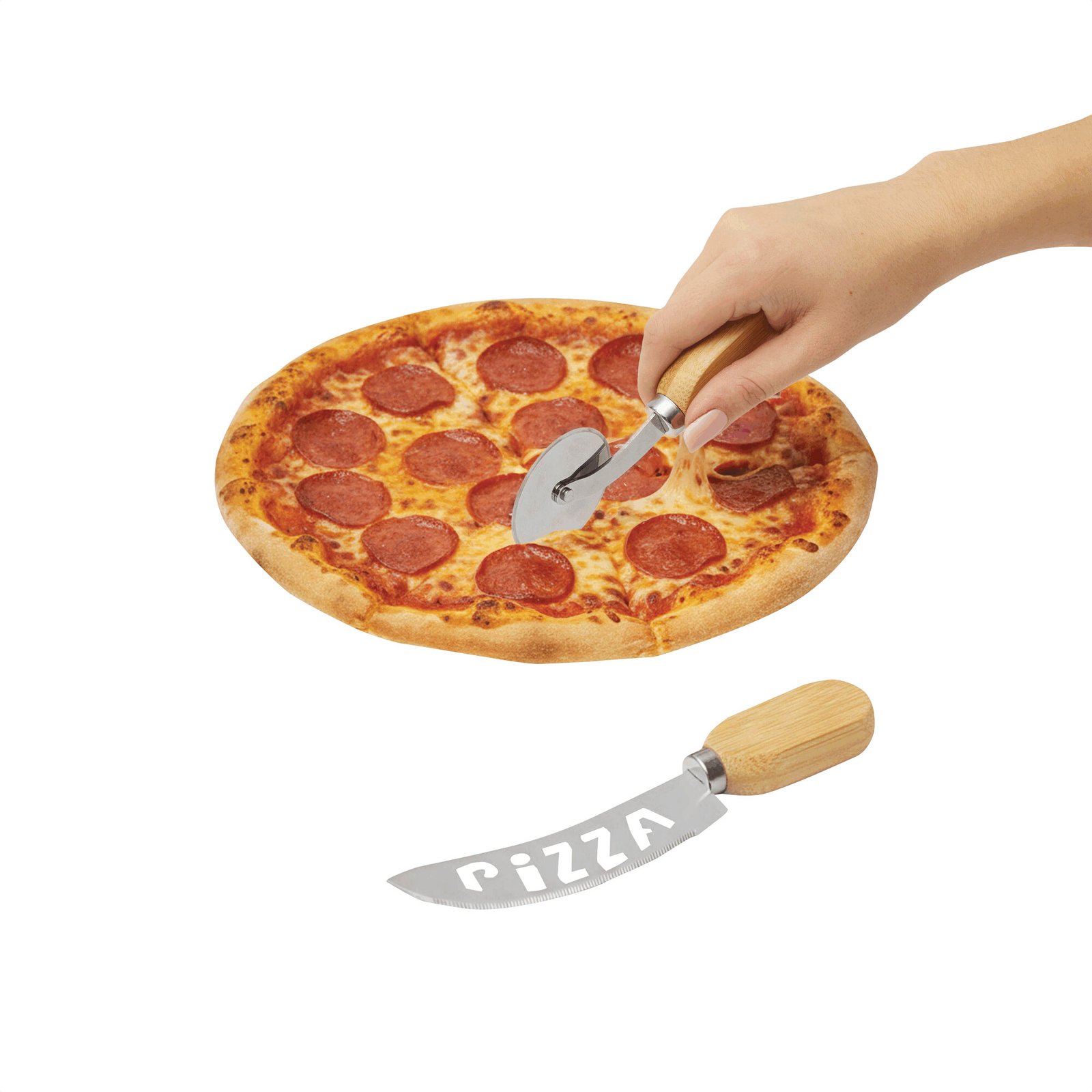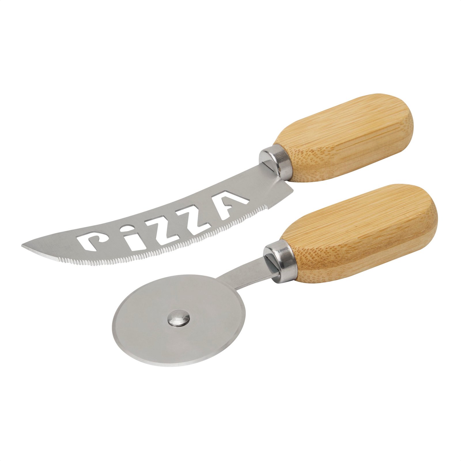 Set de corte "NAPOLE" (SKU T792) para regalos corporativos y campañas de empresa. Compatible con estrategias de regalos corporativos, incluyendo soluciones en textil, sublimación y DTF. Un detalle único para sorprender.Set de corte para pizzas. Incluye 2 utensilios: Cuchillo curvo con hoja dentada y perforada para un corte limpio y eficaz; y una cuchilla circular giratoria para un corte simple y veloz, ambos con mango de bambú. Presentación en caja de regalo kraft.Medidas: 17,2 x 4 x 1,6 cm. (cuchillo curvo) y 13,6 x 4,8 x 1,6 cm. (cuchilla giratoria) Material: Acero inoxidable 420 y bambú. Cotiza formato corporativo con personalización de logo y cobertura en Chile.