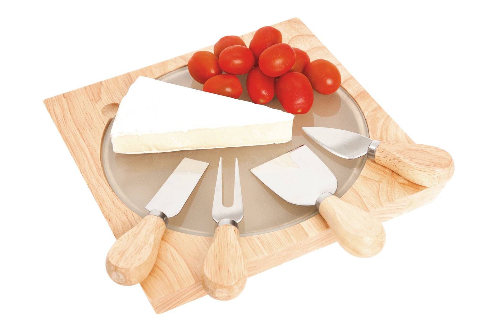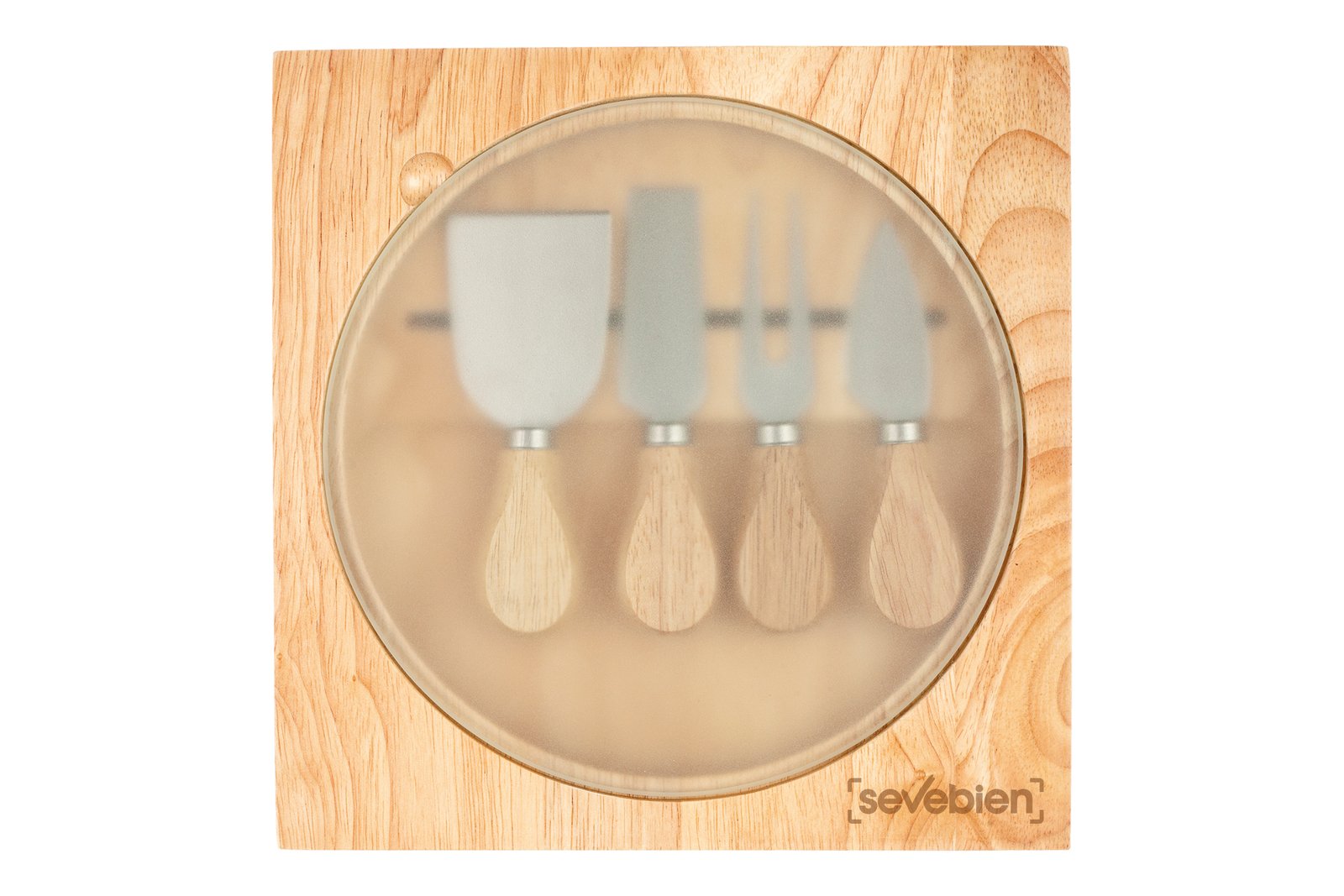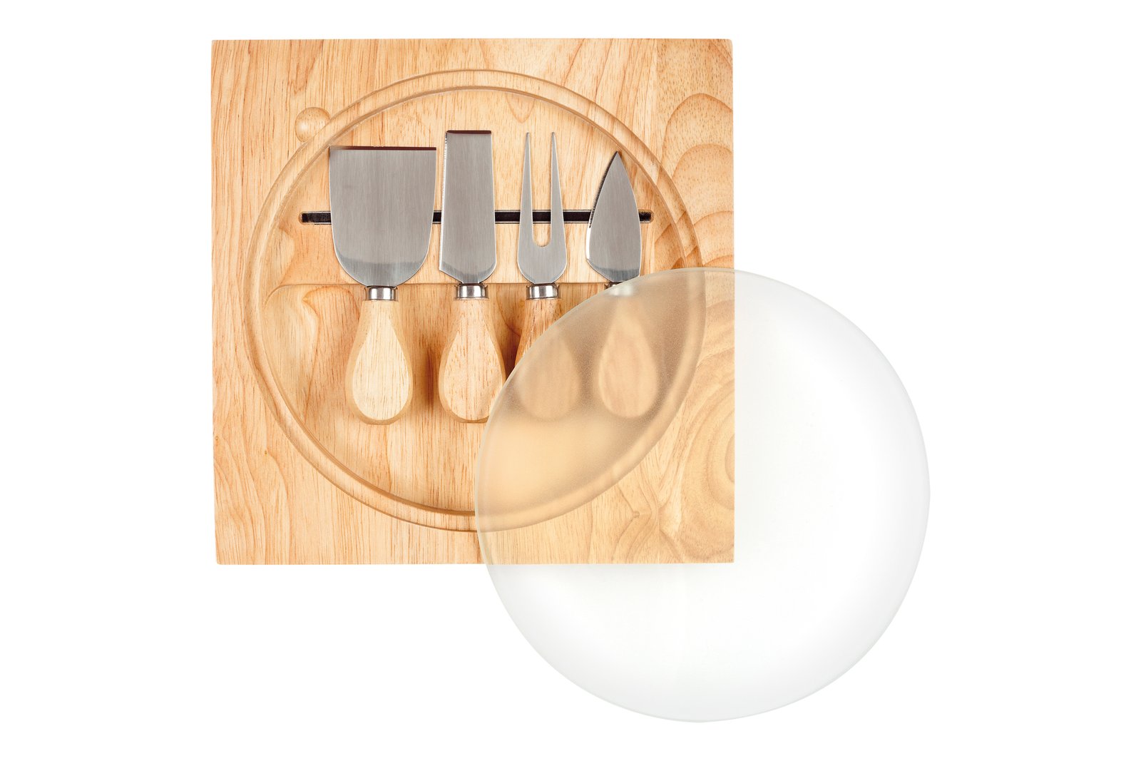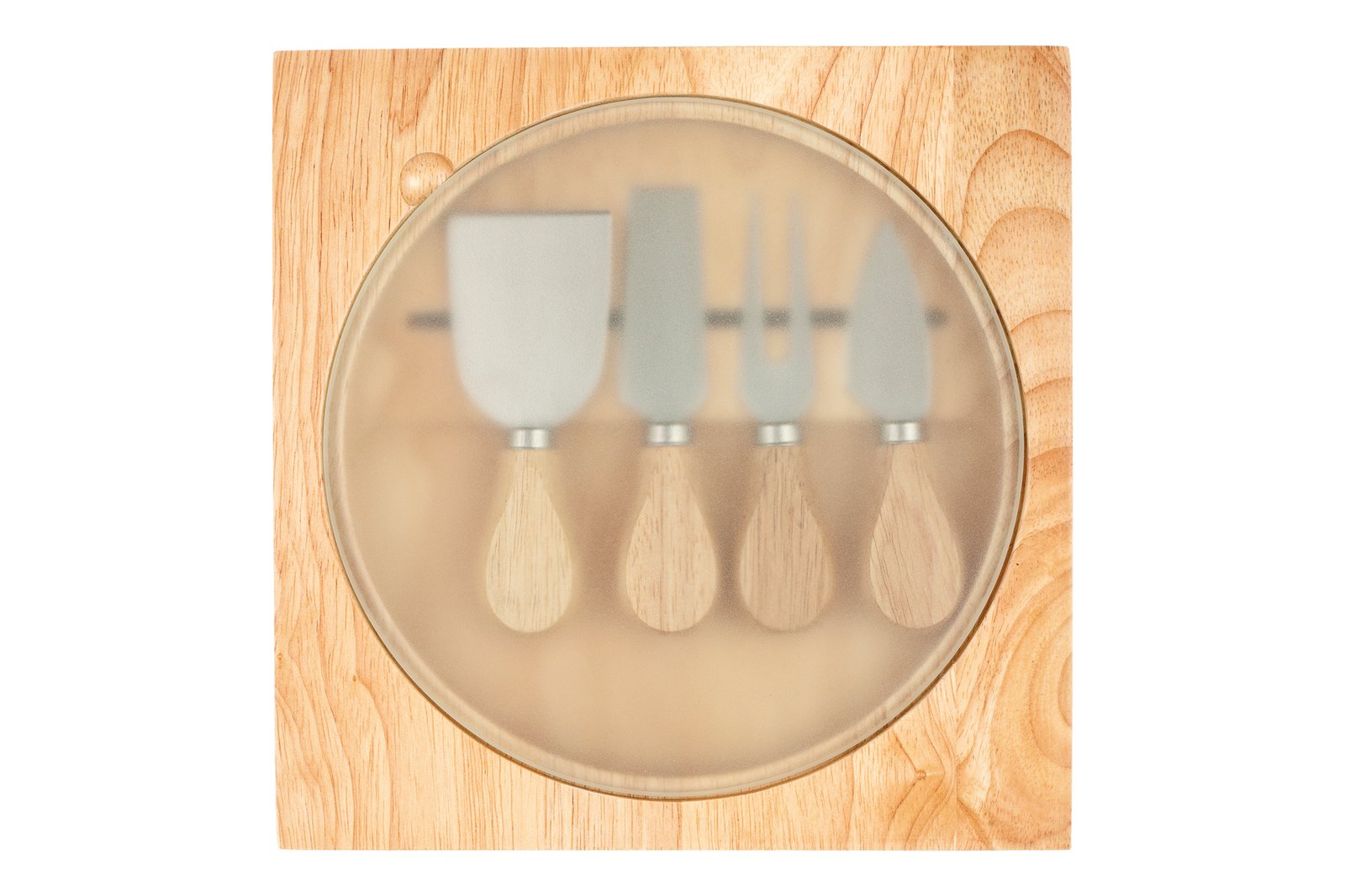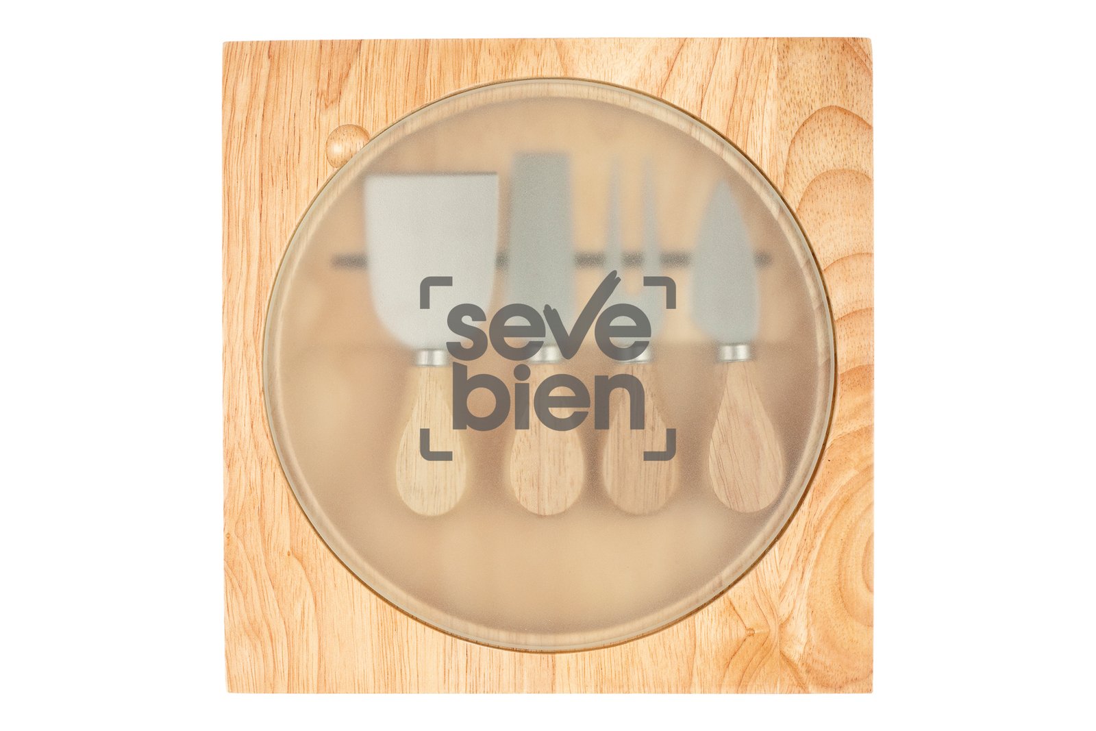 TABLA PARA QUESOS "SUIZA" (SKU T466) para regalos corporativos y campañas de empresa. Compatible con estrategias de regalos corporativos, incluyendo soluciones en textil, sublimación y DTF. 23 x 23 x 2,5 cm. Madera. Tabla para quesos. En la parte interna contiene imán que sostiene 4 utensilios de acero inoxidable y mango de madera. Tabla circular de vidrio templado Ø 20 cm. Presentación en caja de regalo. Cotiza formato corporativo con personalización de logo y cobertura en Chile.