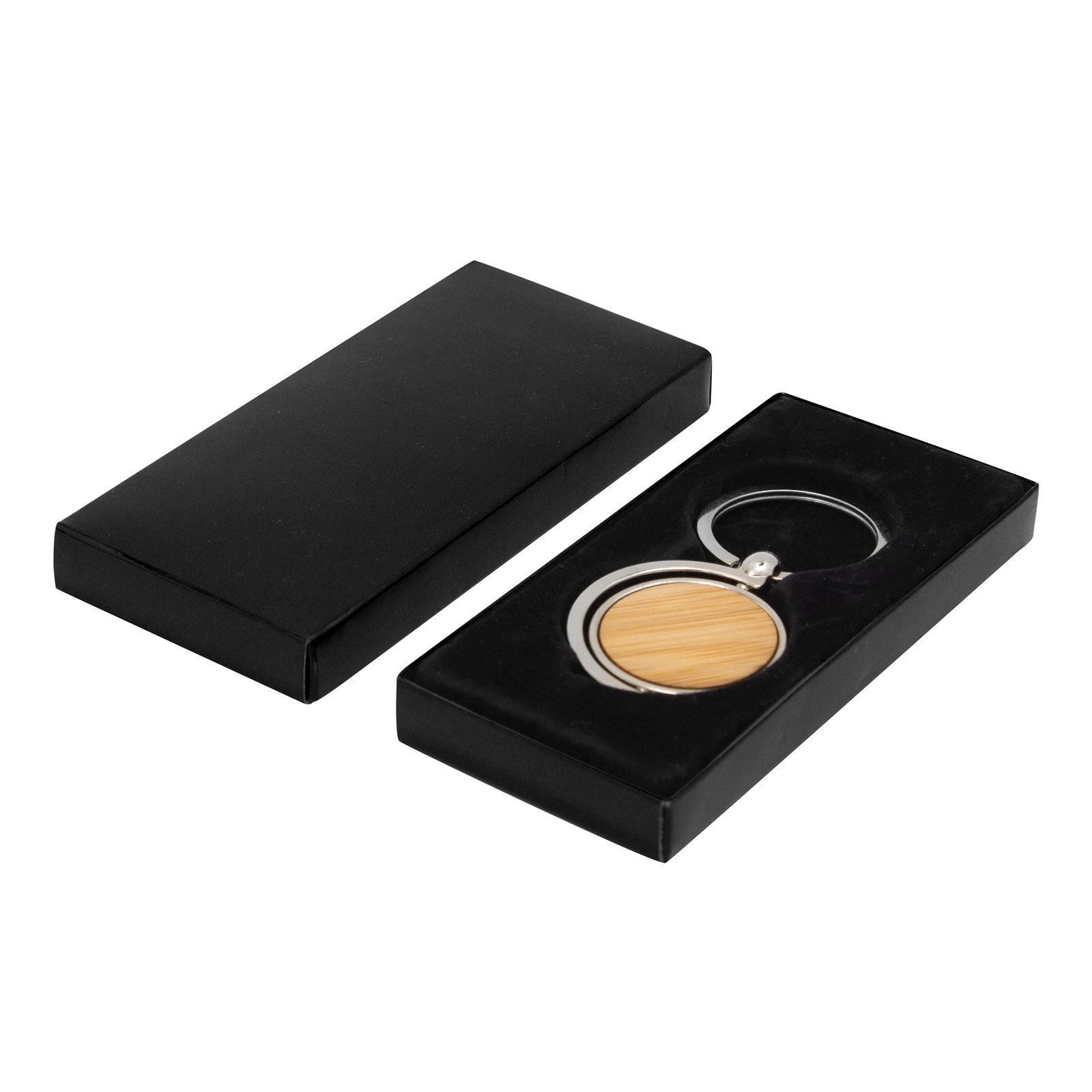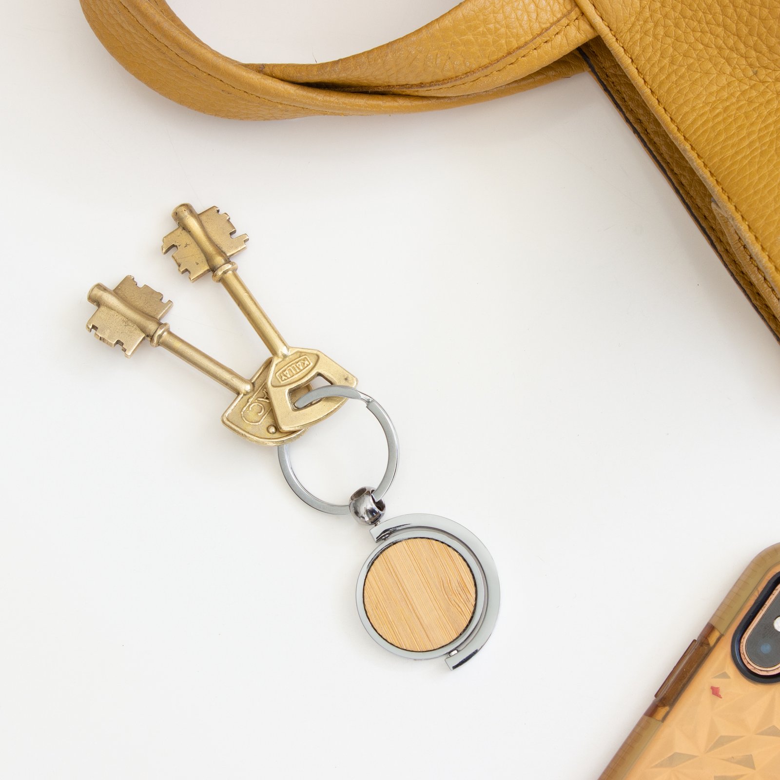Llavero de bambú "SPIN" (SKU T648) para regalos corporativos y campañas de empresa. Compatible con estrategias de regalos corporativos, incluyendo soluciones en textil, sublimación y DTF. 7,5 x 3,5 x 0,4 cm. Llavero circular de bambú con detalles metálicos. Estructura giratoria 360°. Presentación en caja de regalo. Cotiza formato corporativo con personalización de logo y cobertura en Chile.