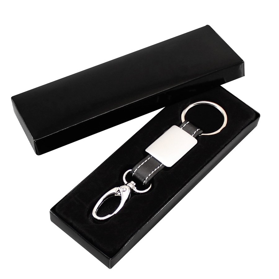 Llavero Metal Eco-cuero Technic (SKU K30) para regalos corporativos y campañas de empresa. Compatible con estrategias de regalos corporativos, incluyendo soluciones en textil, sublimación y DTF. Llavero Metal Eco-cuero modelo "Technic". Presentación en estuche laminado negro con cuna aterciopelada. • Tamaño: 10 x 2.2 x 0.6 cm. • Colores: Eco-cuero Negro (08). • Sugerencia: Serigrafía. • Presentación: En estuche laminado negro con cuna aterciopelada. Cotiza formato corporativo con personalización de logo y cobertura en Chile.