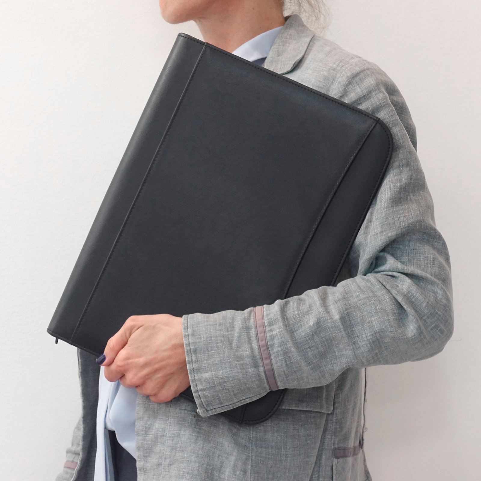 Carpeta con cierre "ELEVATOR" (SKU C557) para regalos corporativos y campañas de empresa. Prioridad comercial en líneas de textil, sublimación y DTF para branding corporativo. 26 x 35 x 3 cm. Poliuretano. Carpeta con cierre. Contiene 1 bloc de 20 hojas lisas tamaño A4. Porta bolígrafo. Bolsillo externo. Compartimentos internos para 7 tarjetas. Sobre con fuelle y bolsillo interno con cierre. Diseñada con materiales que poseen algunos beneficios ambientales sobre el cuero genuino, ya que no requiere de animales para su fabricación y además, no necesita ser químicamente curtido. Cotiza formato corporativo con personalización de logo y cobertura en Chile.
