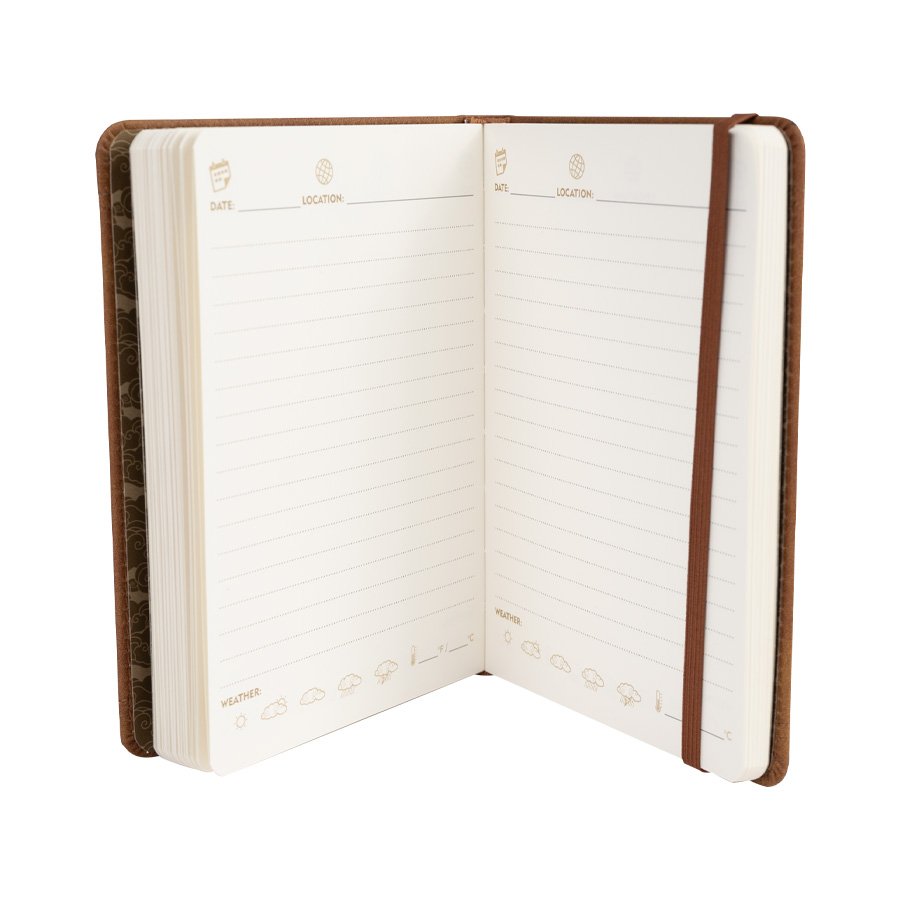 Agenda de Viaje "TRAVEL JOURNAL" (SKU N99) para regalos corporativos y campañas de empresa. Compatible con estrategias de regalos corporativos, incluyendo soluciones en textil, sublimación y DTF. Agenda de Viaje tamaño B6 modelo "TRAVEL JOURNAL", con tapas duras forradas en PU eco-cuero, interior 90 finas hojas amarillas lineadas, con datos relevantes para tus viajes. Contiene elástico para cierre. Y banda separador de hojas color marrón. Cotiza formato corporativo con personalización de logo y cobertura en Chile.