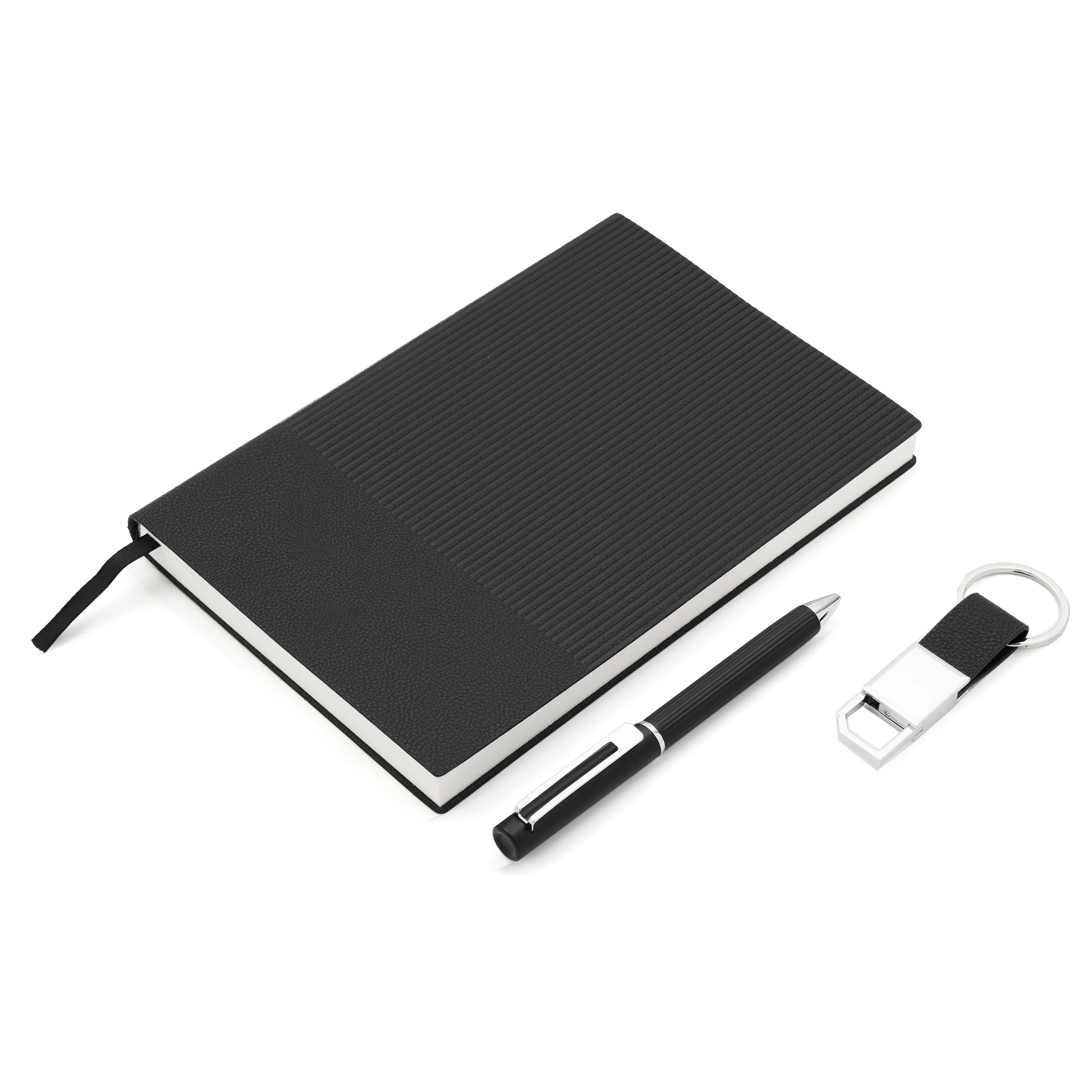 Set Atenea (SKU 400) para regalos corporativos y campañas de empresa. Compatible con estrategias de regalos corporativos, incluyendo soluciones en textil, sublimación y DTF. Elegante set que incluye un cuaderno A5 rayado (80 g, 100 hojas, 21 x 14 cm), un lapiz de tinta azul y un llavero, todo presentado en una caja negra mate con correas para transportar fácilmente. Es un producto ideal para regalar en eventos corporativos o fechas especiales. TAHG. Cotiza formato corporativo con personalización de logo y cobertura en Chile.