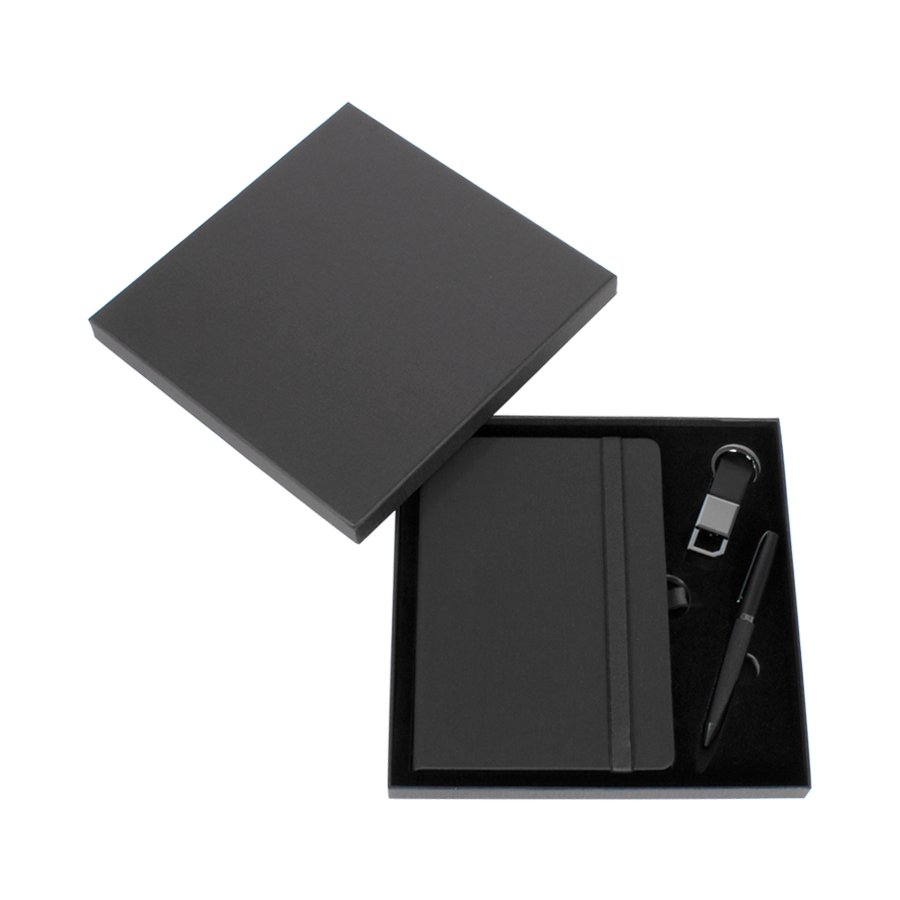 Set Ejecutivo de Escritorio (SKU N82) para regalos corporativos y campañas de empresa. Compatible con estrategias de regalos corporativos, incluyendo soluciones en textil, sublimación y DTF. Set Ejecutivo de Escritorio. Incluye cuaderno negro tapa dura texturada, tamaño A5 de 14.6 x 21 . 1.5 cm con 96 hojas lineadas amarillo claro, cierre elasticado negro, llavero ejecutivo con mosquetón, anillo y cuerpo metálico cromado y cinta de PU texturado y finalmente Bolígrafo ejecutivo metálico, cuerpo negro opaco y escritura azul. Presentación en elegante caja con tapa, de cartón piedra texturado negro, con interior cama de terciopelo negro, con troquelados para cada elemento. Un gran regalo para nivel ejecutivo. • Tamaño: 23.8… Cotiza formato corporativo con personalización de logo y cobertura en Chile.