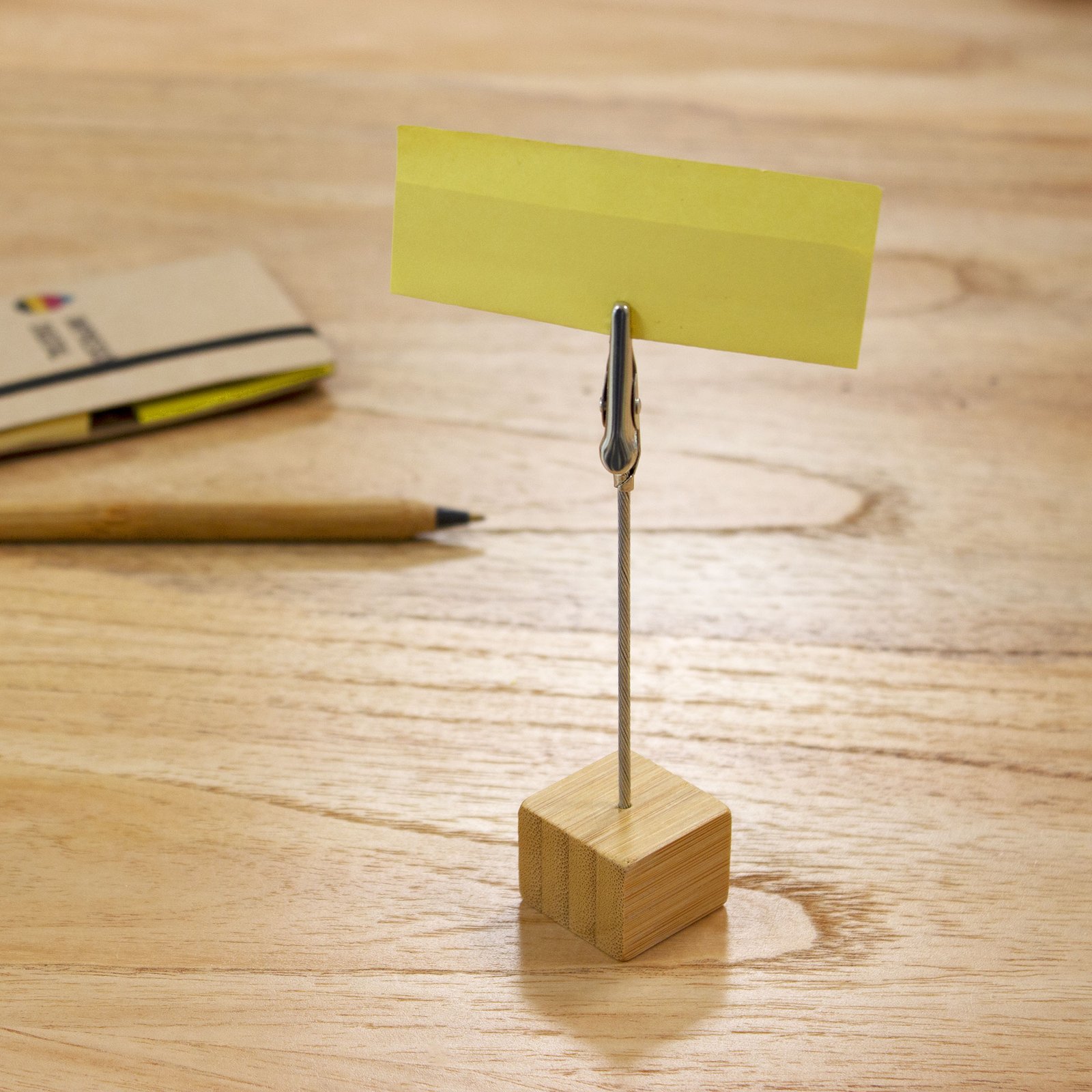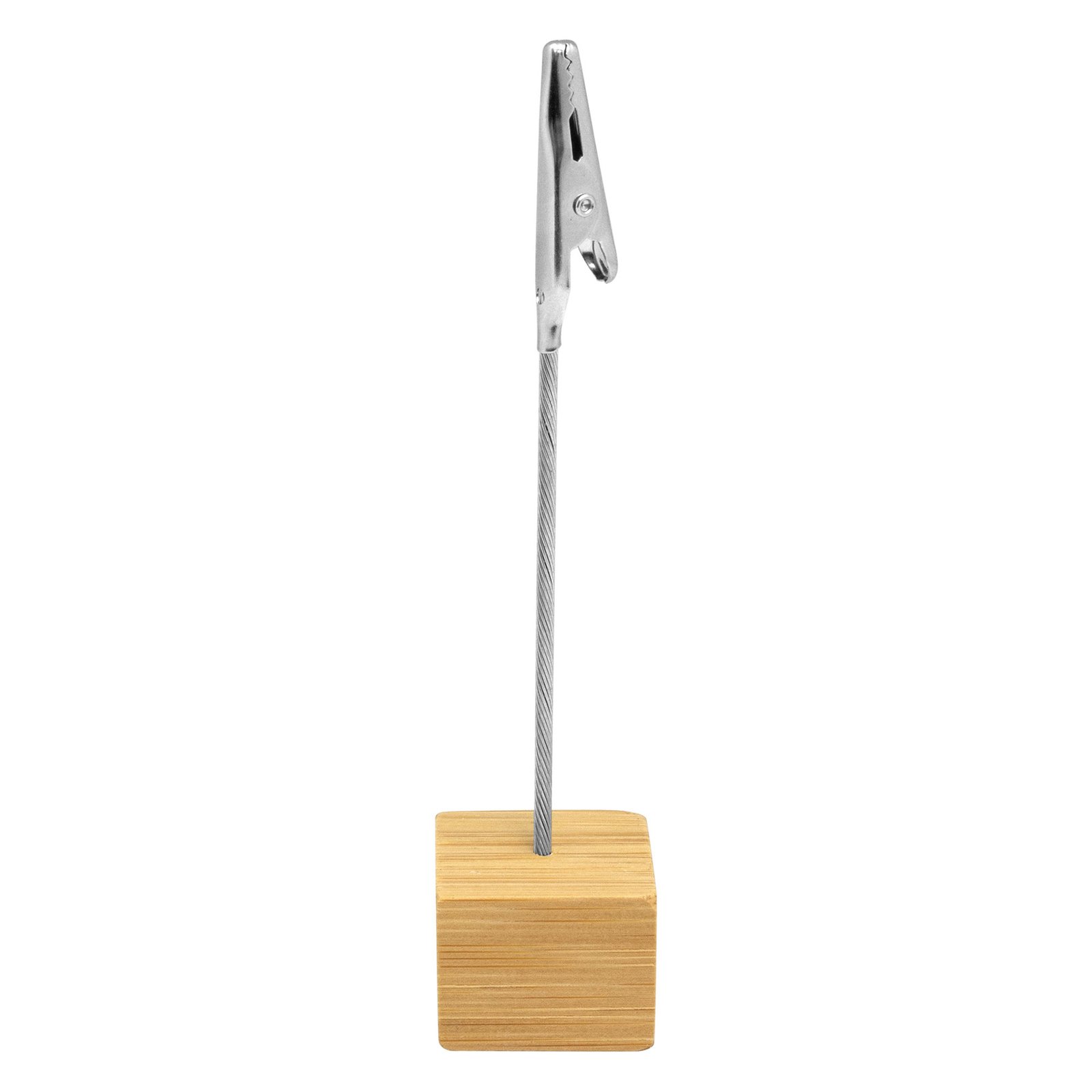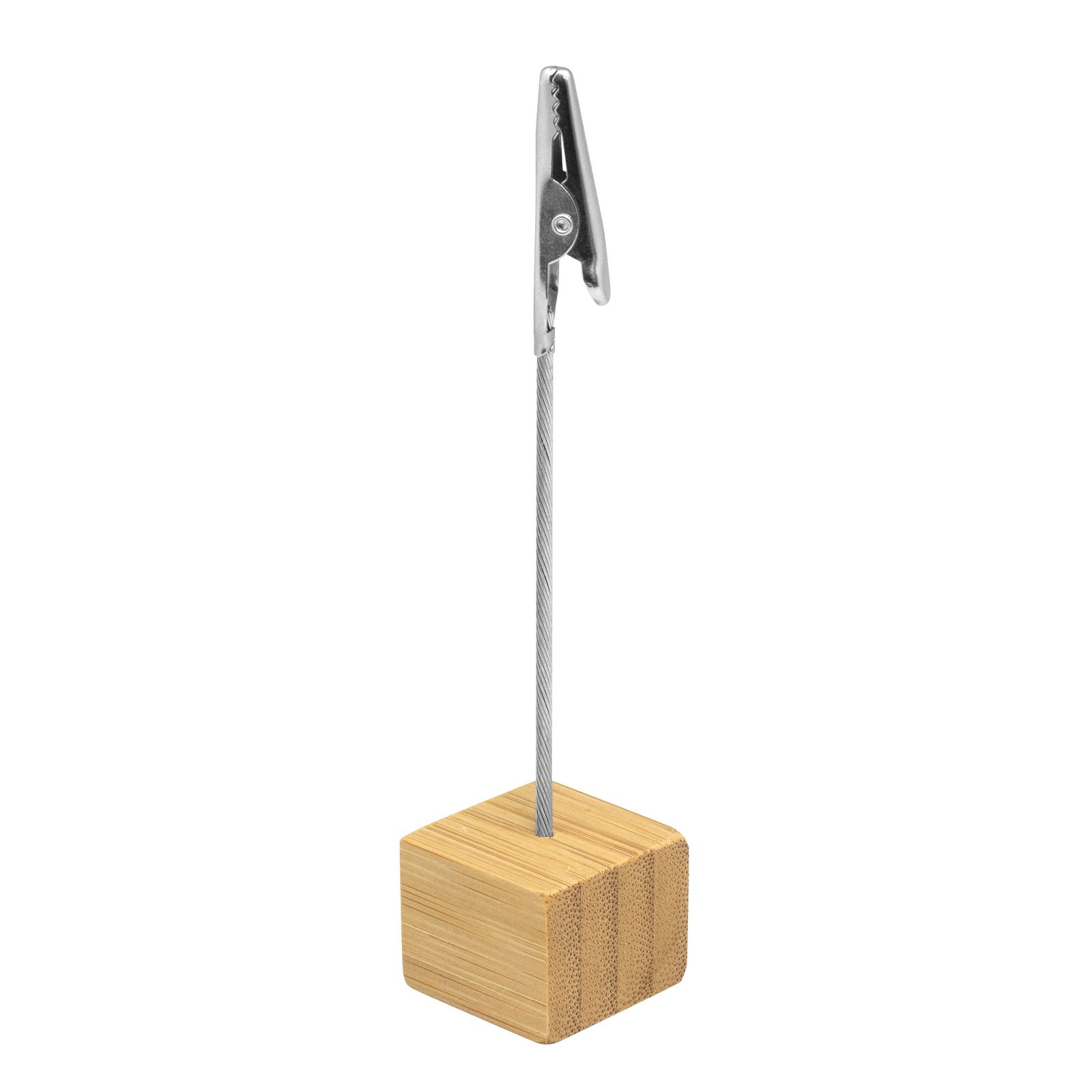 Memo clip de escritorio "BAMBSTICK" (SKU T630) para regalos corporativos y campañas de empresa. Compatible con estrategias de regalos corporativos, incluyendo soluciones en textil, sublimación y DTF. 2,5 x 2,5 x 2,5 cm. Alto 11,5 cm Bambú y metal. Memo clip de escritorio con base cúbica en bambú. Broche pinza cocodrilo de metal. Práctico, útil y transportable. Cotiza formato corporativo con personalización de logo y cobertura en Chile.
