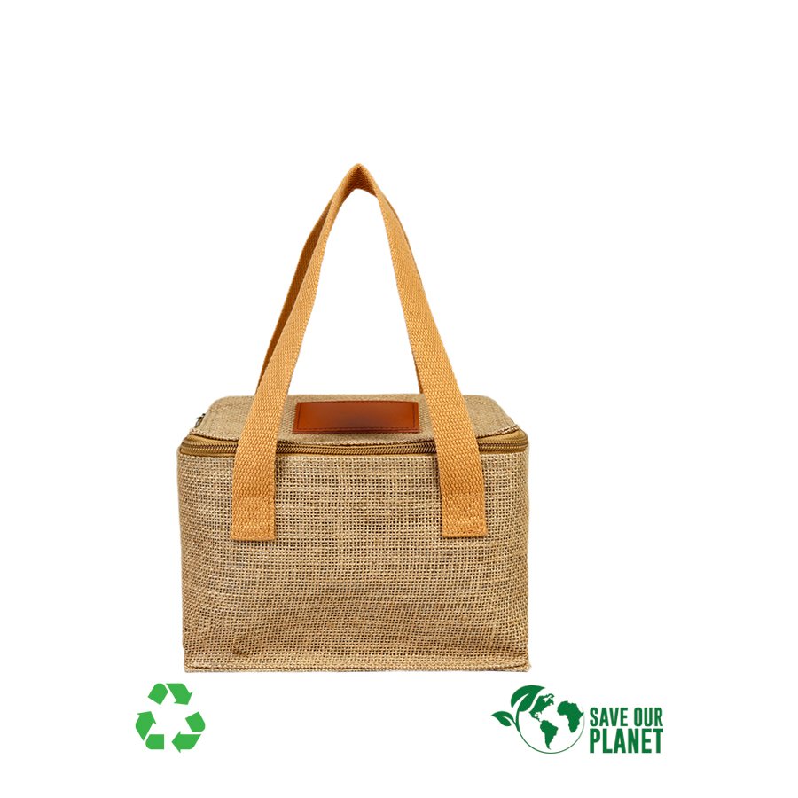 Cooler bag Yute 4L (SKU G35) para regalos corporativos y campañas de empresa. Compatible con estrategias de regalos corporativos, incluyendo soluciones en textil, sublimación y DTF. Bolso cooler con exterior de Yute e interior térmico aislante de PEVA y acolchado con esponja PE FOAM. En la tapa, sección superior del cooler, viene con una ventana cosida de eco-cuero, para aplicar logo de manera más elegante. •Tamaño: 20 x 15.5 x 14 cm. • Capacidad: 4 L • Colores: Natural (11) • Sugerencia de Impresión: Serigrafía, Bordado, Pantógrafo, Grabado Láser. • Presentación: En bolsa plástica transparente. • Material: Yute, PEVA aislante, esponja PE FOAM Cotiza formato corporativo con personalización de logo y cobertura en Chile.