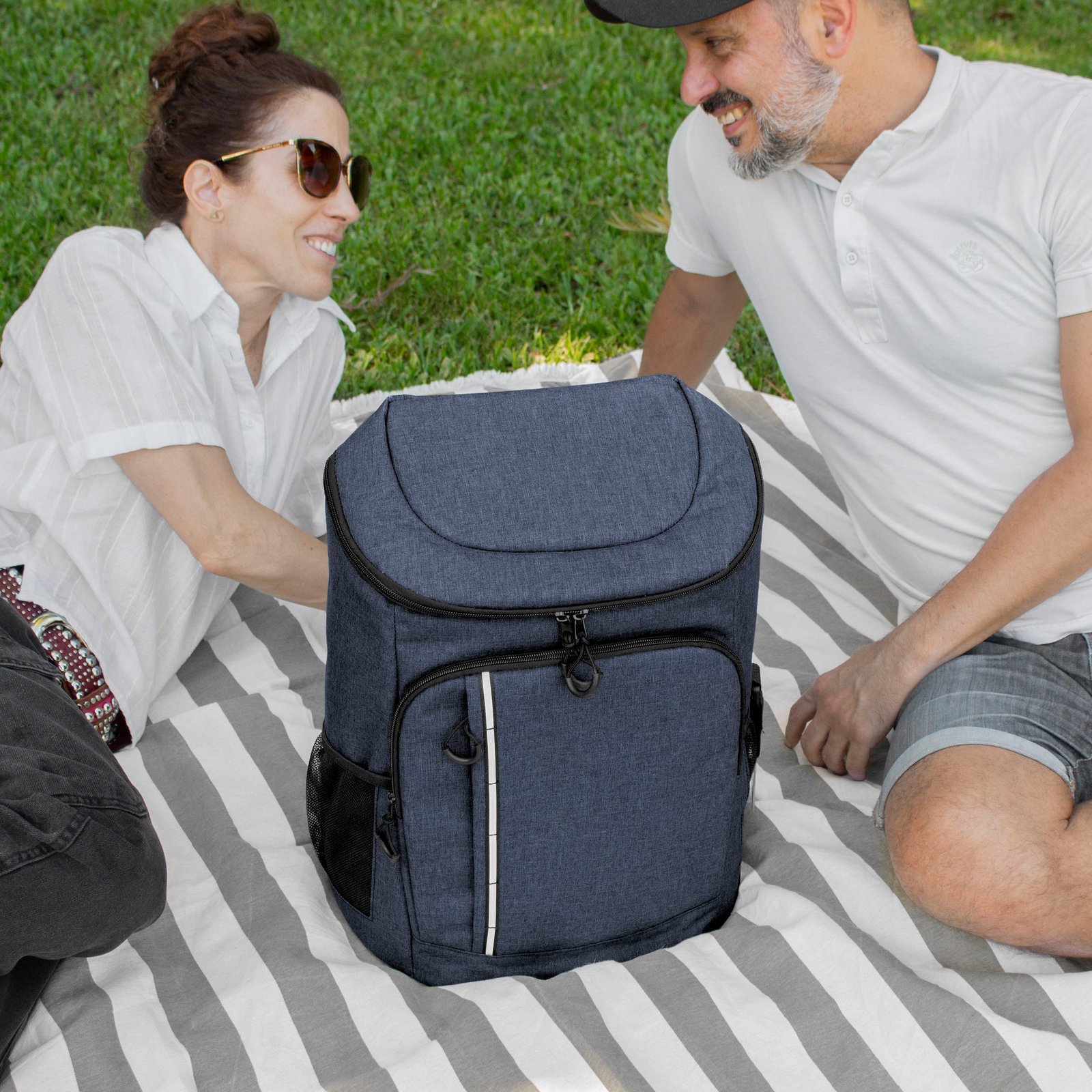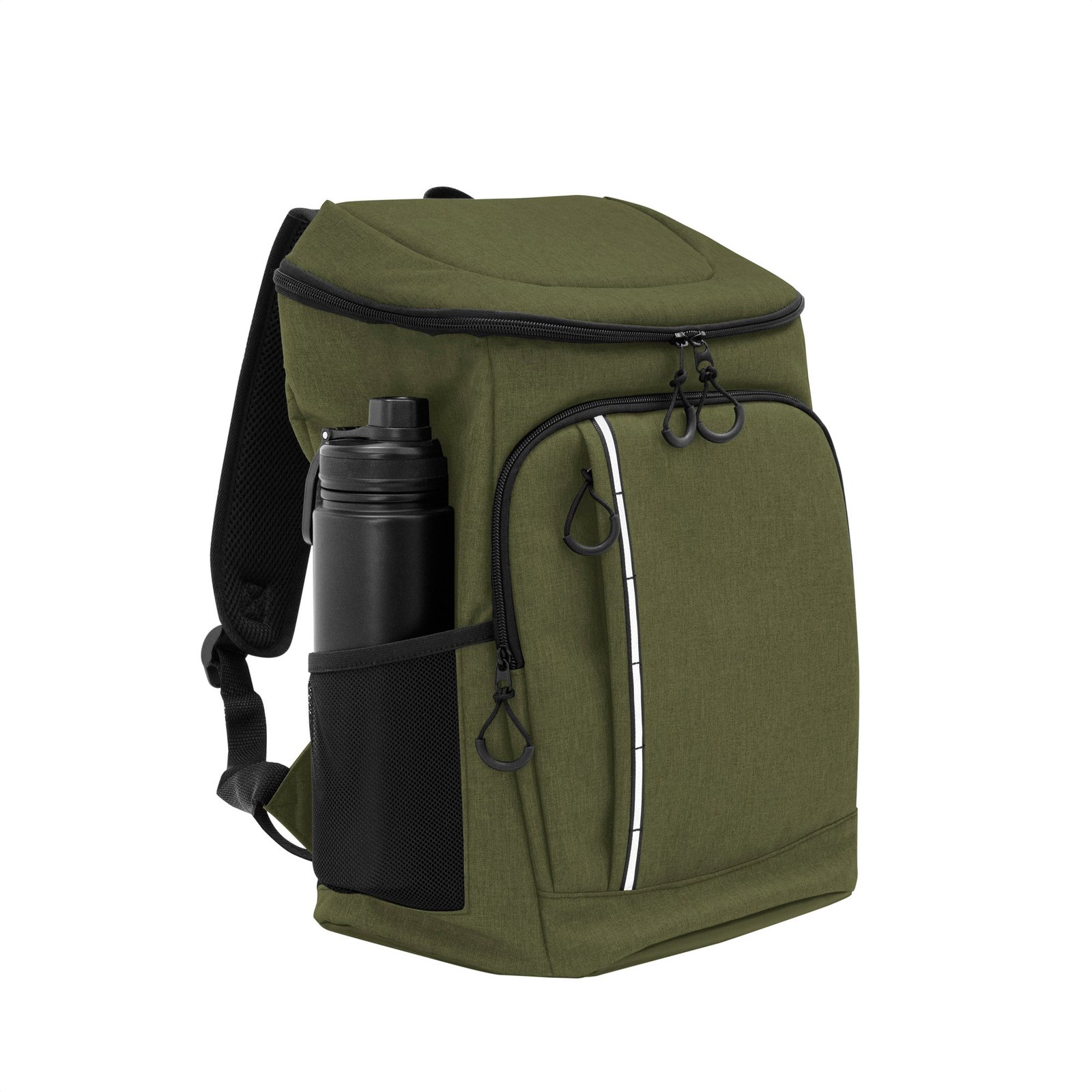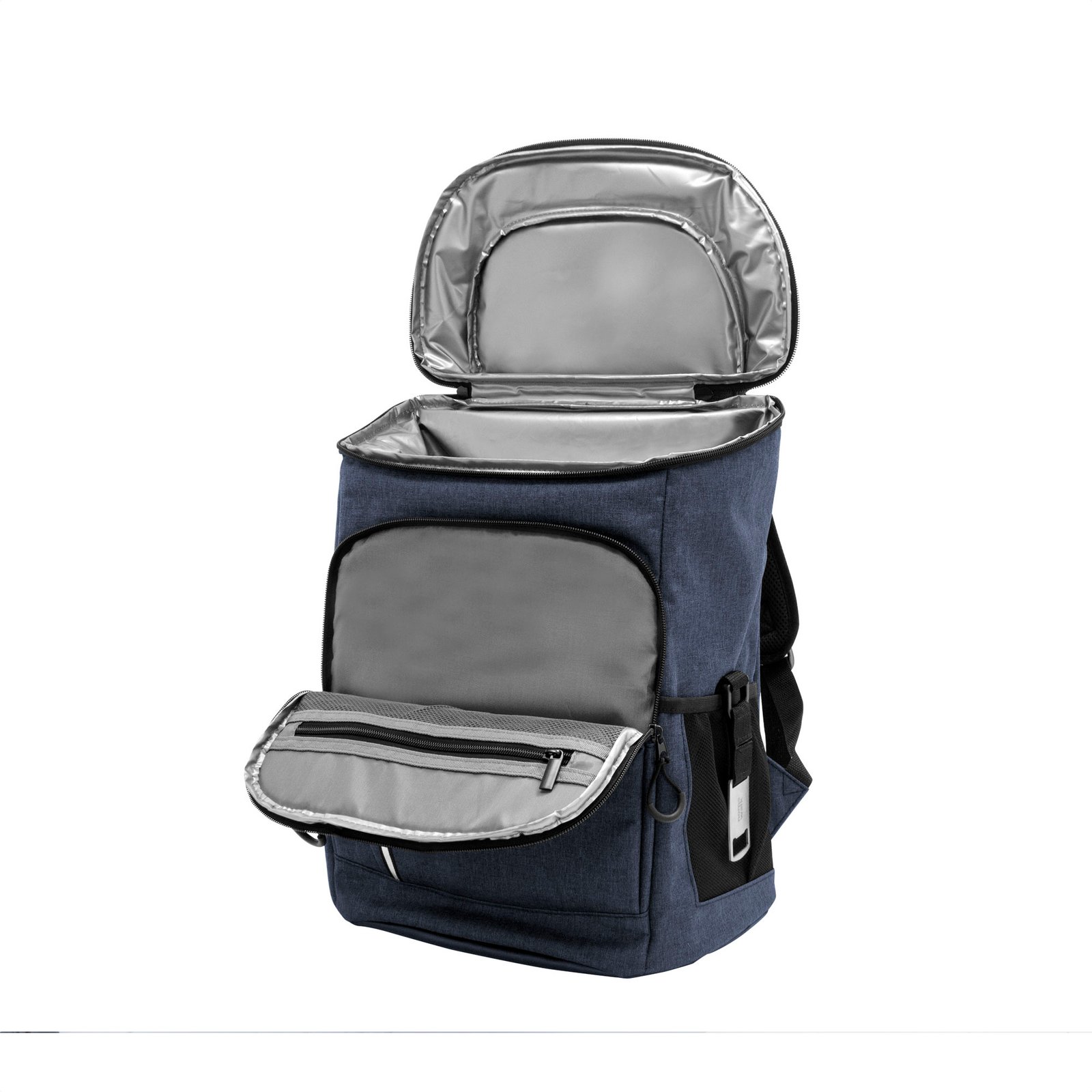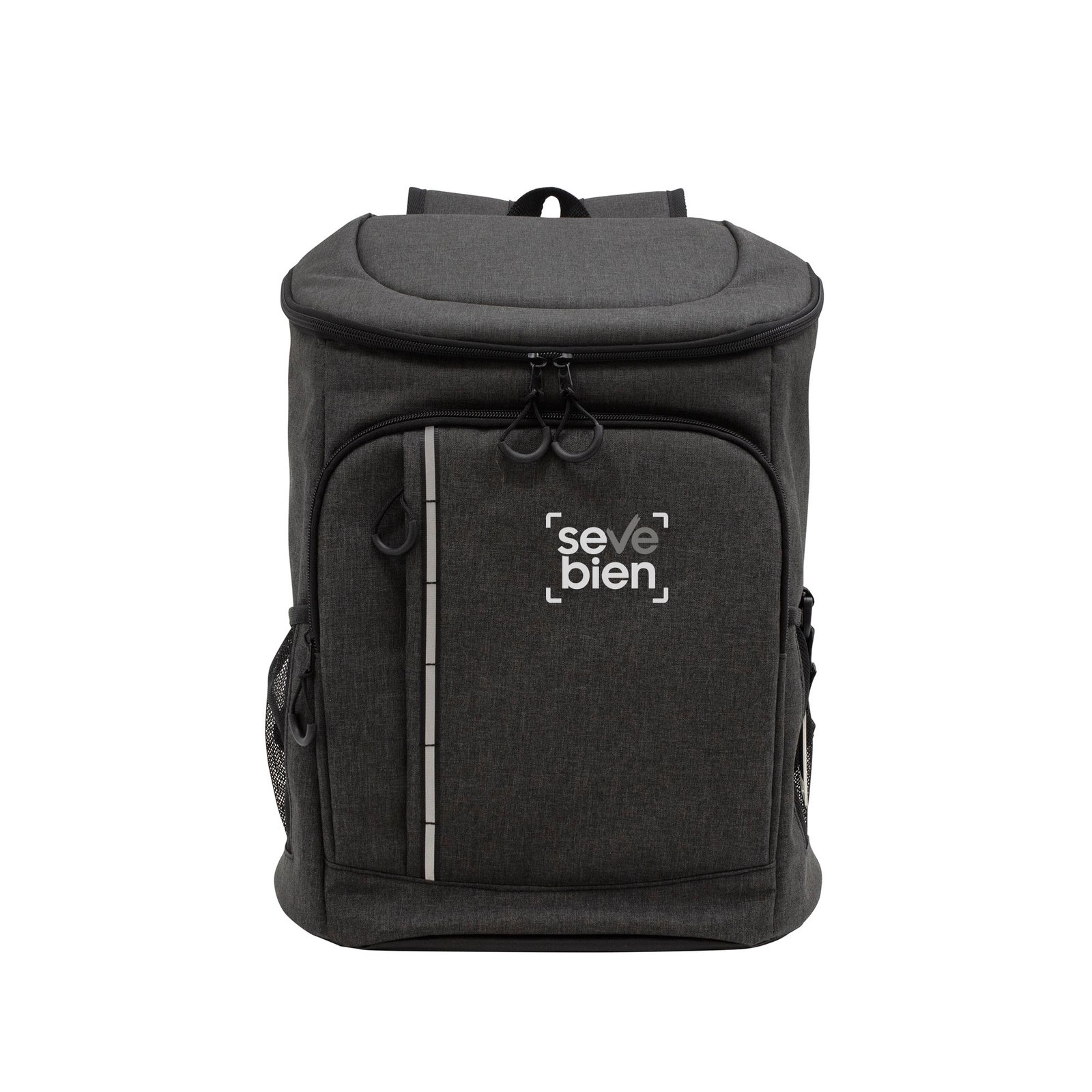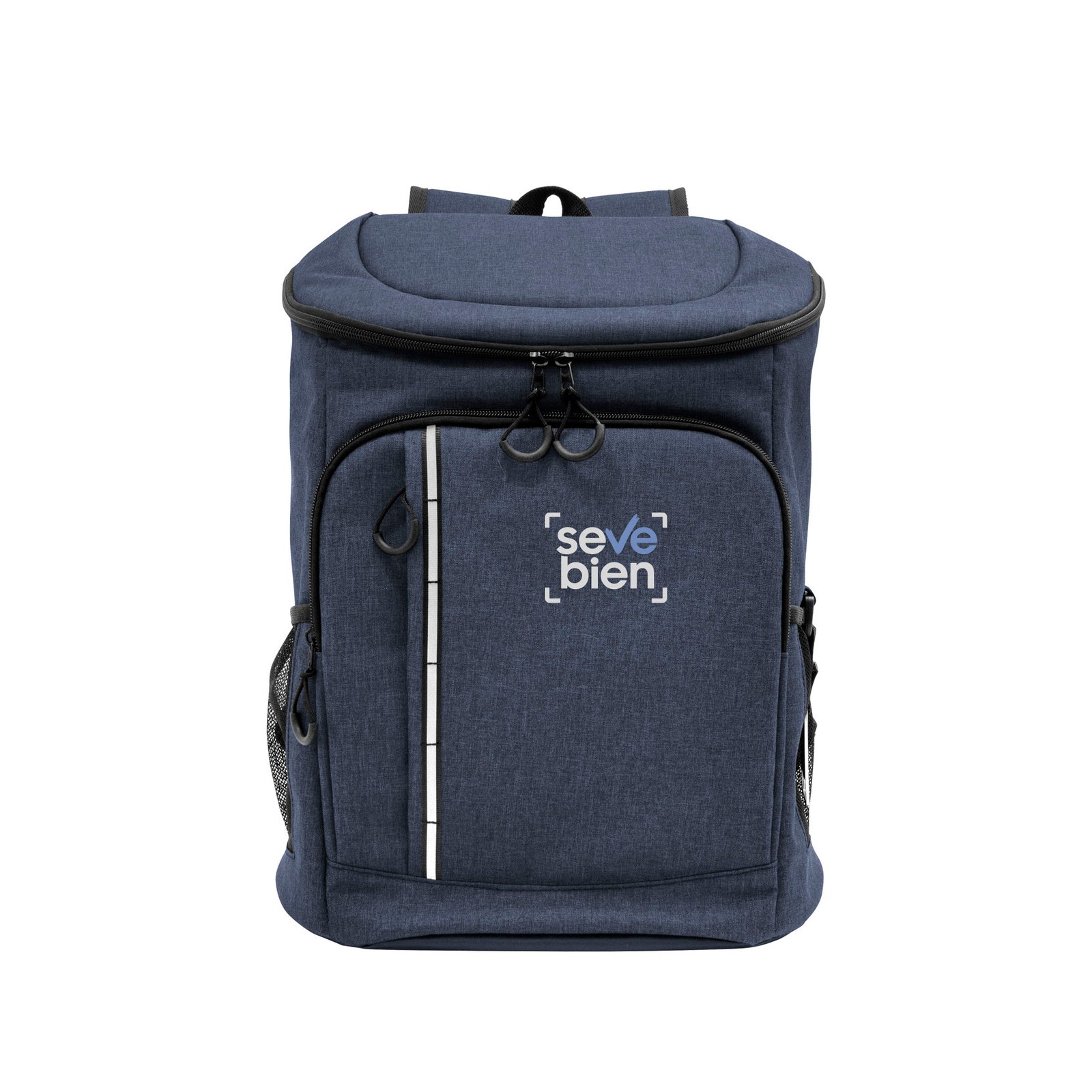 Mochila cooler "DELTA" (SKU K11) para regalos corporativos y campañas de empresa. Compatible con estrategias de regalos corporativos, incluyendo soluciones en textil, sublimación y DTF. 43 x 29 x 18 cm. Capacidad 18 litros aprox. Poliéster Wulong 300D + Interior forrado en PEVA color plata con relleno de espuma de PE. Mochila cooler. Compartimento principal con cierre en la parte superior. Compartimento frontal con cierre, bolsillo interno de red con cierre y bolsillo externo vertical con cierre y banda reflectante. Dos bolsillos laterales de red multipropósito. Incluye destapador de botellas de acero inoxidable (6,3 x 3,3 cm) extraíble. Correas regulables acolchadas. Cierres metálicos. Tiradores de cierre plásticos… Cotiza formato corporativo con personalización de logo y cobertura en Chile.