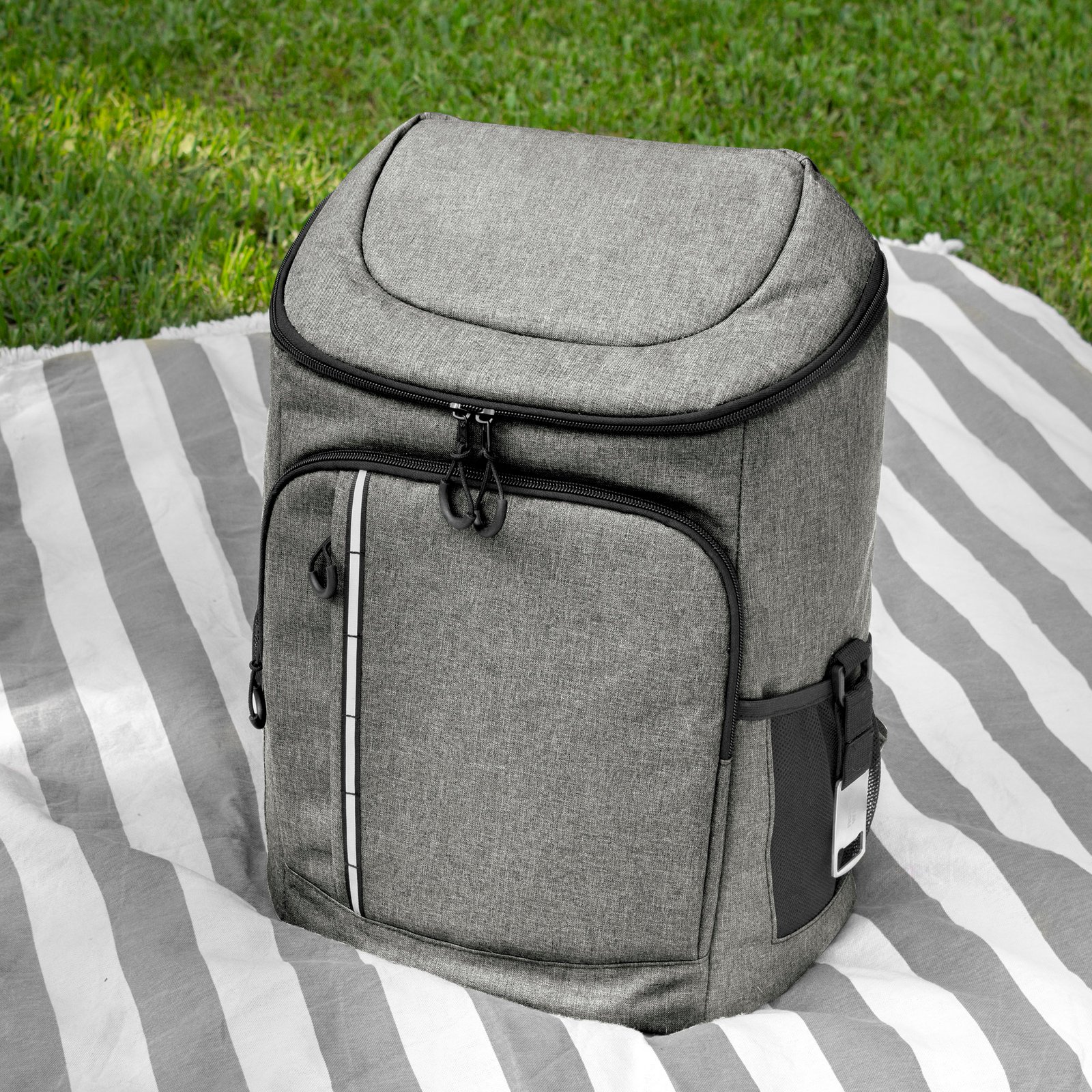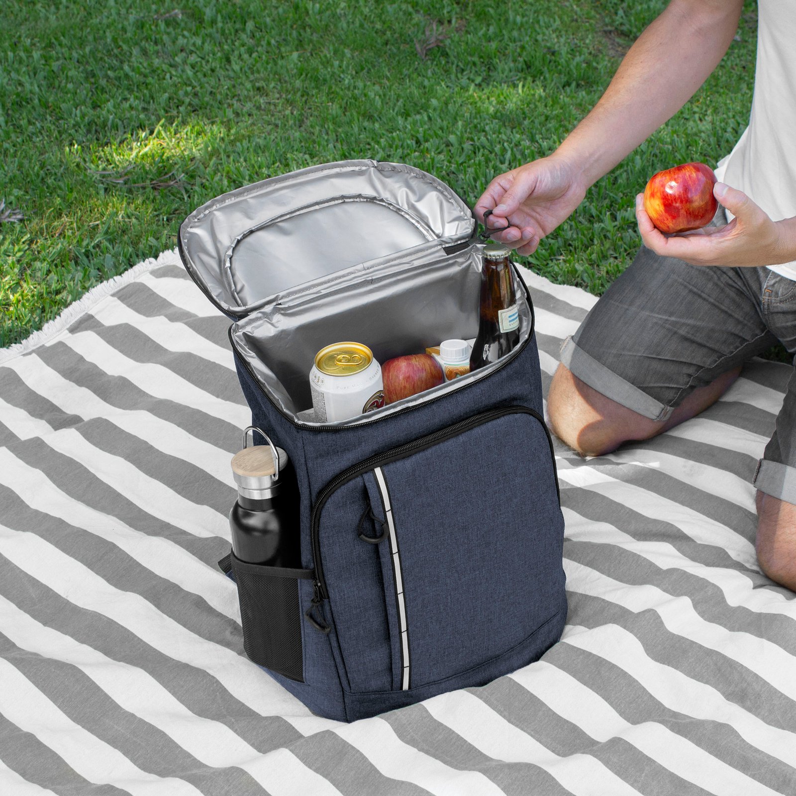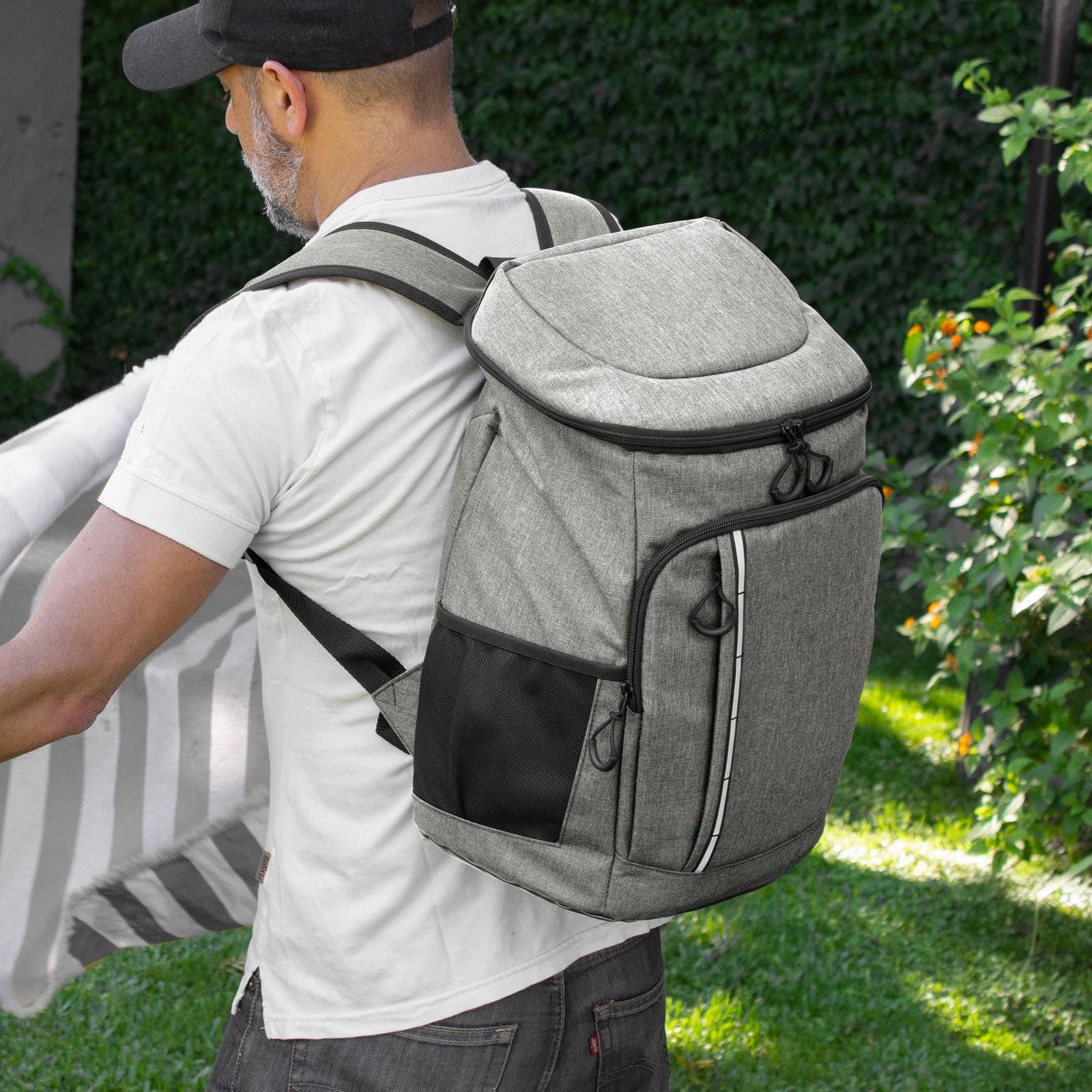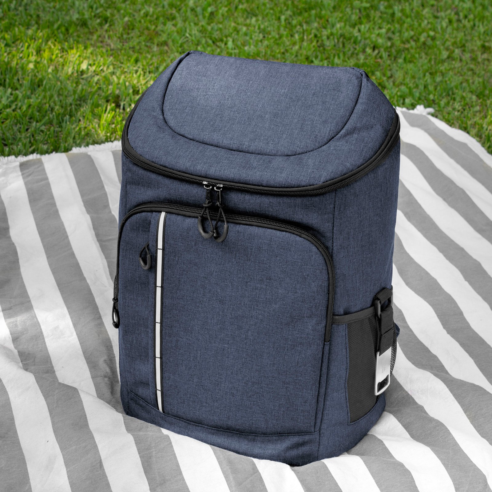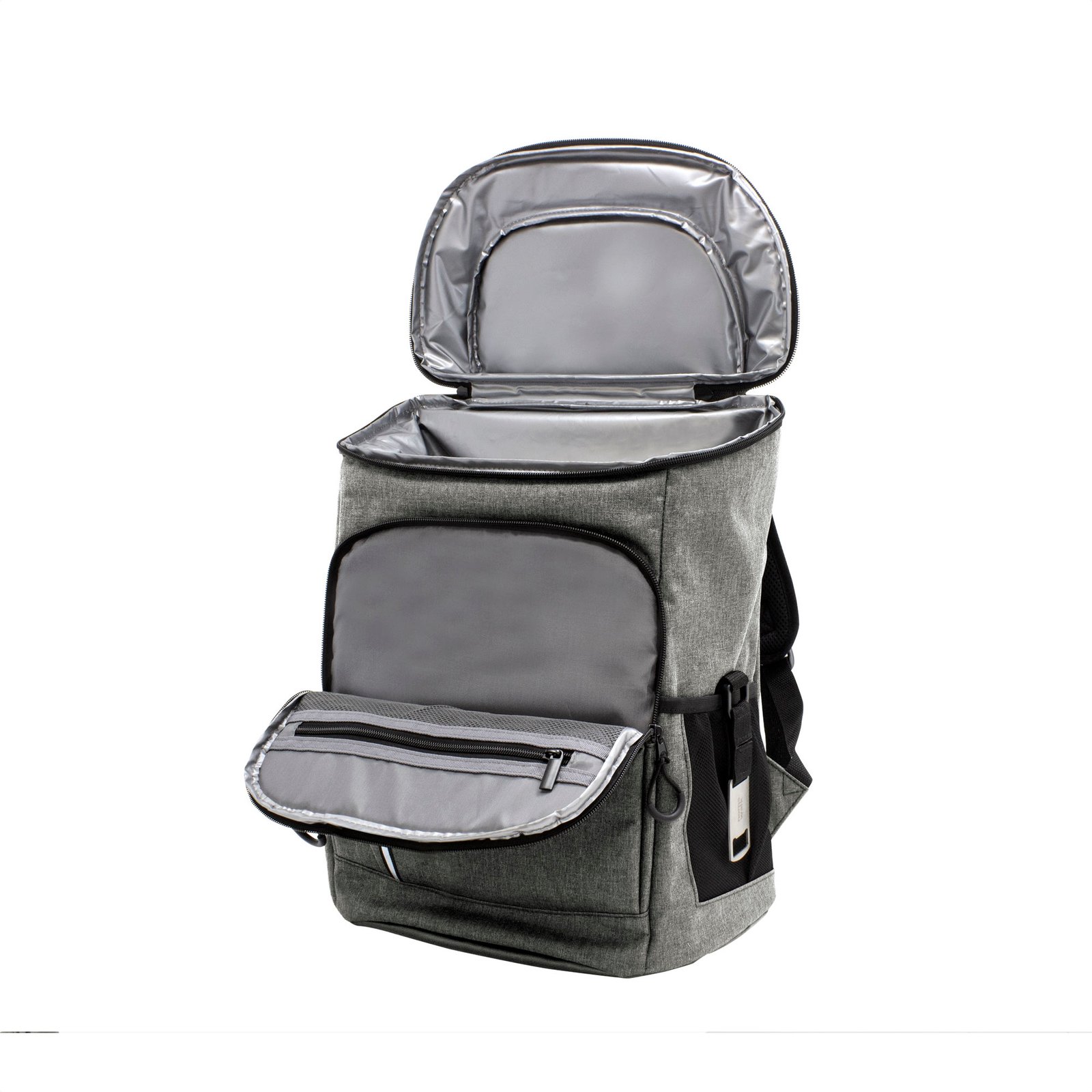 Mochila cooler "DELTA" (SKU K11) para regalos corporativos y campañas de empresa. Compatible con estrategias de regalos corporativos, incluyendo soluciones en textil, sublimación y DTF. 43 x 29 x 18 cm. Capacidad 18 litros aprox. Poliéster Wulong 300D + Interior forrado en PEVA color plata con relleno de espuma de PE. Mochila cooler. Compartimento principal con cierre en la parte superior. Compartimento frontal con cierre, bolsillo interno de red con cierre y bolsillo externo vertical con cierre y banda reflectante. Dos bolsillos laterales de red multipropósito. Incluye destapador de botellas de acero inoxidable (6,3 x 3,3 cm) extraíble. Correas regulables acolchadas. Cierres metálicos. Tiradores de cierre plásticos… Cotiza formato corporativo con personalización de logo y cobertura en Chile.