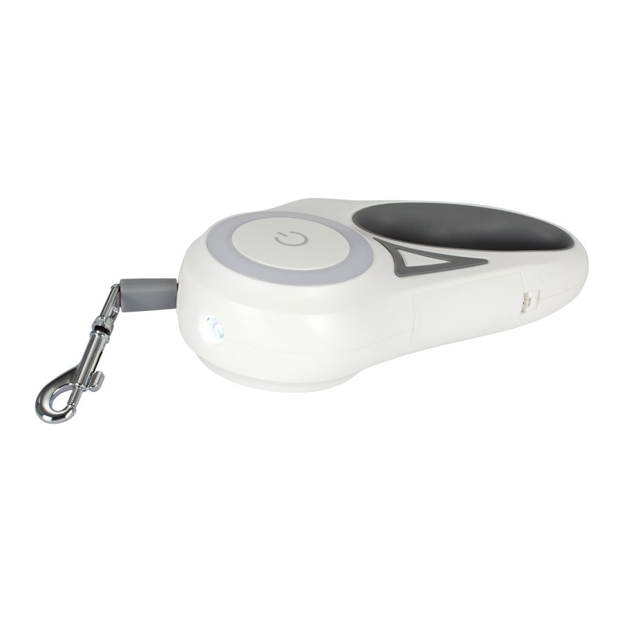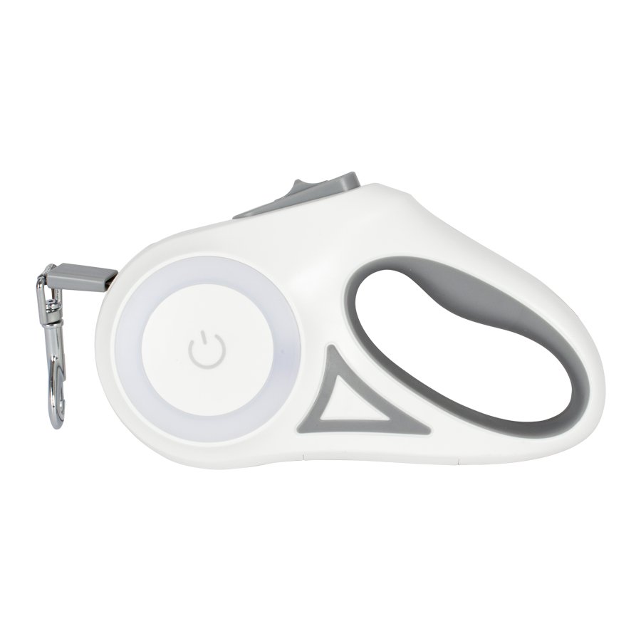 Correa extensible de 3mts para mascota, con linternas LED (SKU P52) para regalos corporativos y campañas de empresa. Compatible con estrategias de regalos corporativos, incluyendo soluciones en textil, sublimación y DTF. Correa extensible de 3mts para mascota, en plástico ABS blanco con detalles grises y correa de nylon color gris con sistema de traba. Contiene una linterna LED luz blanca + juego de luces LED de colores en círculo central. Usa 2 pilas AAA (no incluídas). Presentación en caja de cartón blanco de regalo. Cotiza formato corporativo con personalización de logo y cobertura en Chile.