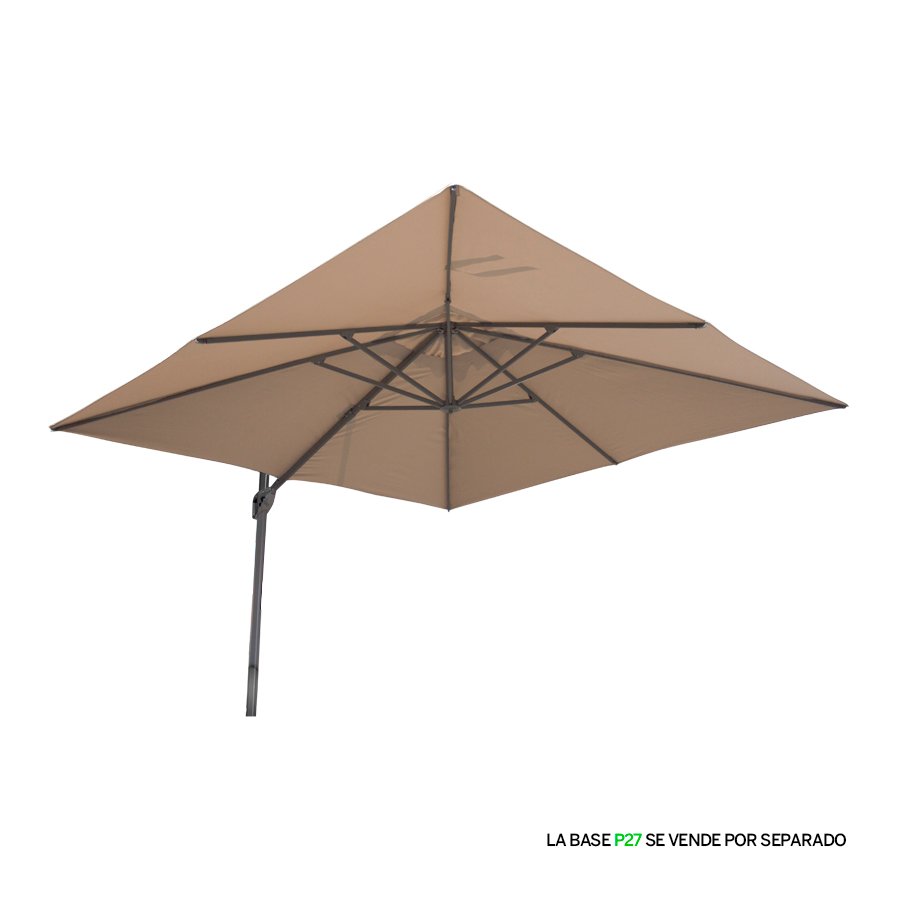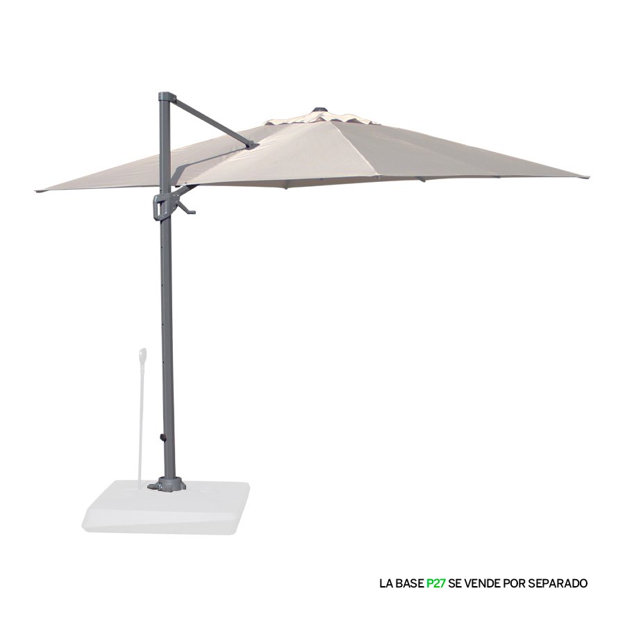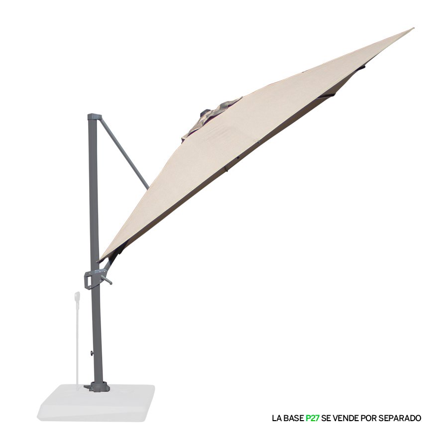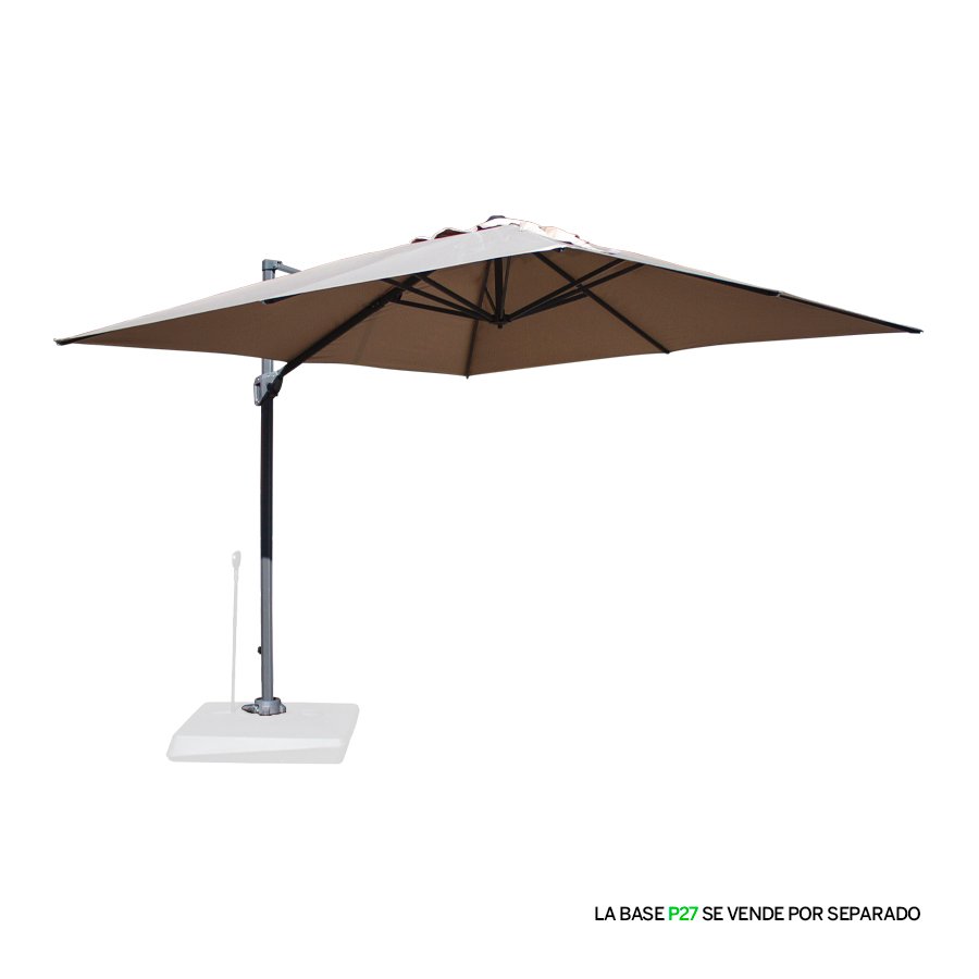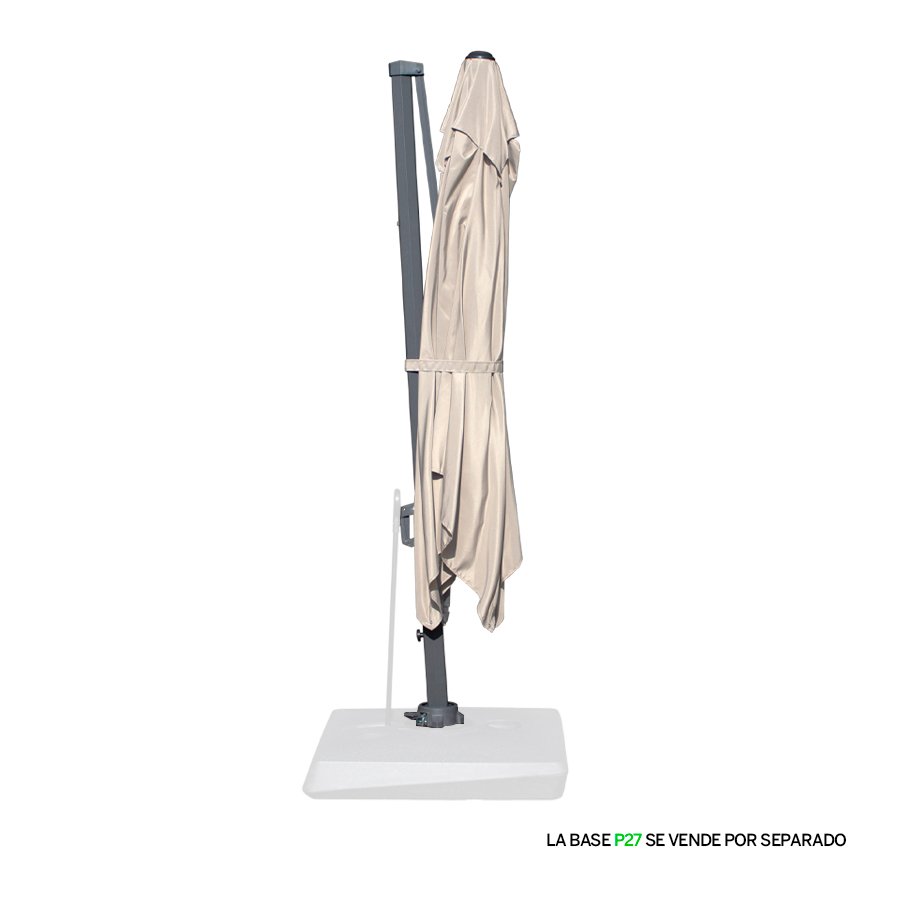 Quitasol lateral 3x3M (SKU P17) para regalos corporativos y campañas de empresa. Compatible con estrategias de regalos corporativos, incluyendo soluciones en textil, sublimación y DTF. Quitasol lateral cuadrado de 3x3m, con 4 cascos de lona Poliéster UV impermeable de 200g. Contiene asta de Aluminio de 80x50mm x 2.47m de altura y 8 varas de acero. Sistema de apertura manual con regulación de altura y ángulo para sombra. Sistema manual de rotación 360°. La base P27 es necesaria si no se quiere anclar este quitasol al suelo. La base P27 se vende por separado. •Tamaño: 3x3 m (abierto) x Alto 2.65 m (centro) / 2.3m (laterales) • Peso: 22 kg • Colores: Beige (09). • Sugerencia de Impresión: Serigrafía. • Material: Alumi… Cotiza formato corporativo con personalización de logo y cobertura en Chile.