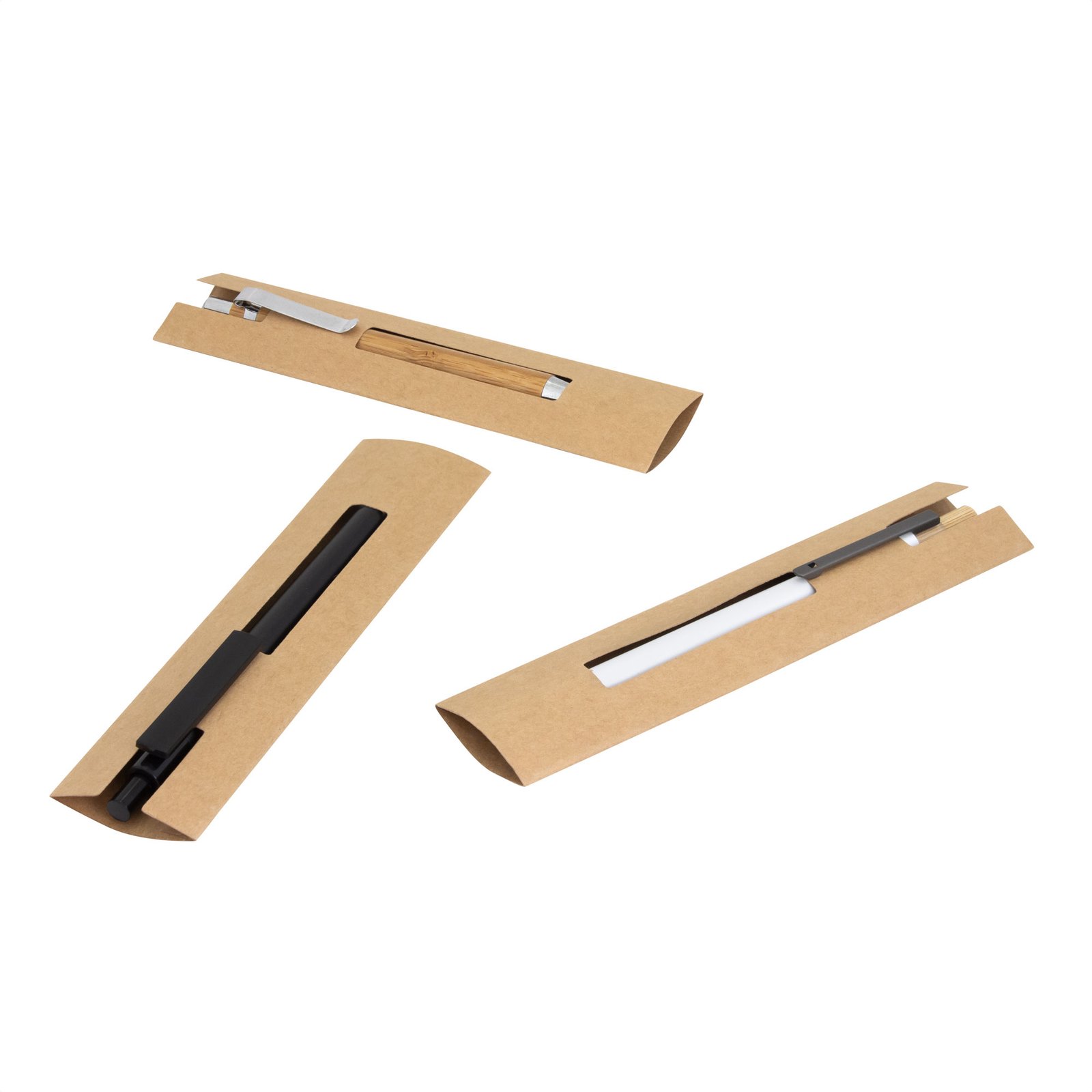 Estuche "MANGA" (SKU BP313) para regalos corporativos y campañas de empresa. Compatible con estrategias de regalos corporativos, incluyendo soluciones en textil, sublimación y DTF. Eleva tu obsequio de lo simple a lo sofisticado.Funda para bolígrafos con extremo abierto y ventana.Medidas: 4 x 15,3 cm. Materiales: Papel kraft de 250 g. aprox. Cotiza formato corporativo con personalización de logo y cobertura en Chile.