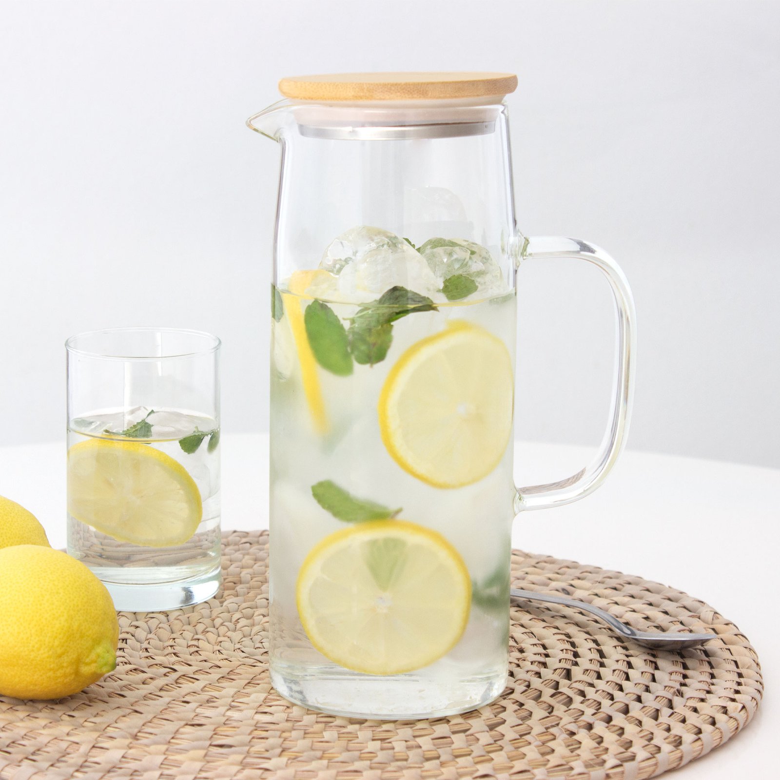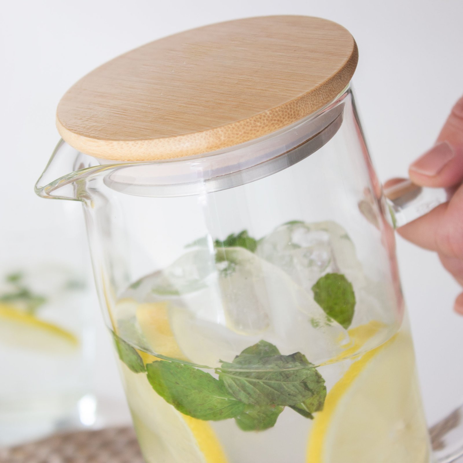 Jarra con tapa "BAMBJUG" (SKU T656) para regalos corporativos y campañas de empresa. Compatible con estrategias de regalos corporativos, incluyendo soluciones en textil, sublimación y DTF. Ø 8,8 x 22,8 cm. Capacidad 1100 ml. Vidrio de borosilicato y bambú. Jarra con pico vertedor y asa de vidrio de borosilicato. Tapa de bambú y acero inoxidable 304 con anillo de silicona antiderrame. Presentación en caja de regalo kraft. Cotiza formato corporativo con personalización de logo y cobertura en Chile.