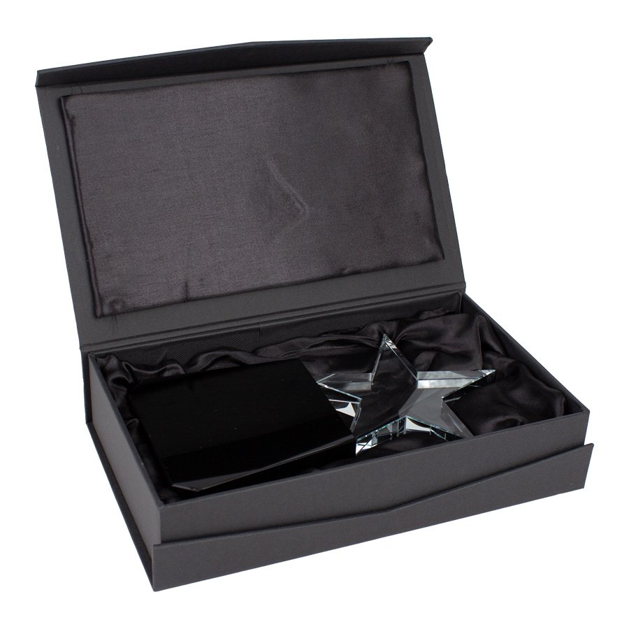 Trofeo Galvano de Cristal "Biondi" (SKU A77) para regalos corporativos y campañas de empresa. Prioridad comercial en líneas de textil, sublimación y DTF para branding corporativo. Elegante Trofeo modelo "Biondi", base de cristal negro y estrella de cristal en su parte superior. Presentación en caja de cartón forrado negro con cierre imantado, interior acolchado de espuma y tela poliéster satinado negro, con troquel. Cotiza formato corporativo con personalización de logo y cobertura en Chile.