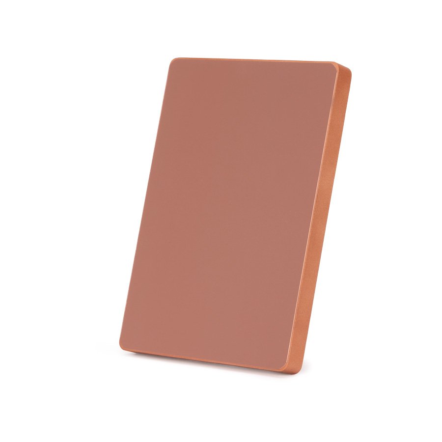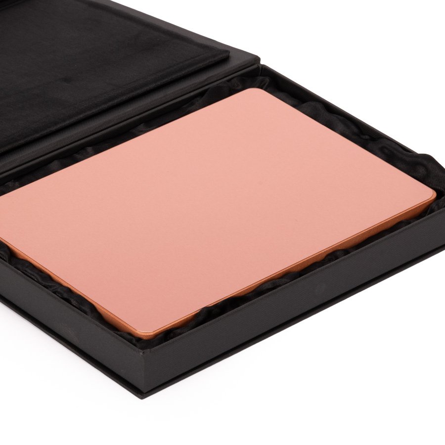 Placa Galvano encobrizado "BLOCK" (SKU A97) para regalos corporativos y campañas de empresa. Prioridad comercial en líneas de textil, sublimación y DTF para branding corporativo. Placa metálica color cobre, modelo "BLOCK", montada sobre base rectangular de madera enchapada con esquinas redondeadas. En su parte posterior, incluye orificios y soporte metálico para exhibición vertical u horizontal. Presentación en caja de cartón forrado negro con cierre imantado, interior acolchado de espuma y tela poliéster satinado negro, con troquel. OJO: la placa metálica viene con film plástico removible, para protección de la misma. •Tamaño: Placa: 23.9 x 16.8 cm. / Galvano: 24.1 x 17.1 x 1.9 cm. / Caja: 28 x 21 x 3.5 cm.… Cotiza formato corporativo con personalización de logo y cobertura en Chile.