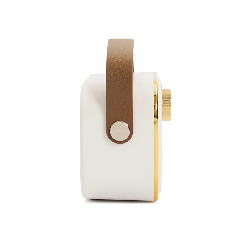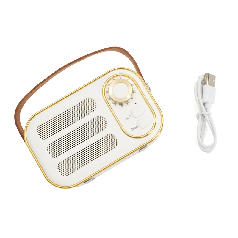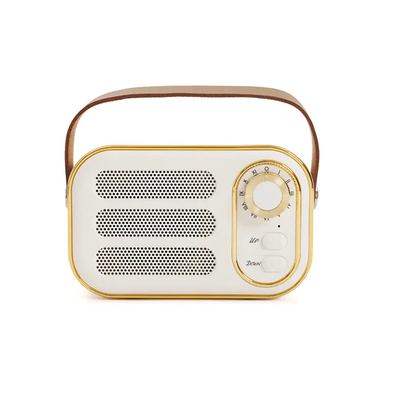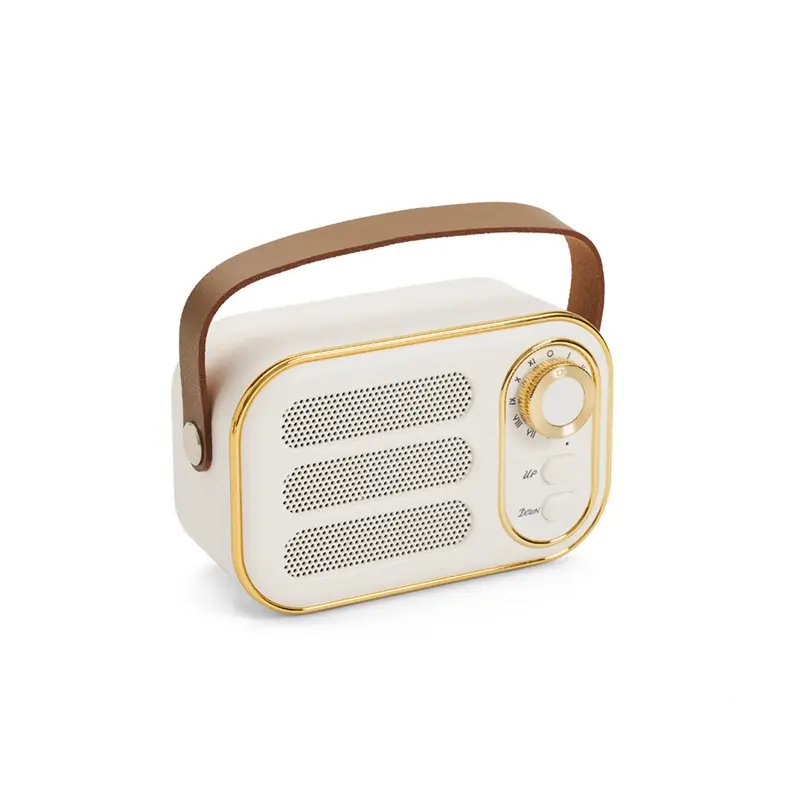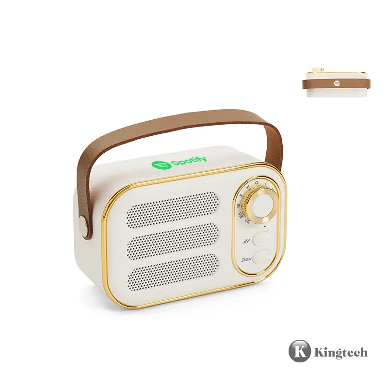 Parlante Vintage (SKU 444) para regalos corporativos y campañas de empresa. Compatible con estrategias de regalos corporativos, incluyendo soluciones en textil, sublimación y DTF. Parlante vintage blanco con correa. Hecho de plástico ABS y cuero PU. Cuenta con correa superior, perilla frontal, botones de control, conexión USB-C, radio FM (87.5–108 MHz), y compatibilidad con Bluetooth, tarjeta TF, USB y entrada AUX. Es ideal para ambientar espacios con estilo retro mientras disfrutás de tu música favorita. KingTech Cotiza formato corporativo con personalización de logo y cobertura en Chile.