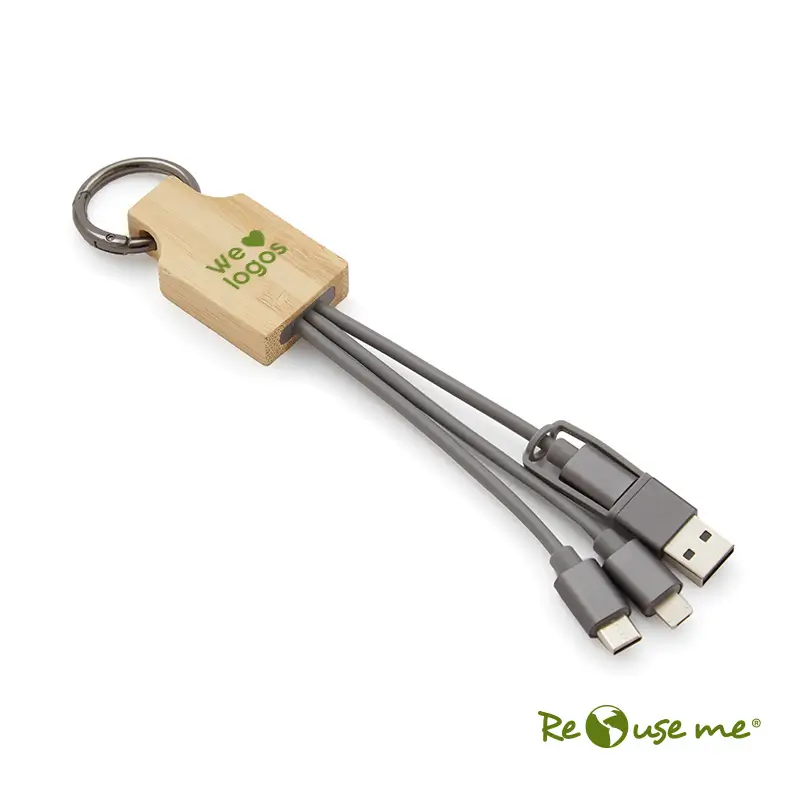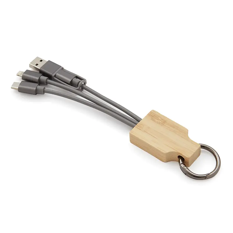 Cable 3 en 1 Ryze (SKU 308) para regalos corporativos y campañas de empresa. Compatible con estrategias de regalos corporativos, incluyendo soluciones en textil, sublimación y DTF. Cable 3 en 1 color gris, con una longitud de 12 cm. Es el accesorio perfecto para mantener tus dispositivos siempre cargados y listos para usar. Incluye cable de entrada TIPO C con adaptador USB A y 2 cables de salida MICRO B / LIGHTING, lo que te permite cargar dispositivos con diferentes tipos de entradas. Cuenta con un accesorio rectangular de bamboo de donde salen los cables y un gancho de aluminio en tono con los cables. ReUseMe. Cotiza formato corporativo con personalización de logo y cobertura en Chile.