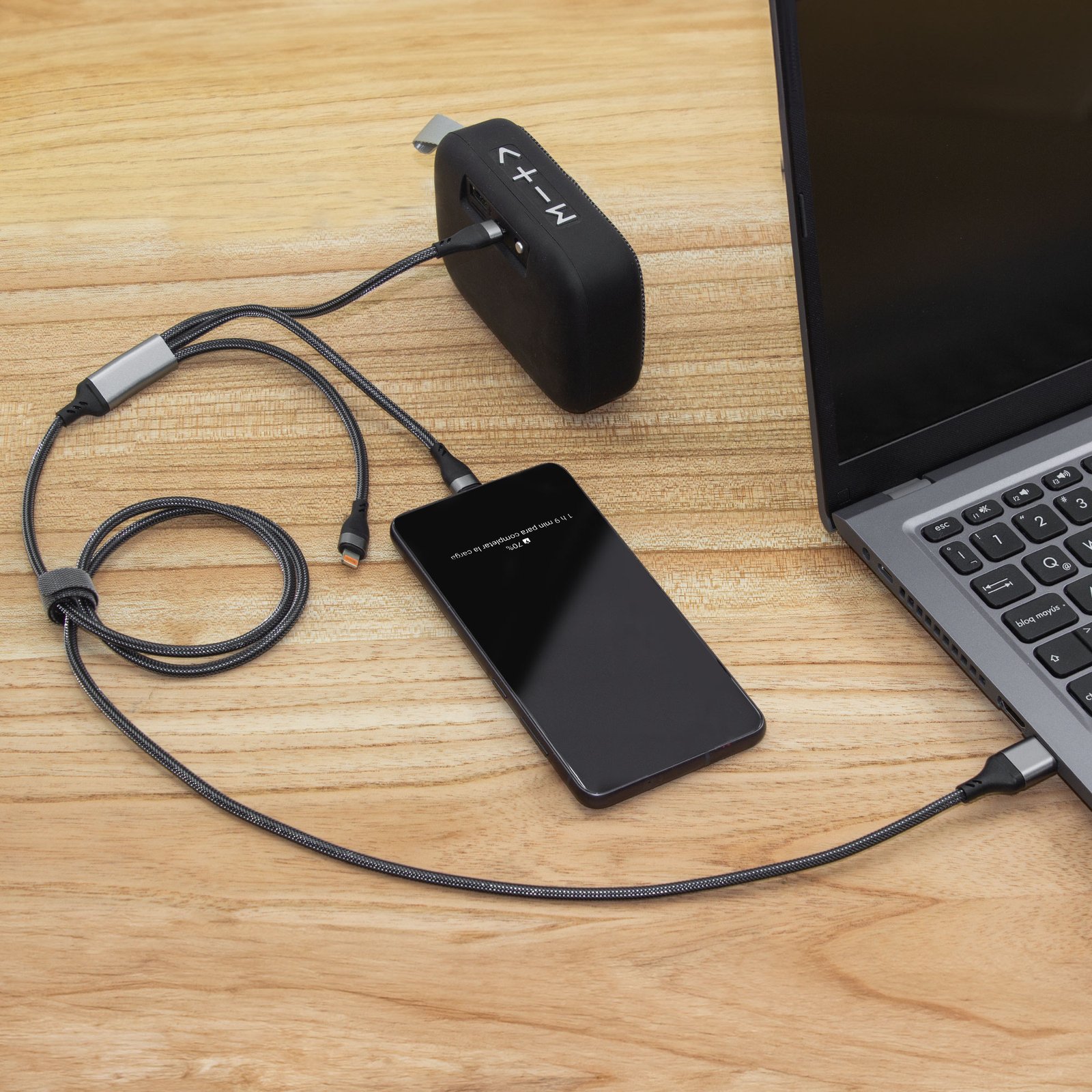 cable de carga rápida "SPIDY" (SKU EC773) para regalos corporativos y campañas de empresa. Prioridad comercial en líneas de textil, sublimación y DTF para branding corporativo. Carga al instante, vive sin límites.Cable de carga rápida. Entrada 2 en 1: USB y USB-C. Salida: USB-C, microUSB y lightning. Max 20V 3A. Color gun con toques naranjas en cada conector. Precinto de velcro fijada al cable. Medidas: 120 cm. (extendido). Materiales: Cobre, PVC y tela. Presentación: en caja de regalo Kraft. Cotiza formato corporativo con personalización de logo y cobertura en Chile.