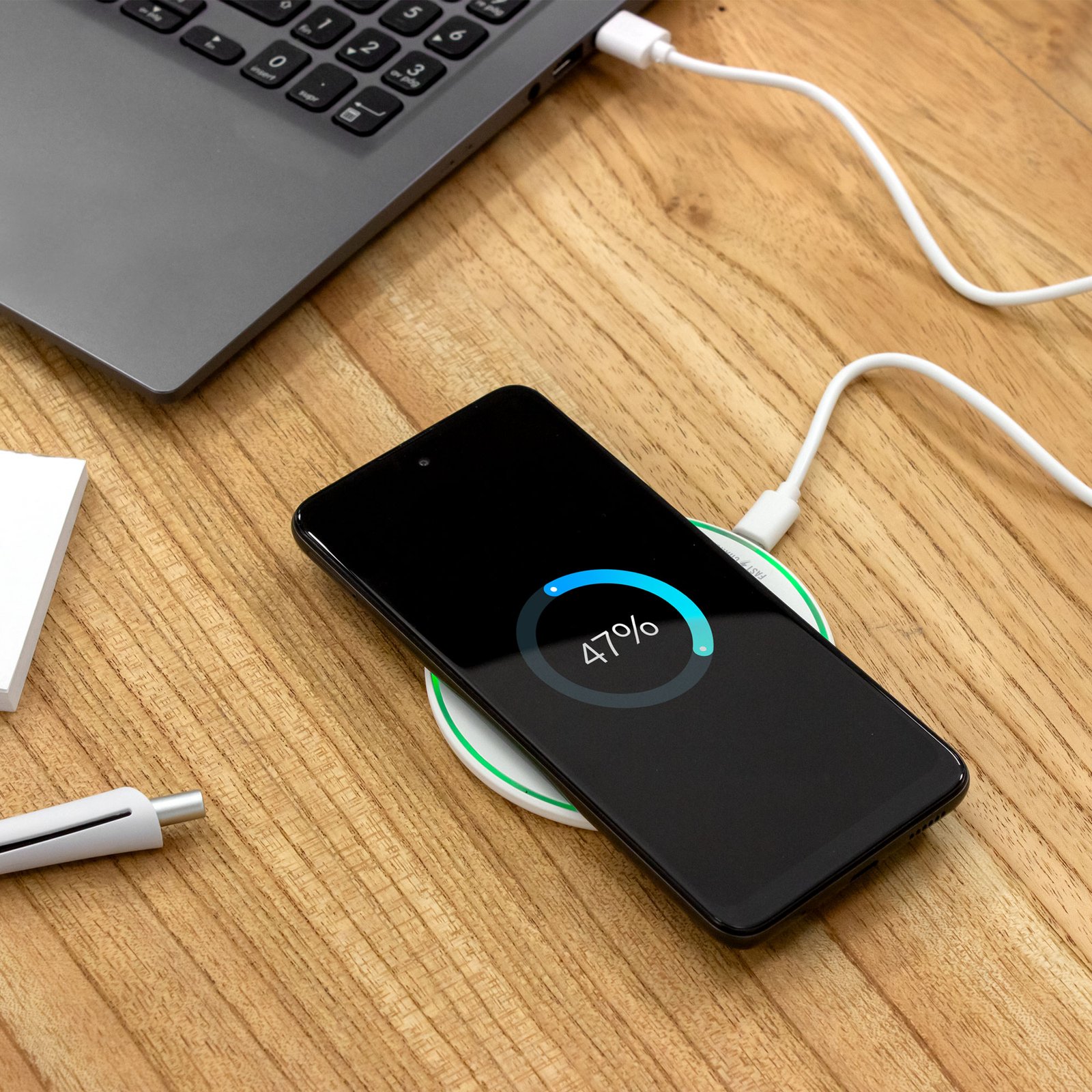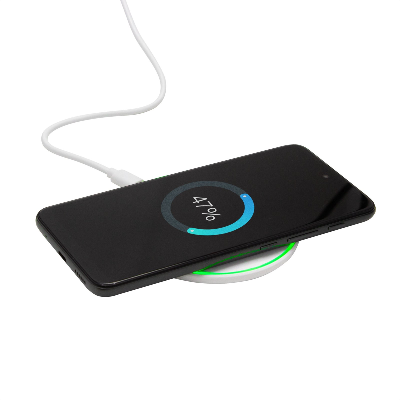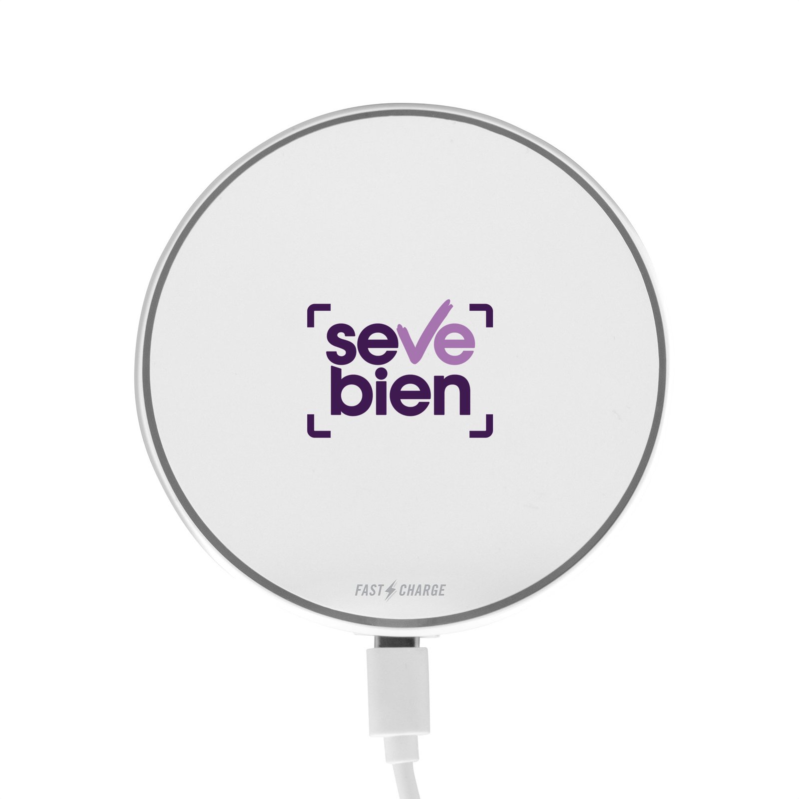 Cargador inalámbrico "DISCO" (SKU EC767) para regalos corporativos y campañas de empresa. Compatible con estrategias de regalos corporativos, incluyendo soluciones en textil, sublimación y DTF. Mantente siempre conectadoCargador inalámbrico con luz. Base plástica color blanco con antideslizantes. CARGA RÁPIDA. Salida: 15 watts. Luces indicadoras de carga. Cable de carga USB-C en color blanco de 50 cm de largo. Compatible exclusivamente con celulares que permitan carga inalámbrica (tecnología qi). Medidas: Ø 9,7 x 0,9 cm. Material: Plástico ABS. Presentación: en caja de regalo kraft. Cotiza formato corporativo con personalización de logo y cobertura en Chile.