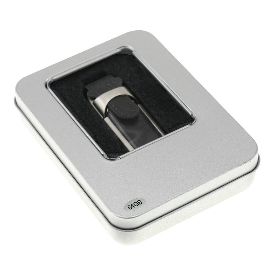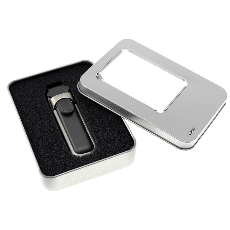 USB Pendrive 64GB de Eco-cuero (SKU C107) para regalos corporativos y campañas de empresa. Compatible con estrategias de regalos corporativos, incluyendo soluciones en textil, sublimación y DTF. USB Pendrive 2.0 memoria de 64GB, de Eco-cuero. Presentación en elegante estuche de aluminio con ventana, dentro de cuna de esponja EVA negra. •Pendrive: 8.6 x 2.5 x 1.7 cm / Estuche: 11.9 x 8.8 x 2.3 cm •Peso: 29g •Capacidad: 64 GB •Colores: Eco-cuero negro (08), Eco-cuero café (10). •Sugerencia de Impresión: Serigrafía, Grabado Láser. •Ancho Lanyard: •Presentación: Estuche de Aluminio con cuna de esponja EVA negra. •Material: Eco-cuero, Zinc Alloy, Aluminio. Cotiza formato corporativo con personalización de logo y cobertura en Chile.