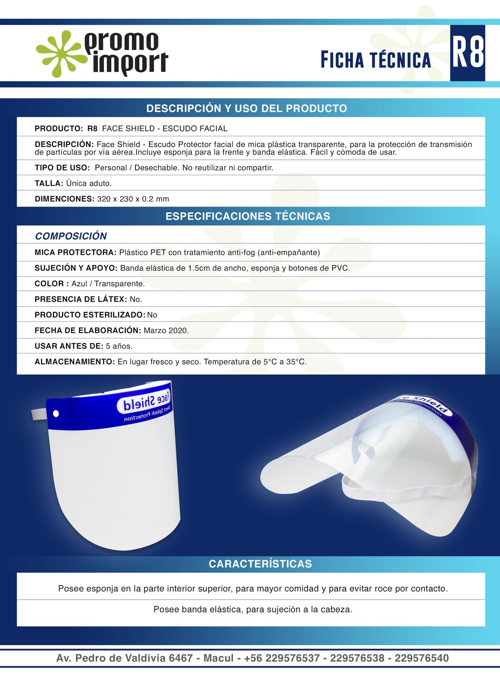 Set de 10 Face Shield - Escudo Facial (SKU R8) para regalos corporativos y campañas de empresa. Compatible con estrategias de regalos corporativos, incluyendo soluciones en textil, sublimación y DTF. Set (Bolsa) de 10 Face Shield - Escudo Protector Facial de mica plástica transparente para la protección de transmisión de partículas por vía aérea. Incluye esponja para la frente y banda elástica. Fácil y cómoda de usar. OFERTA: HASTA AGOTAR STOCK • Tamaño: 32 x 34 X 3.5 cm • Importante: UNIDAD DE VENTA ES EL SET (BOLSA) CON 10 ESCUDOS FACIALES • Talla: Unica Adultos (XL) • Colores:Transparente (00) • Presentación: Bolsa con 10 Escudos Faciales (unidad de venta) • Material: Polietileno, Esponja. Cotiza formato corporativo con personalización de logo y cobertura en Chile.