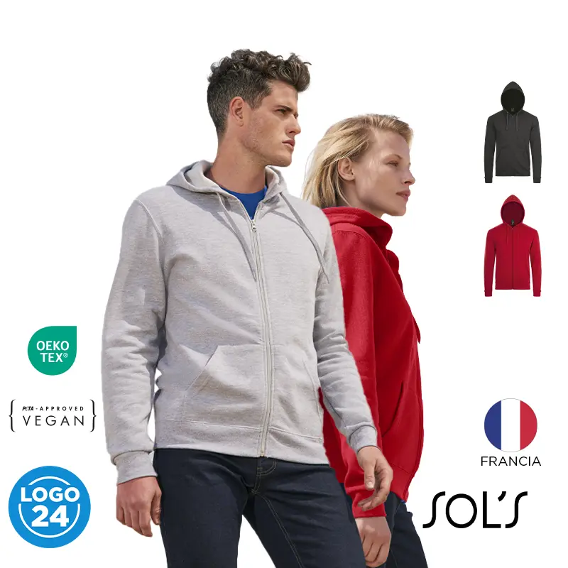 Polerón Stone (SKU 98) para regalos corporativos y campañas de empresa. Compatible con estrategias de regalos corporativos, incluyendo soluciones en textil, sublimación y DTF. Polerón de frisa 50% algodón y 50% poliéster de 260g con cierre y capucha unisex. CERTIFICACIÓN: PETA-Approved Vegan. RECOMENDACIONES DE USO: Lavar a máquina a 30°. No lavar en seco. No blanquear. No planchar. No secar en máquina. Sol´s. Cotiza formato corporativo con personalización de logo y cobertura en Chile.